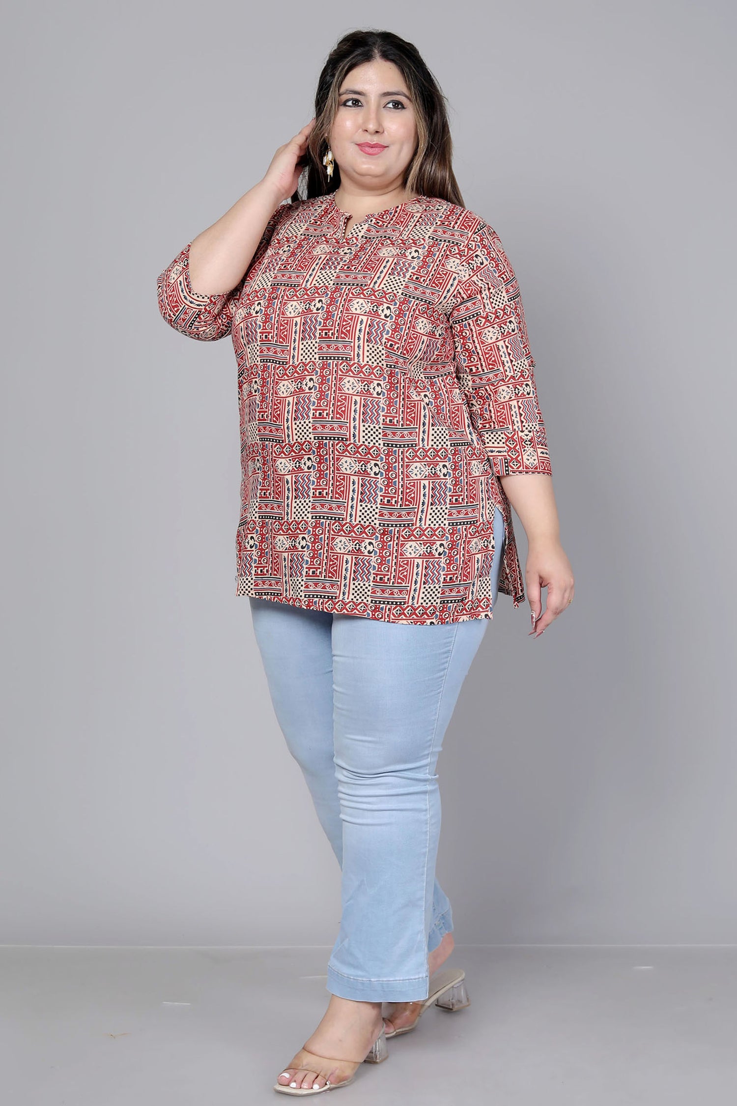 TRIBAL GEOMETRIC PRINT COTTON TOP IN RUST/BEIGE COLOUR BY PLUSSIZEKURTI