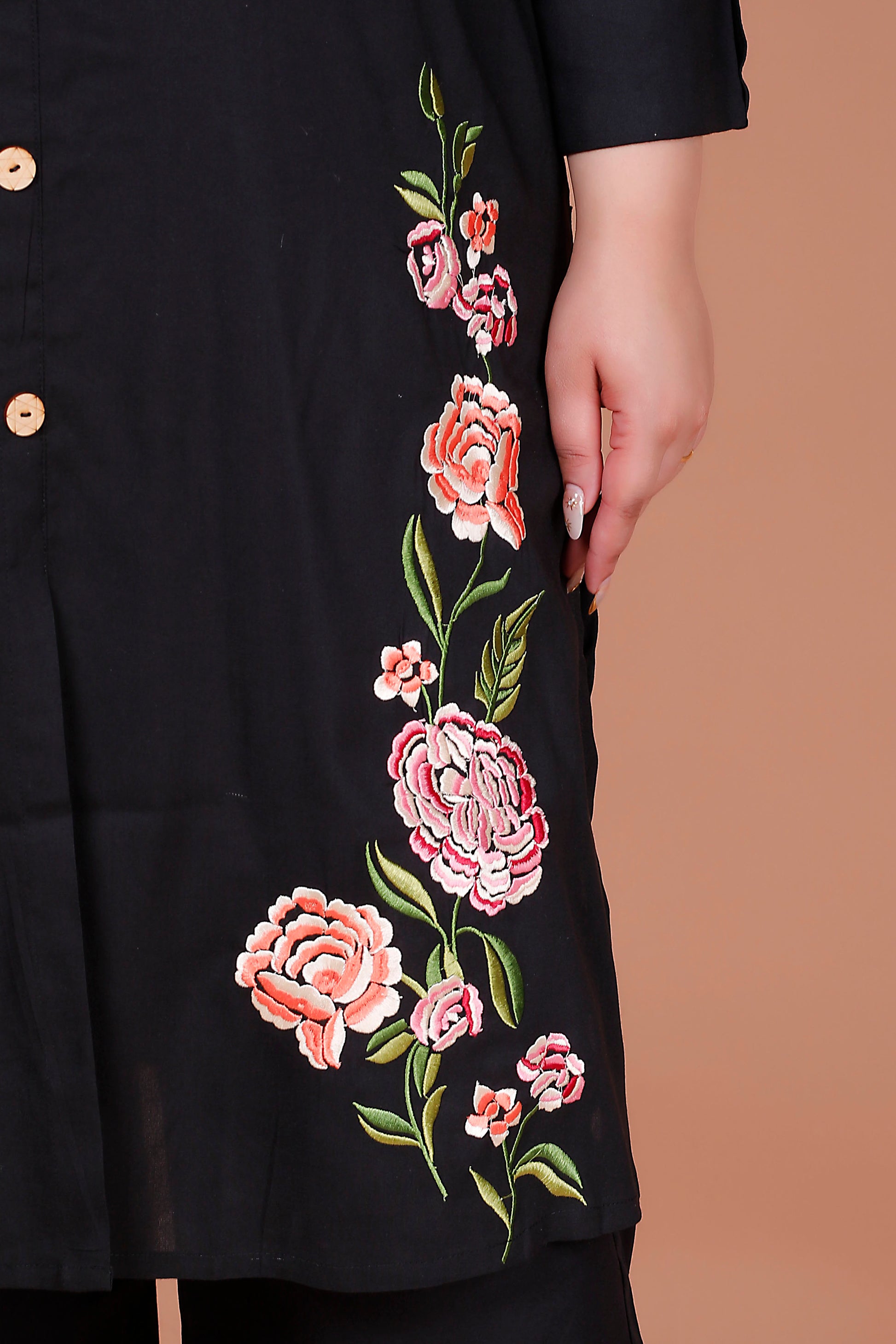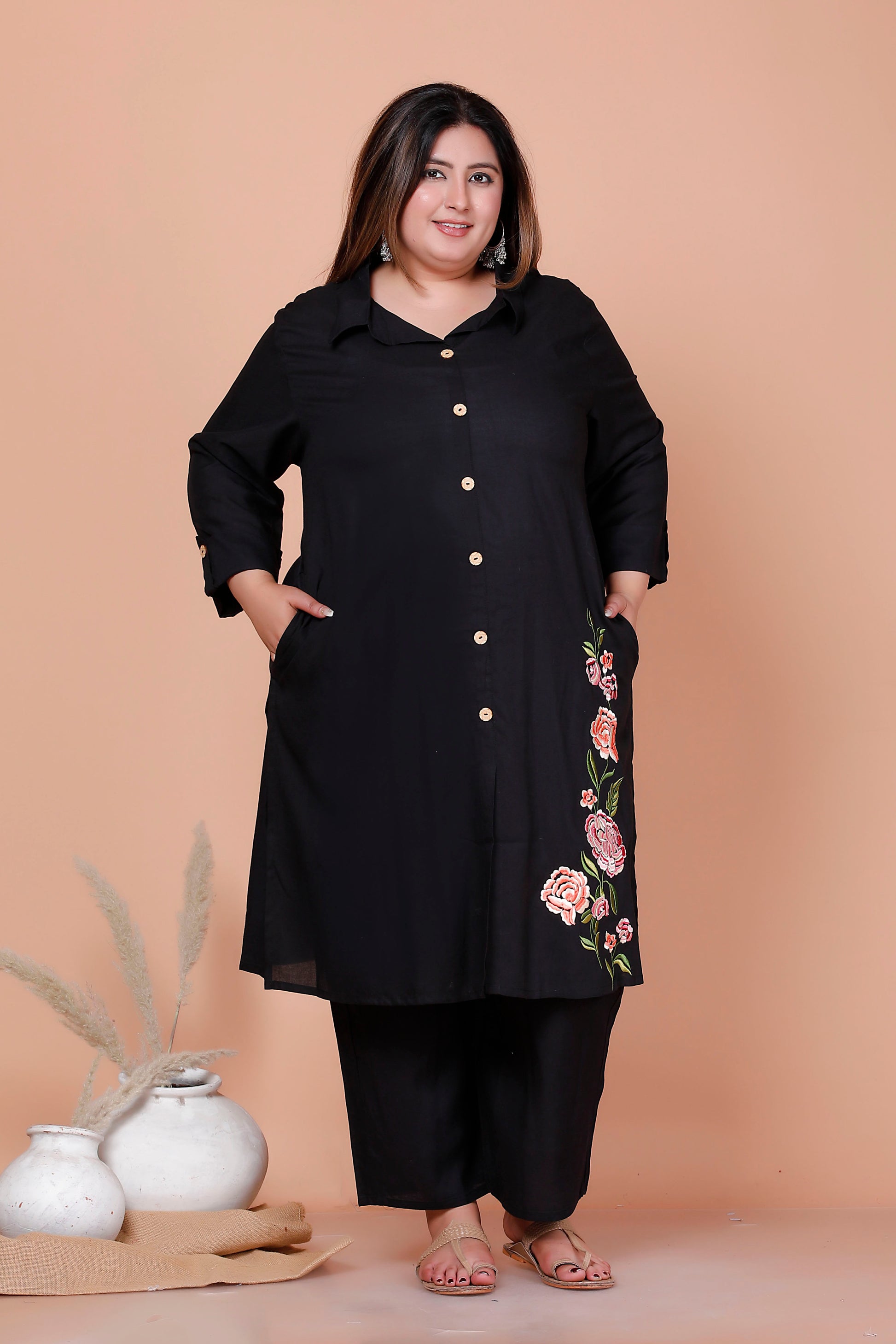 SOLID FLORAL PANEL EMBROIDERY COTTON 2 PEICE KURTA PANT IN BLACK BY PLUSSIZEKURTI