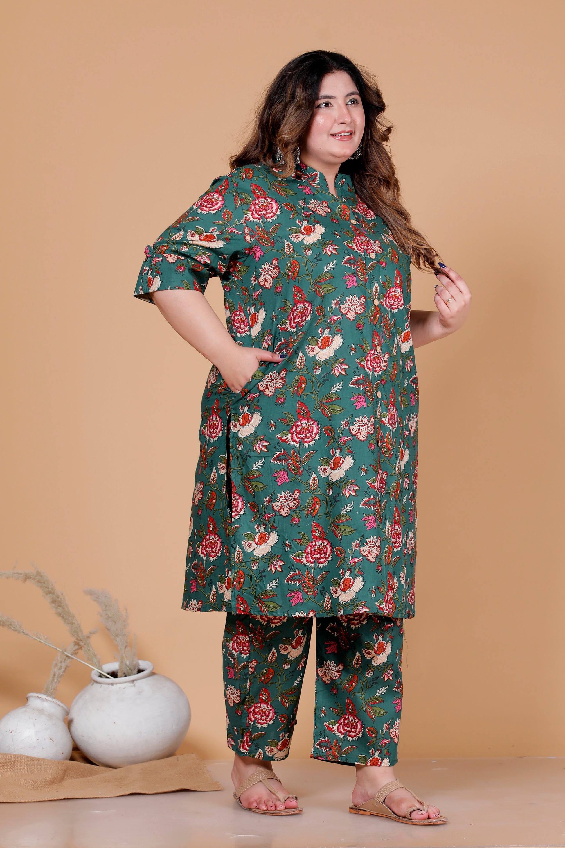 VINTAGE FLORAL VINE PRINT COTTON 2 PEICE KURTA PANT IN DEEP GREEN BY PLUSSIZEKURTI