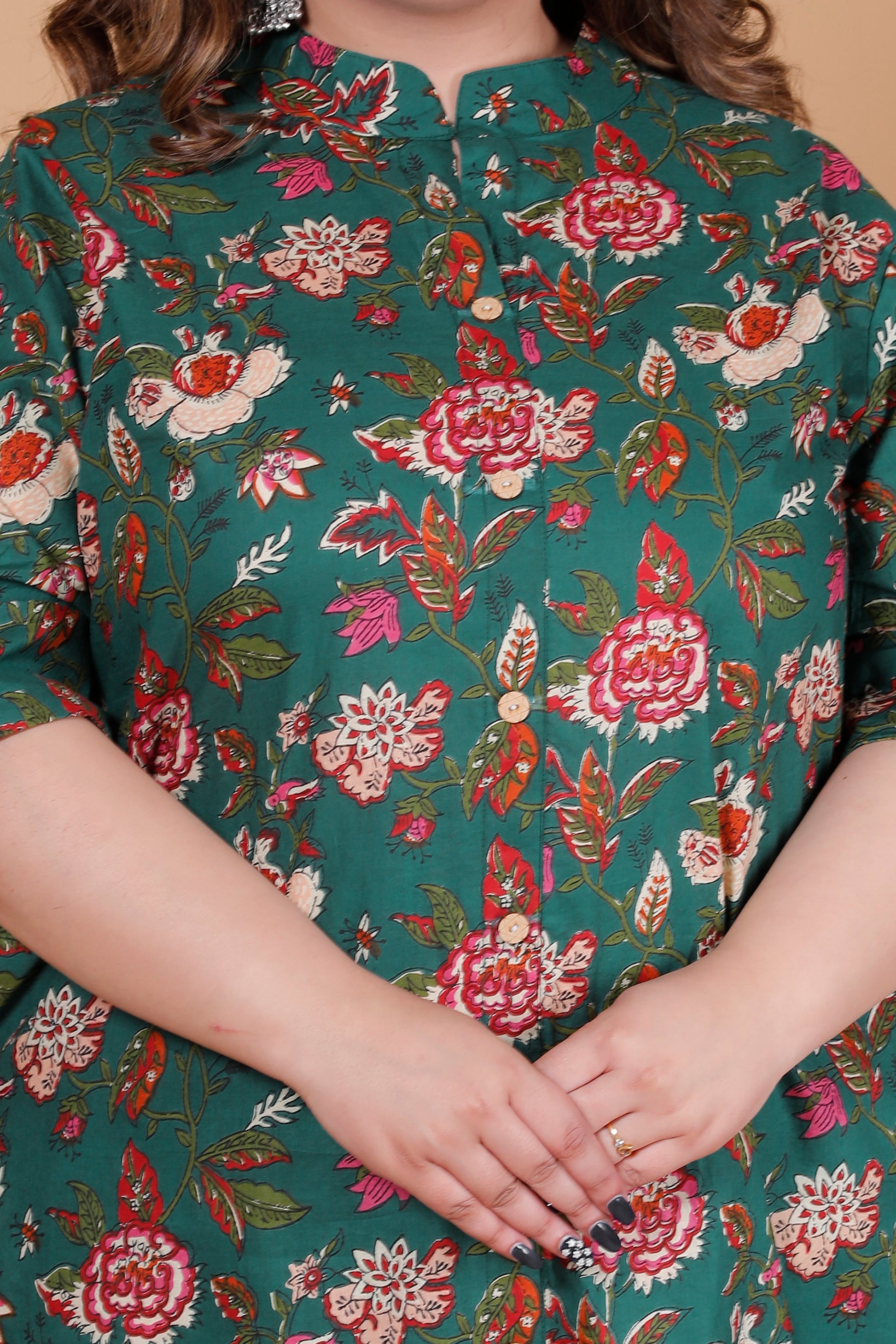 Refresh your everyday wardrobe with this elegant floral cotton kurti pant set, designed for effortless comfort and timeless style. The rich green base paired with multicolour floral motifs creates a graceful look perfect for daily wear.