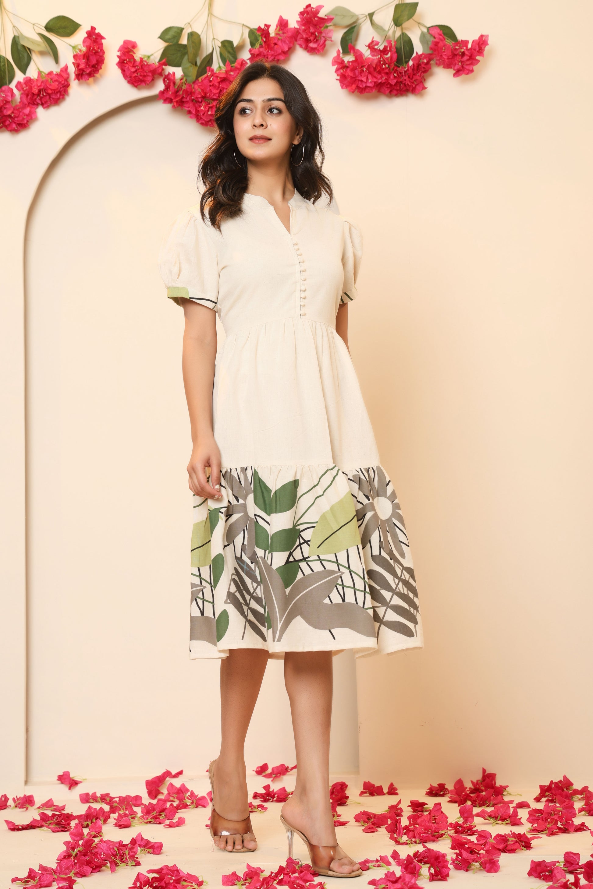 LEAFY FLORAL PRINT A-LINE COTTON FLEX DRESS IN BEIGE BY PLUSSIZEKURTI