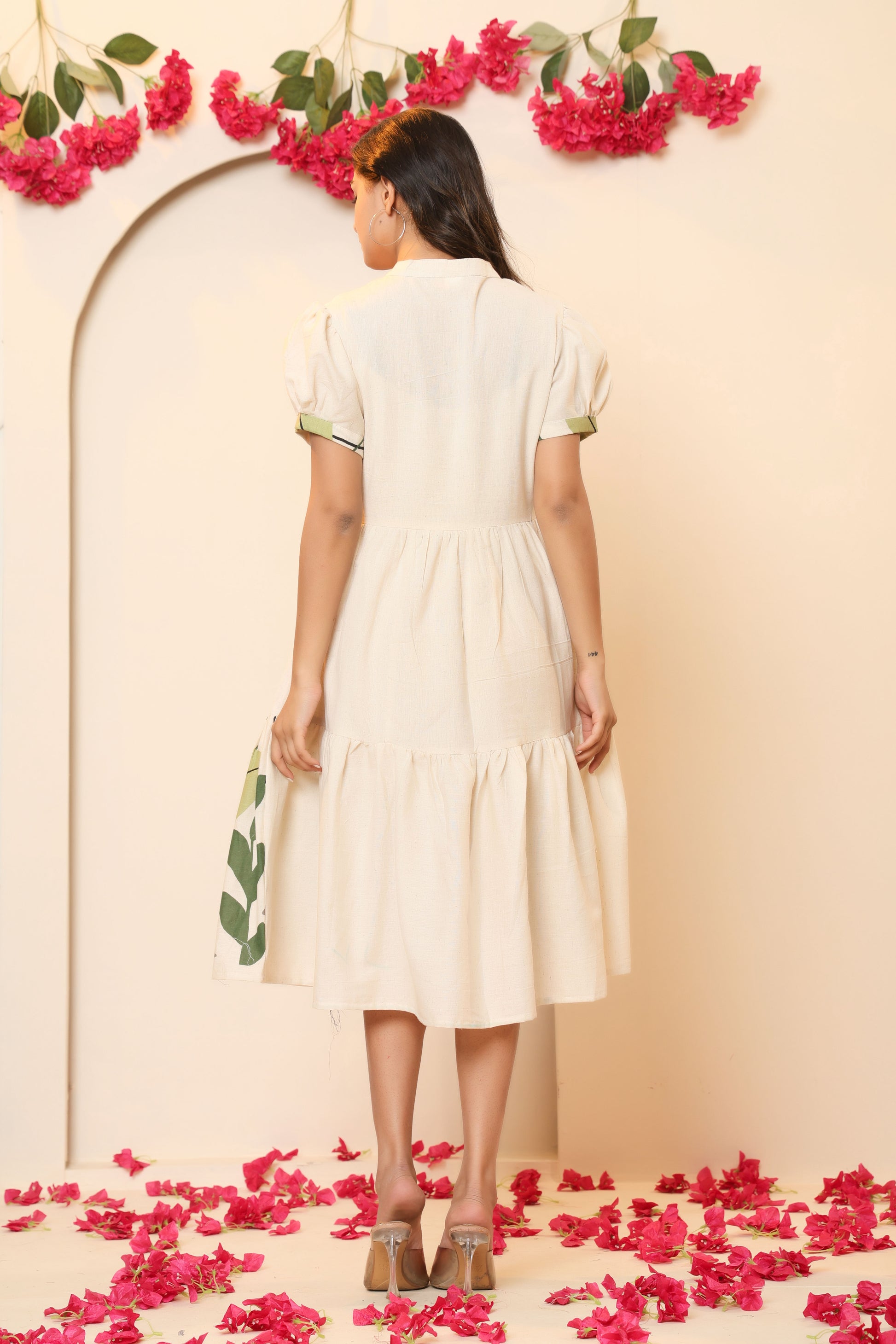 Pattern/Style: A-line flared dress with empire waist and button-down detailing on the bodice
