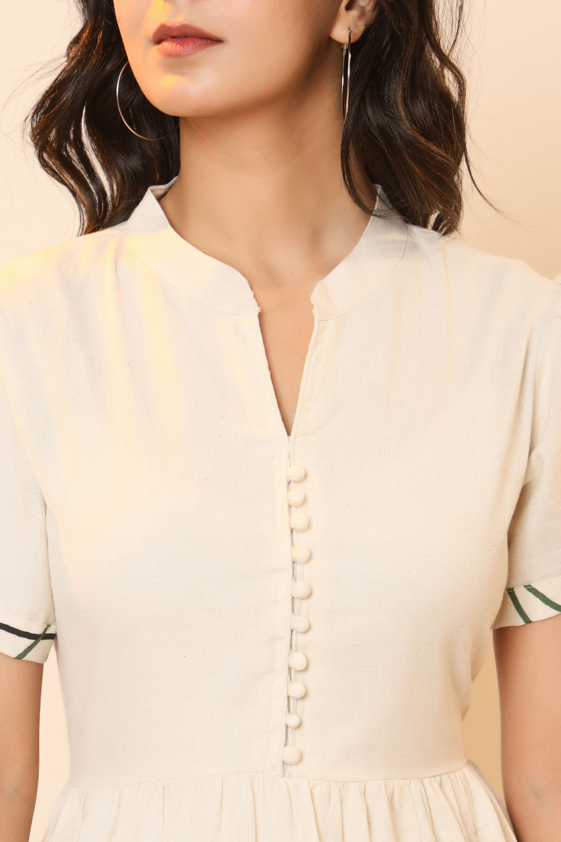 Collar/Neckline: Band-style collar with knot work on neckline
