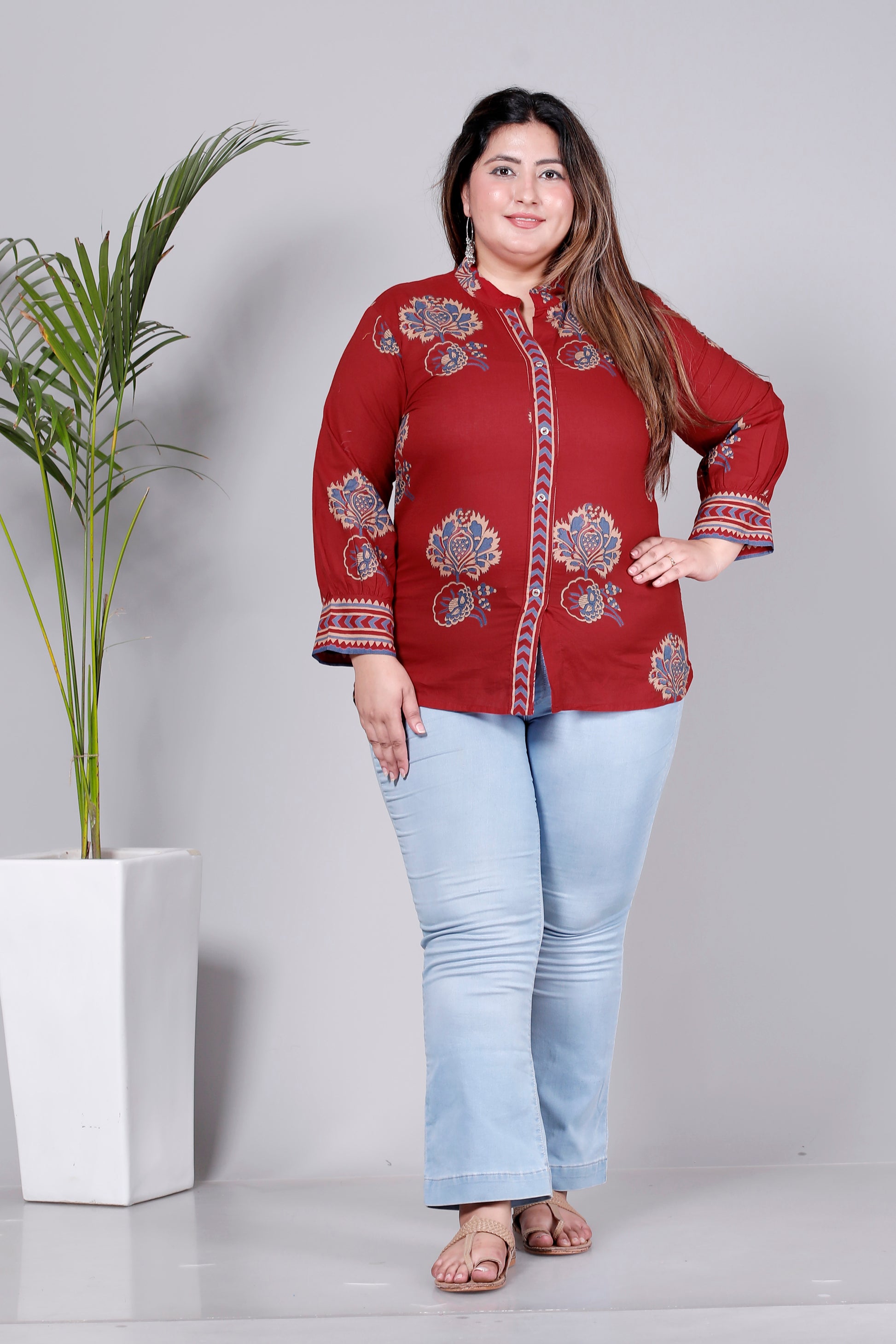 MUGAL BUTTA GEOMETRIC PRINT COTTON TOP IN CHERRY RED/BLUE COLOUR BY PLUSSIZEKURTI
