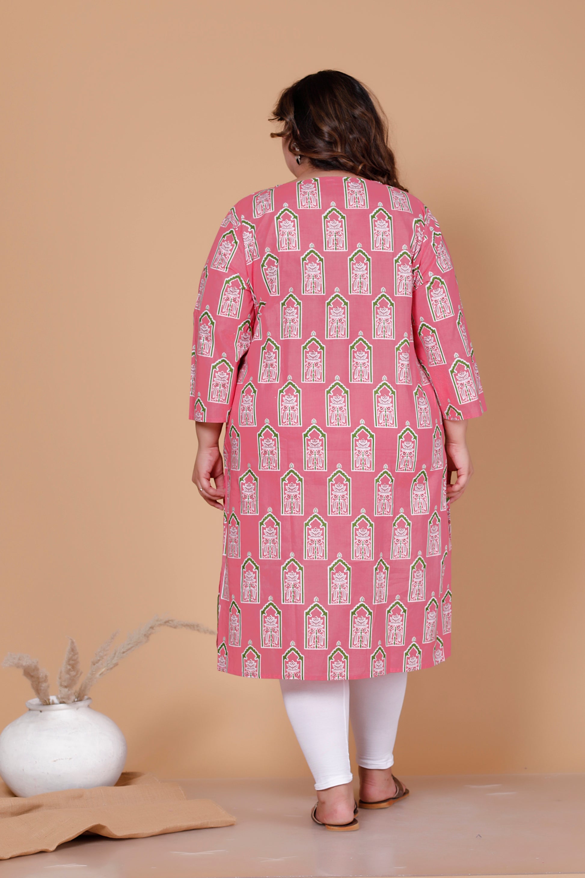 ARCH BLOCK PRINT COTTON KURTI IN FRESH PEACH PINK BY PLUSSIZEKURTI