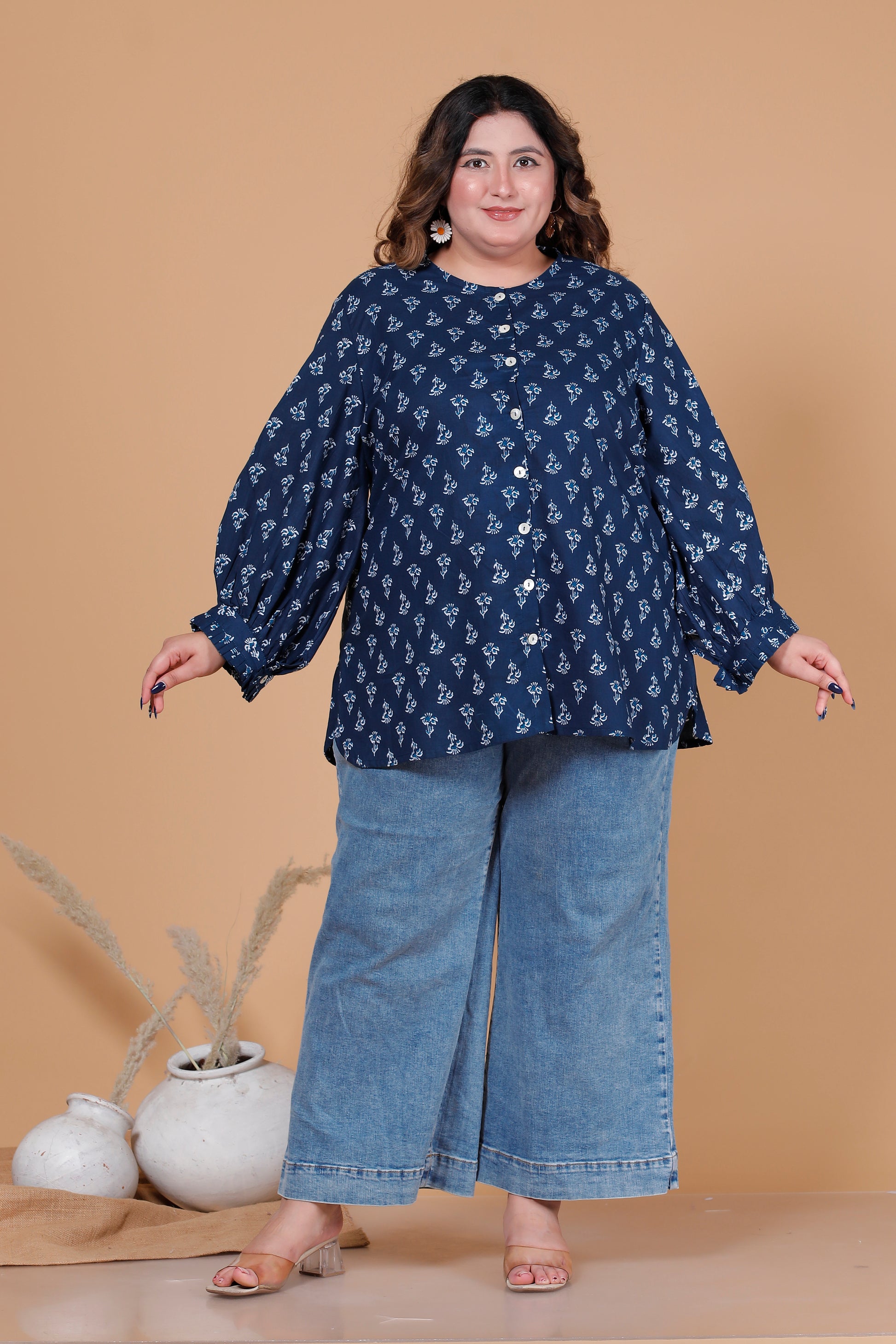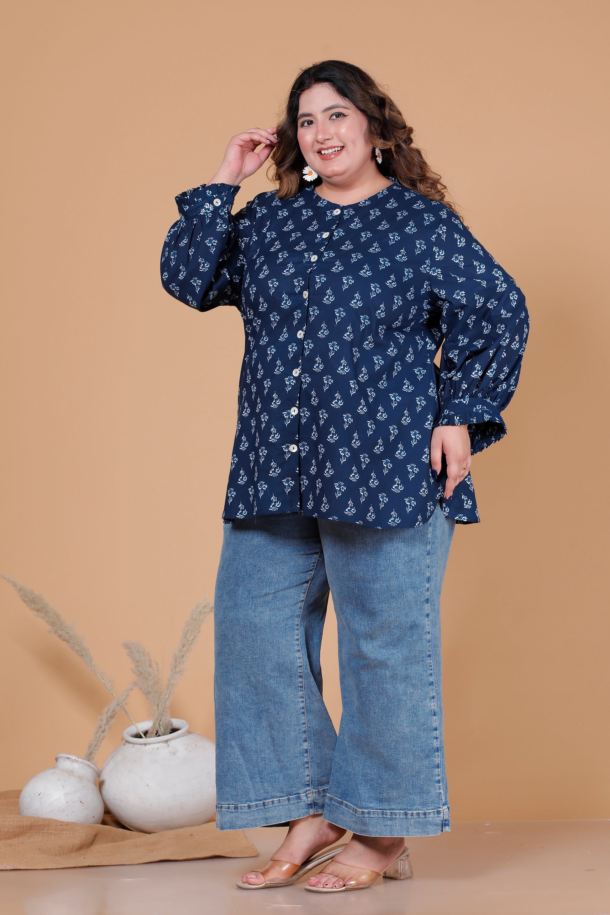 FLORAL BUTI PRINT COTTON SHIRT TOP IN NAVY BLUE COLOUR BY PLUSSIZEKURTI