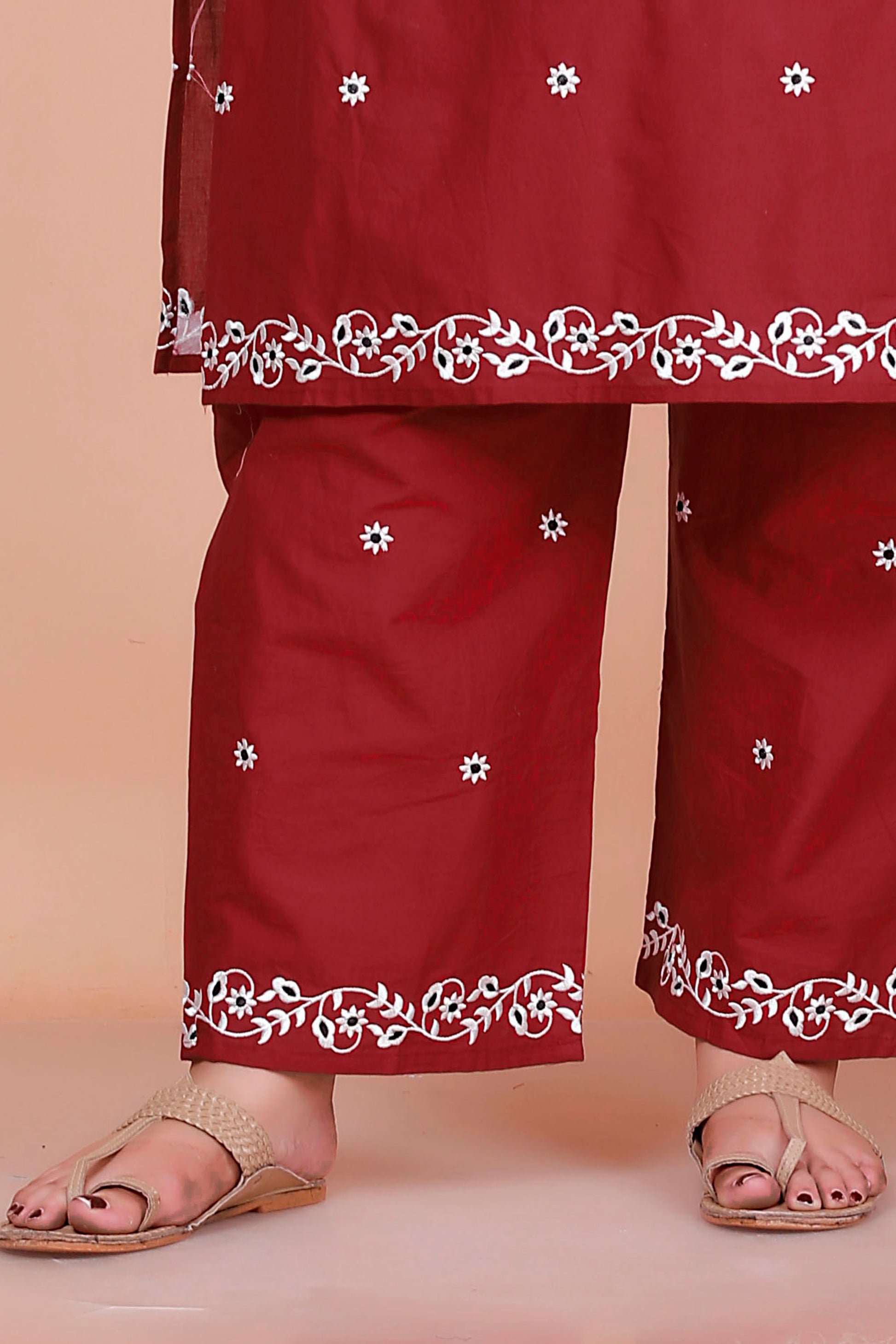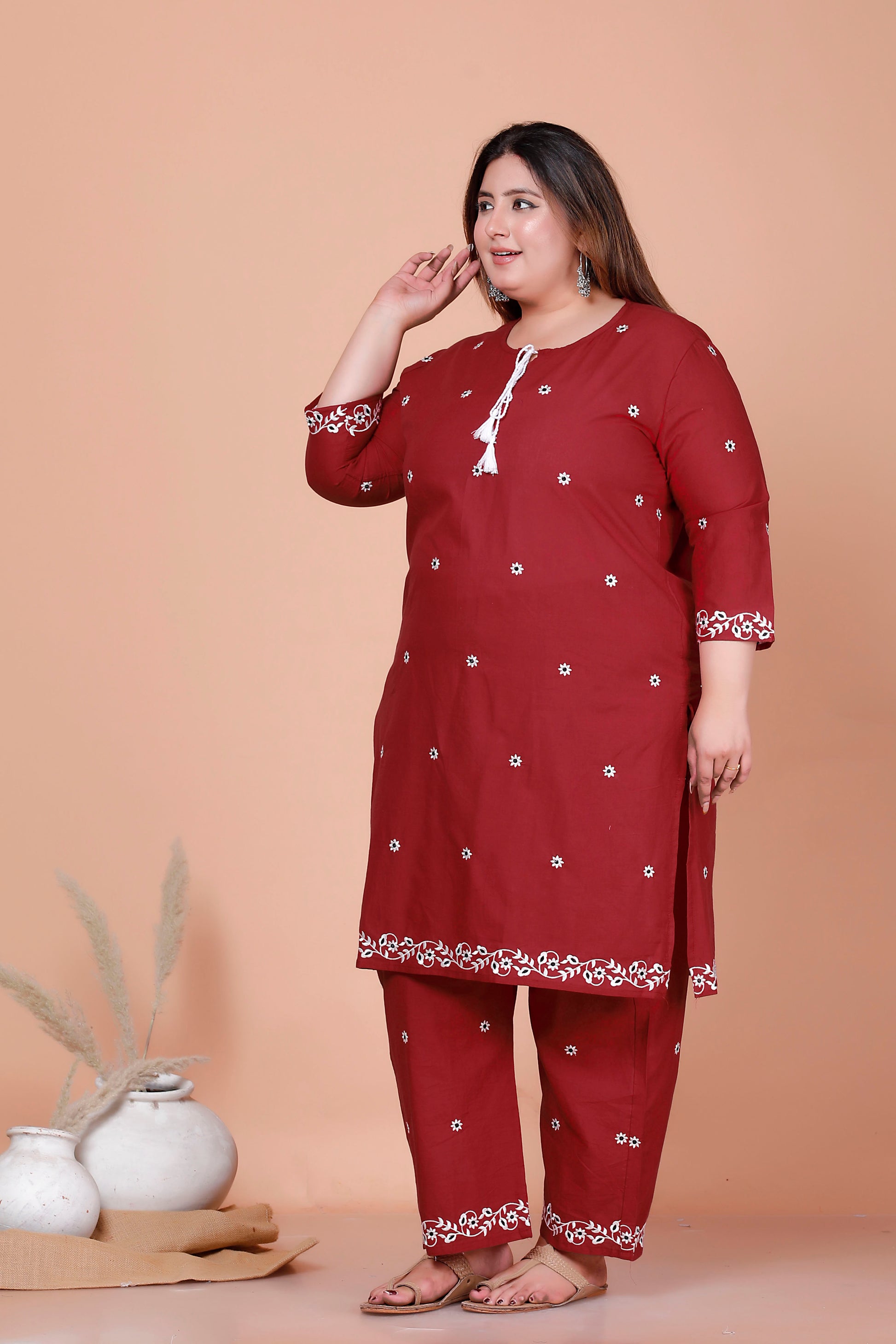 FLORAL EMBROIDERY BUTTI COTTON 2 PEICE KURTA PANT IN MAHROON BY PLUSSIZEKURTI