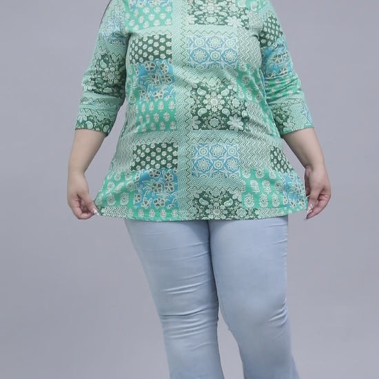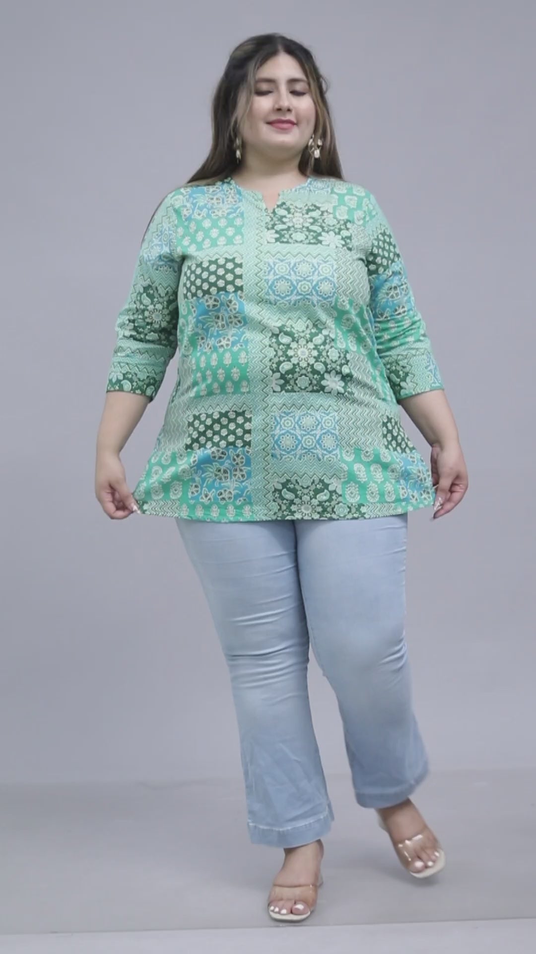 Key Features: Patchwork geometric floral print | Aqua blue & green mix | Round neckline with slit detail | Top length 32" | 3/4 sleeves | Cotton comfort