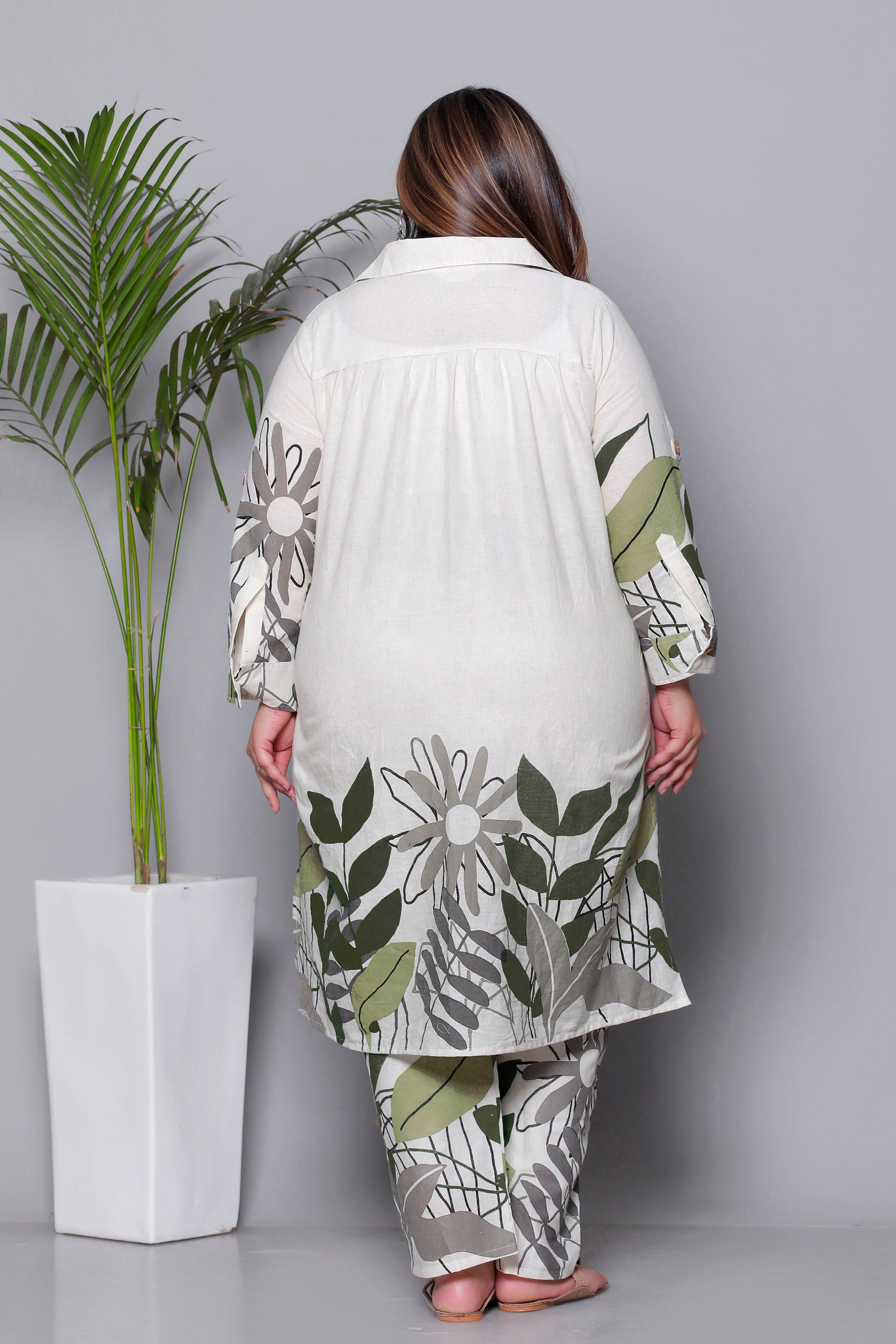 FLORAL LEAF HAND PAINTED PRINT COTTON FLEX 2 PEICE KURTA PANT IN GREEN BY PLUSSIZEKURTI