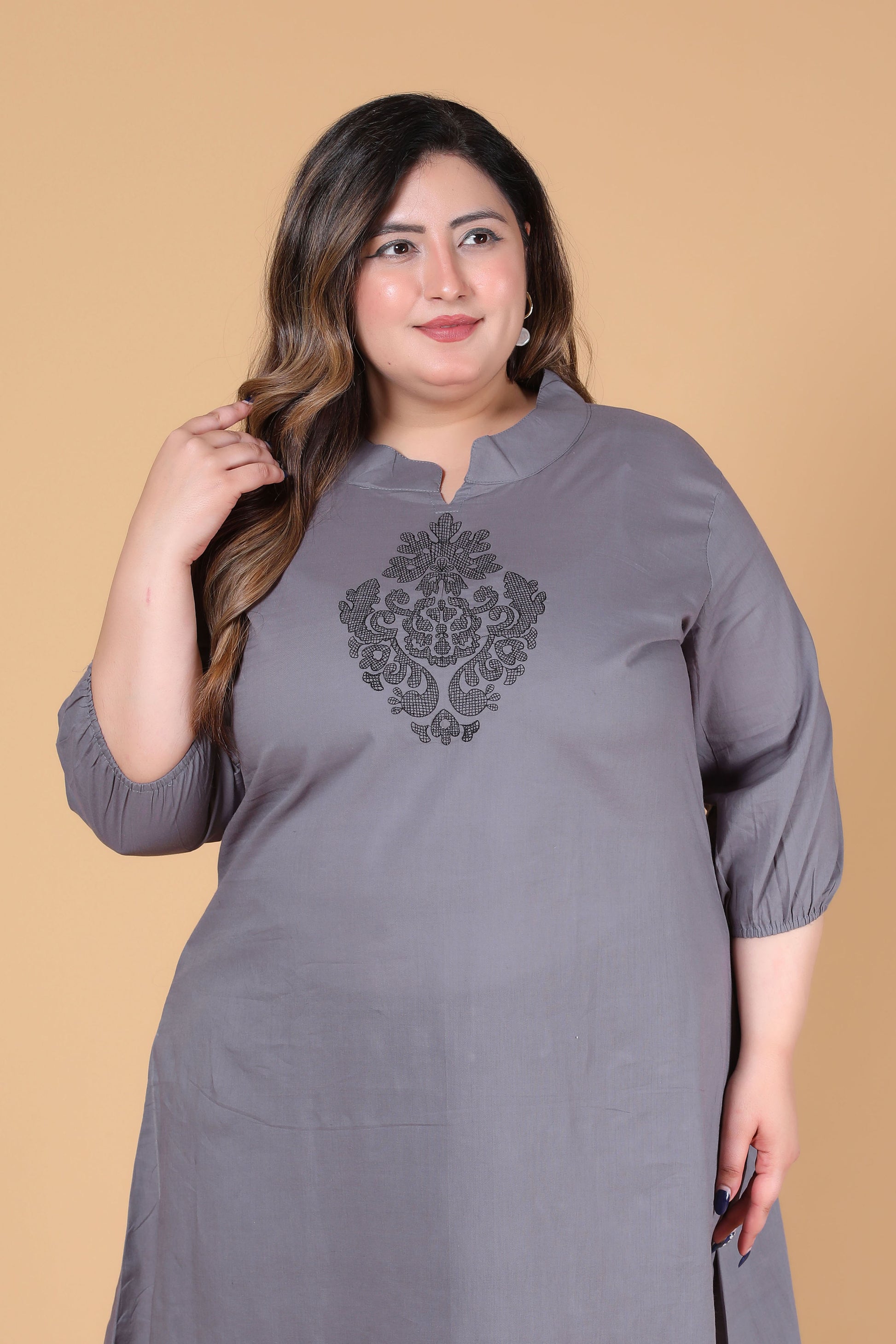SOLID ALINE EMBROIDERY COTTON 2 PEICE KURTA PANT IN GREY BY PLUSSIZEKURTI