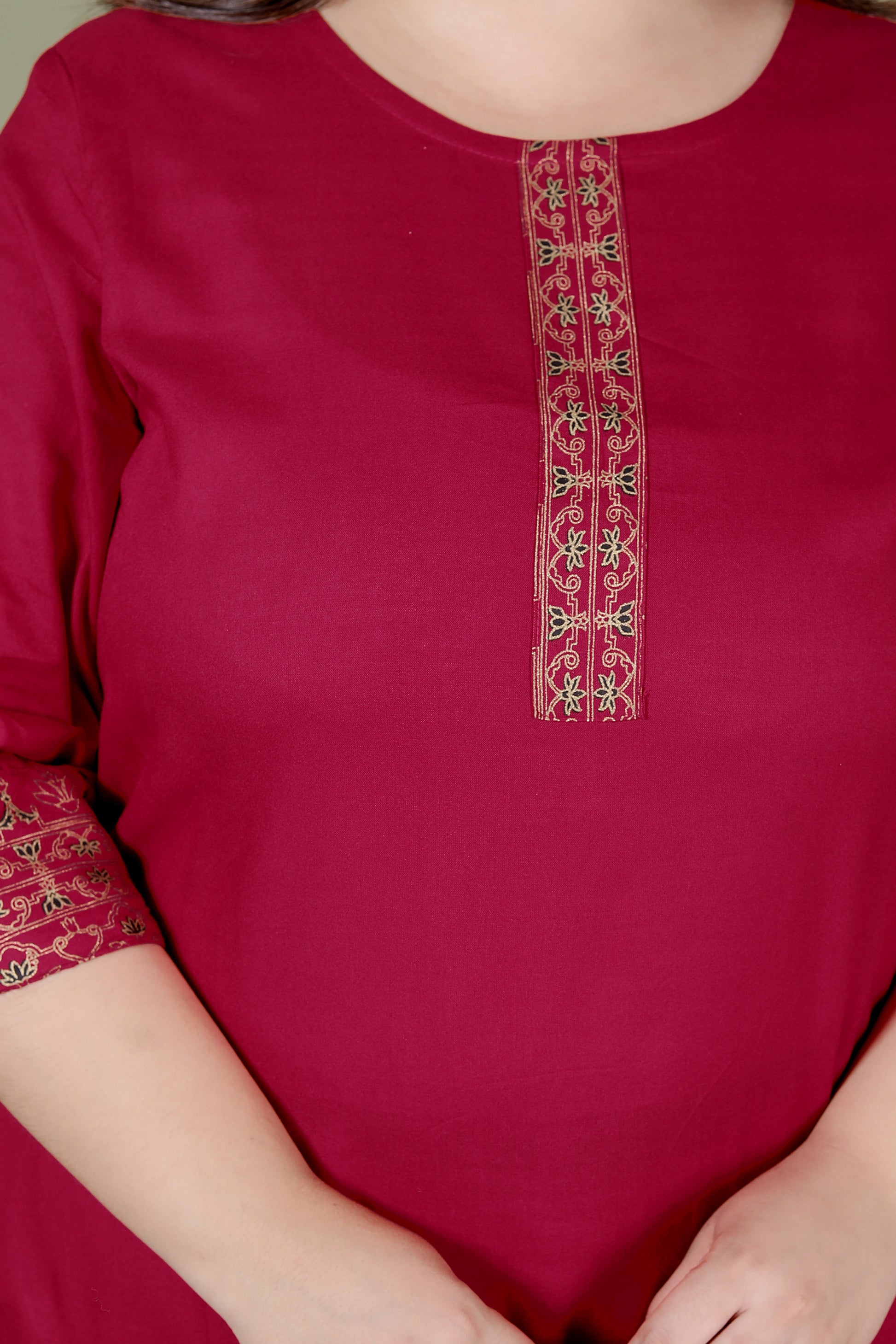 Kurti: Solid wine maroon base with golden ethnic foil detailing on neckline & sleeves, round neckline, 3/4 sleeves, length – 46"