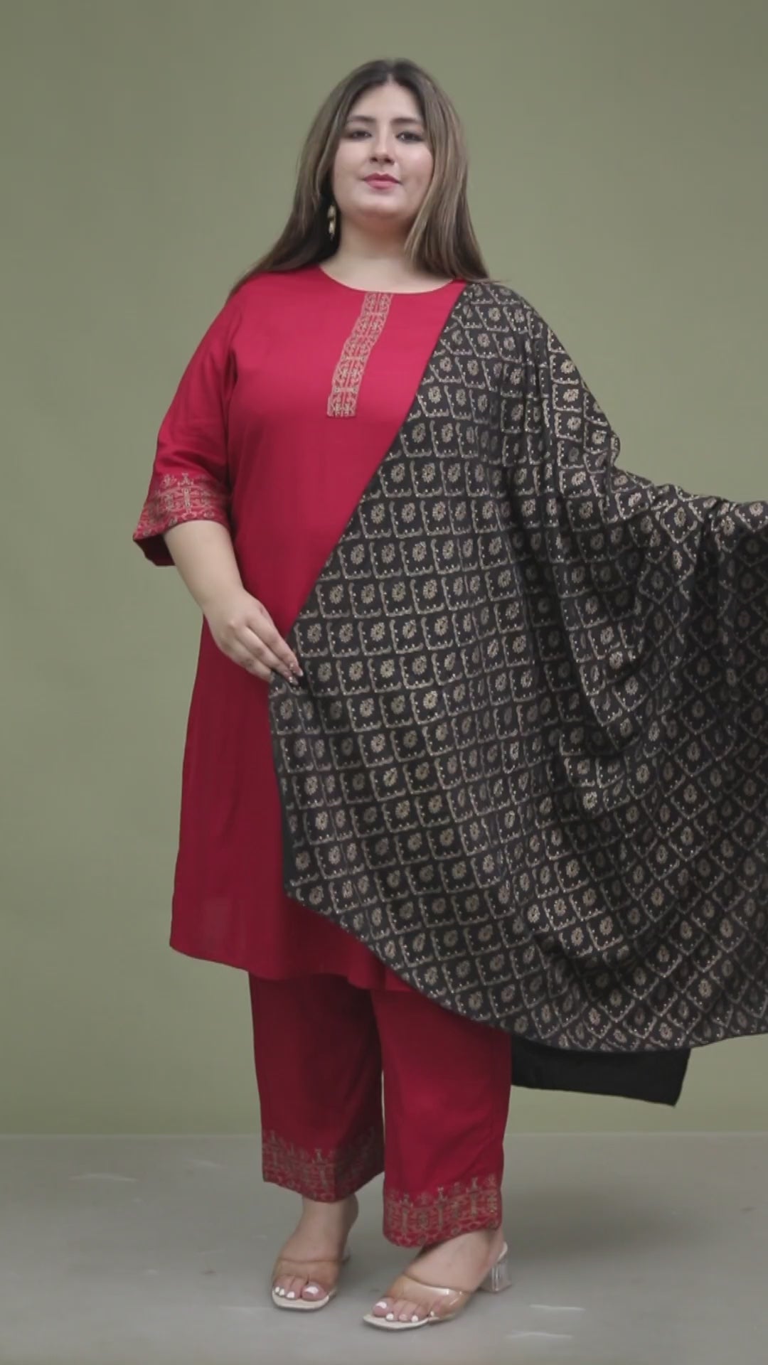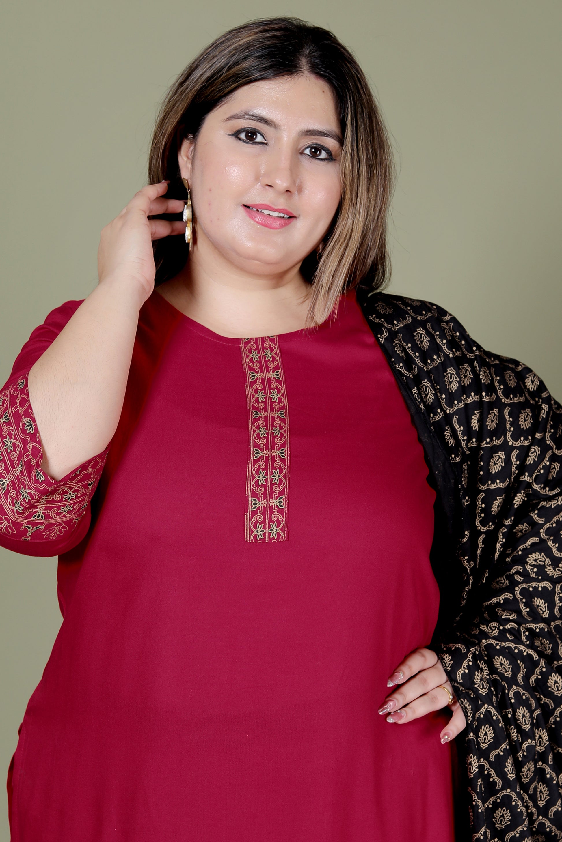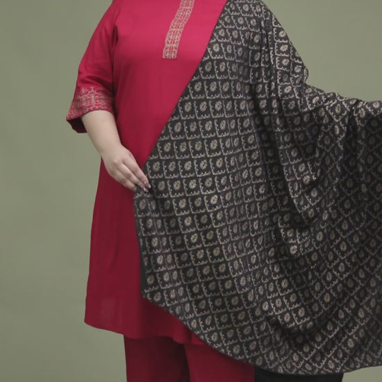 Key Features: Wine maroon base | Golden ethnic foil detailing | Round neckline with 3/4 sleeves | Coordinated pant | Black dupatta with golden lattice motifs