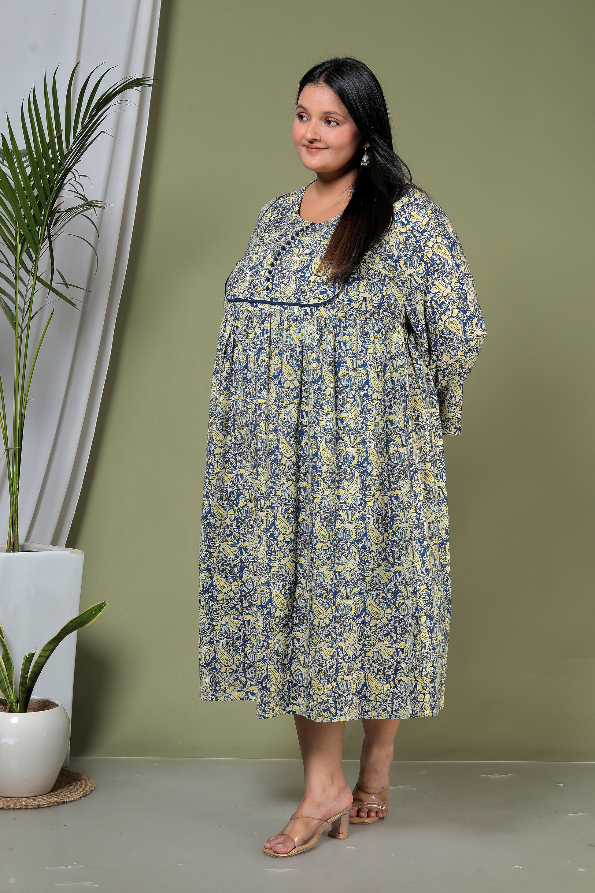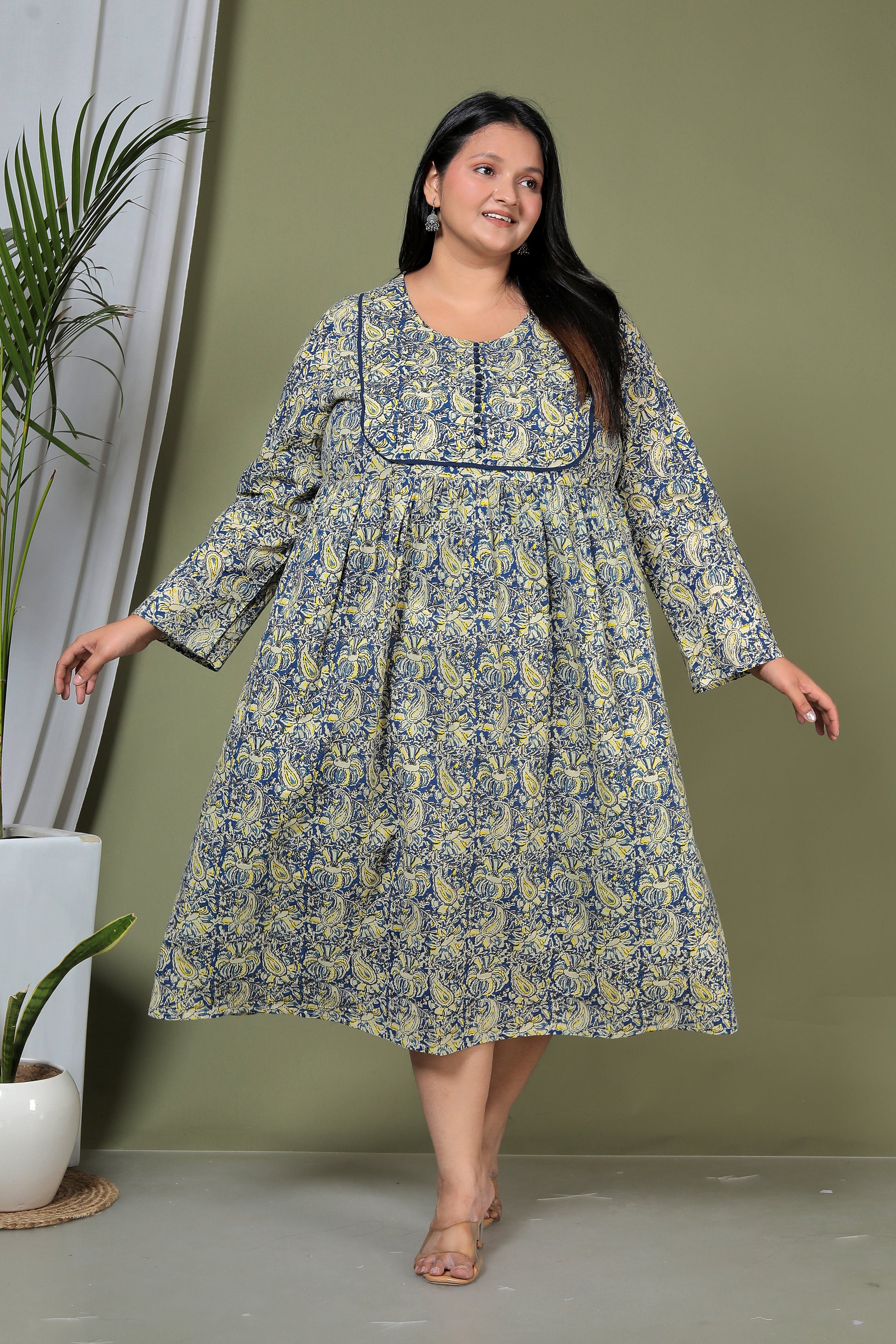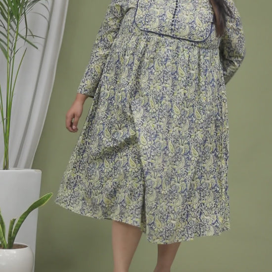 PAISLEY BLOCK PRINT COTTON DRESS IN BLUE/YELLOW BY PLUSSIZEKURTI