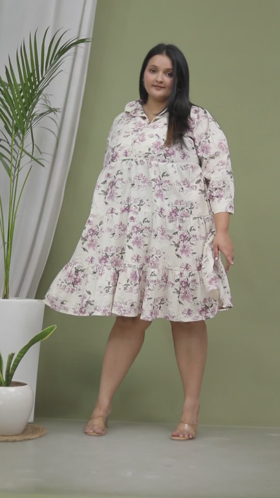 Dress: A-line tiered silhouette with shirt collar neckline, button-down placket, and 3/4th cuffed sleeves