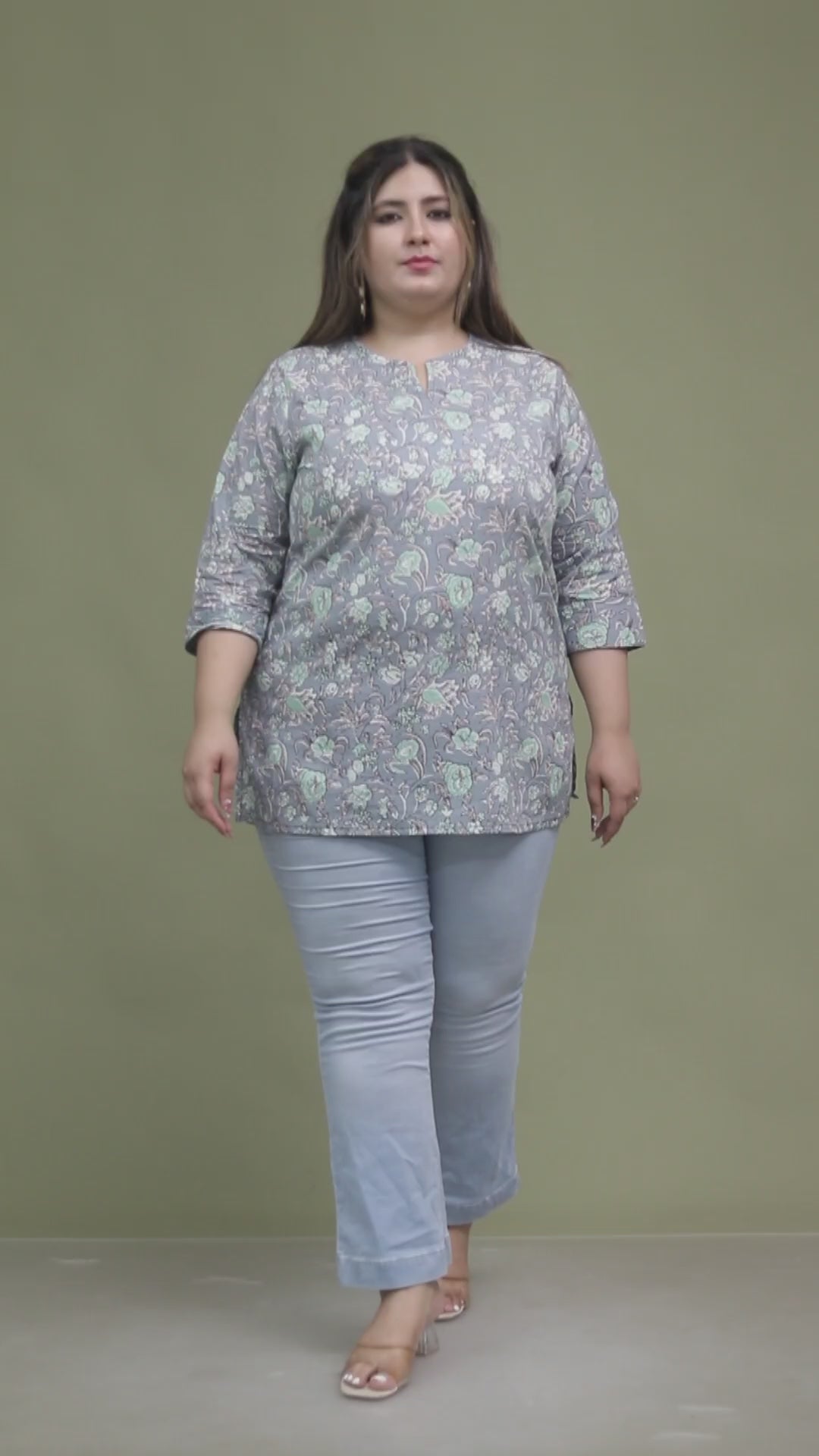 Key Features: Pastel Grey base with Floral Print | Round neck with notch detail | Relaxed fit | Top length 32" | 3/4 sleeves