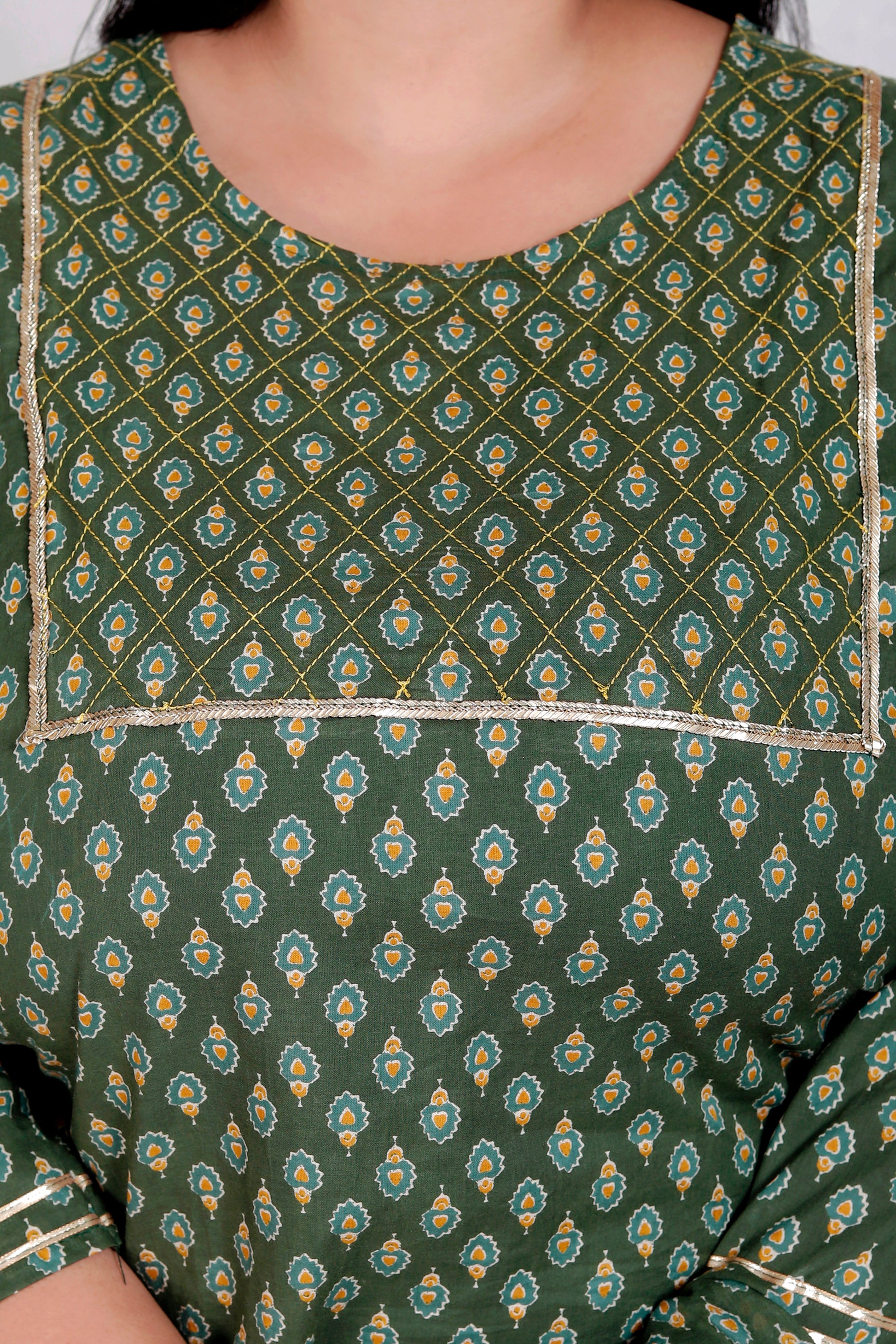 BLOCK BUTTY PRINT COTTON 3 PEICE KURTA FARSI IN GREEN/YELLOW BY PLUSSIZEKURTI