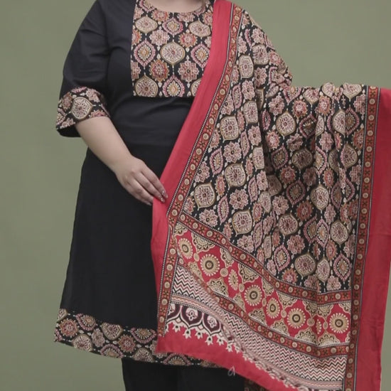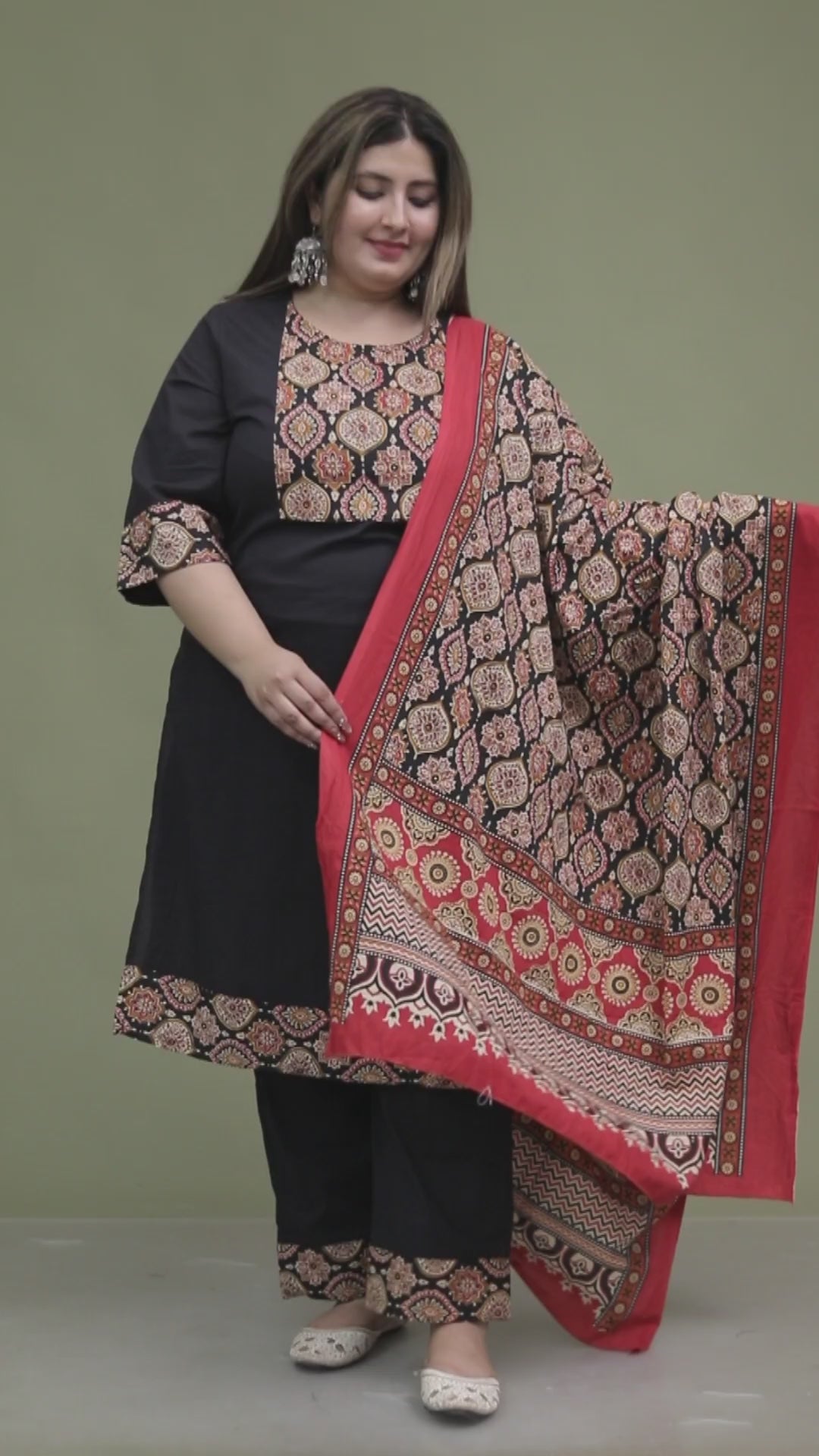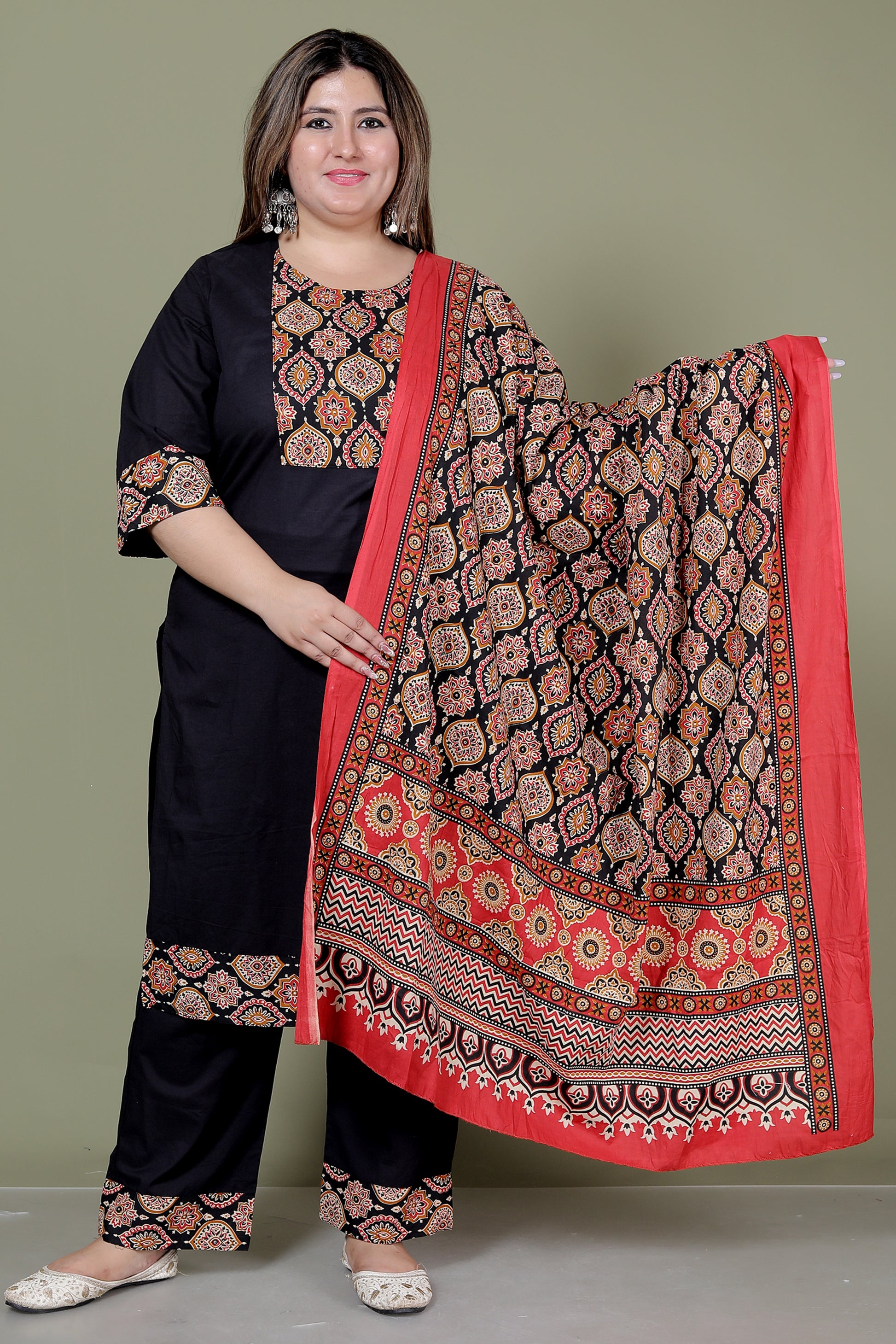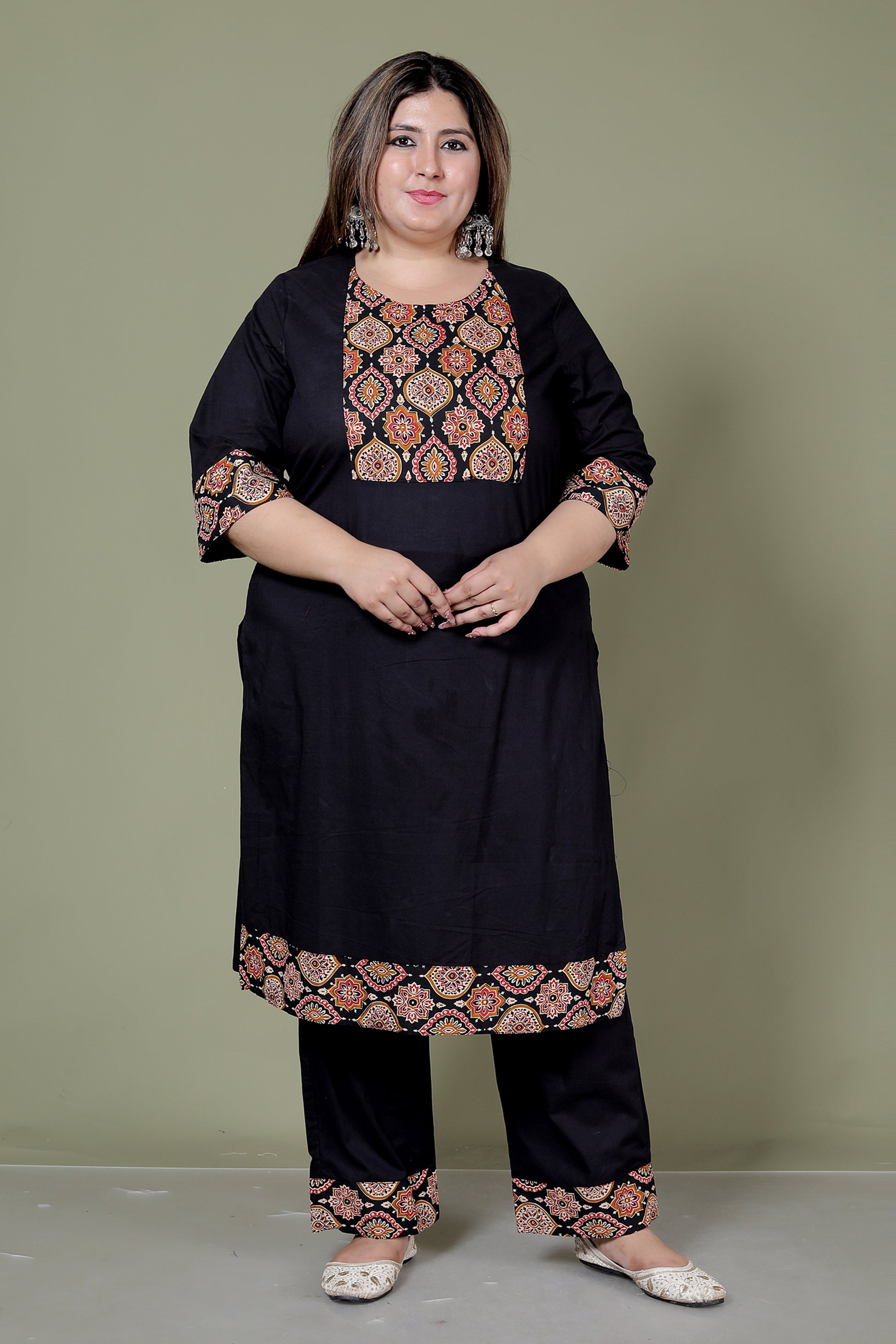 GEOMETRIC FLORAL SOLID COTTON 3 PEICE KURTI PANT SET IN BLACK BY PLUSSIZEKURTI