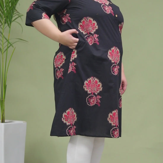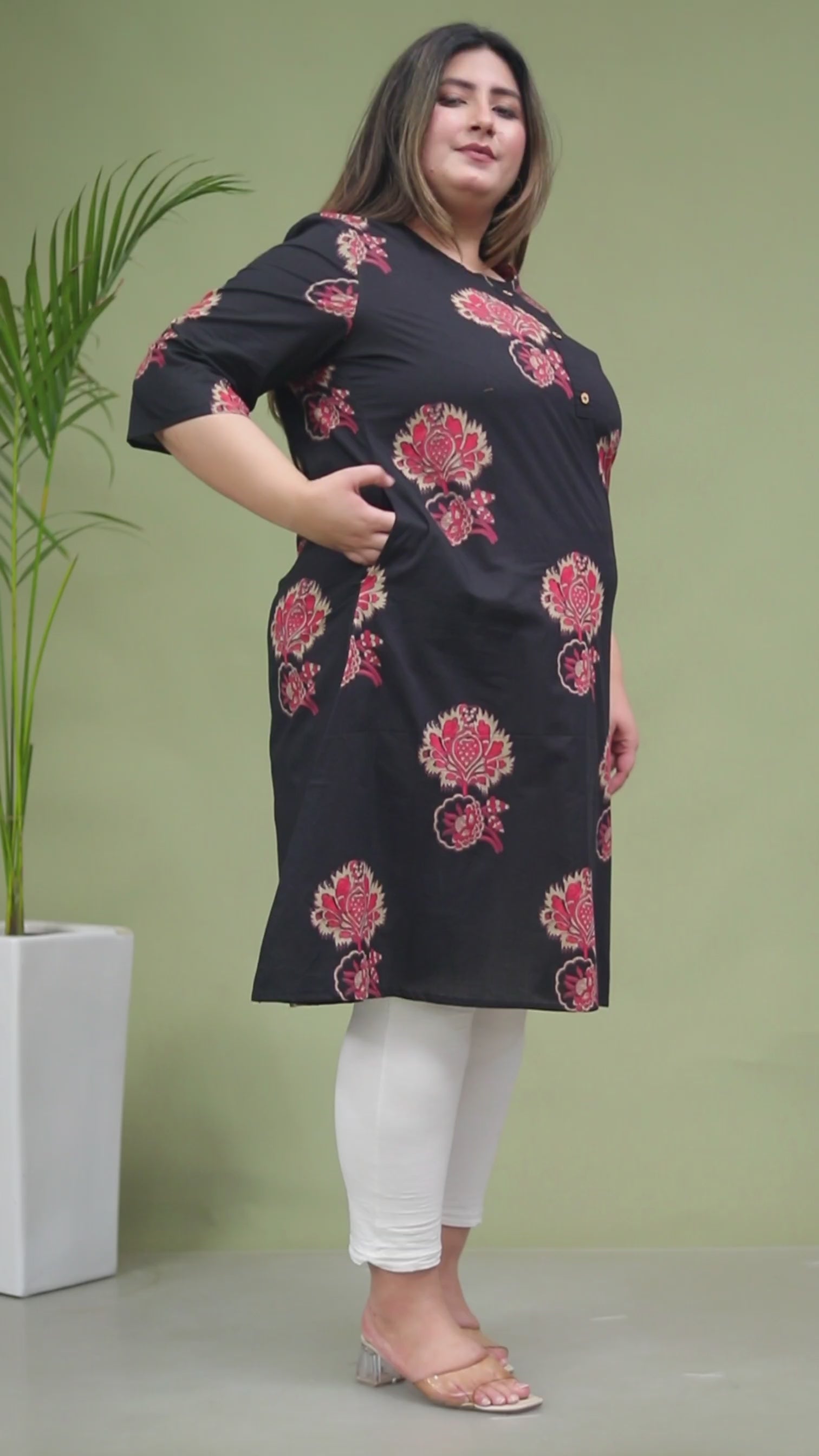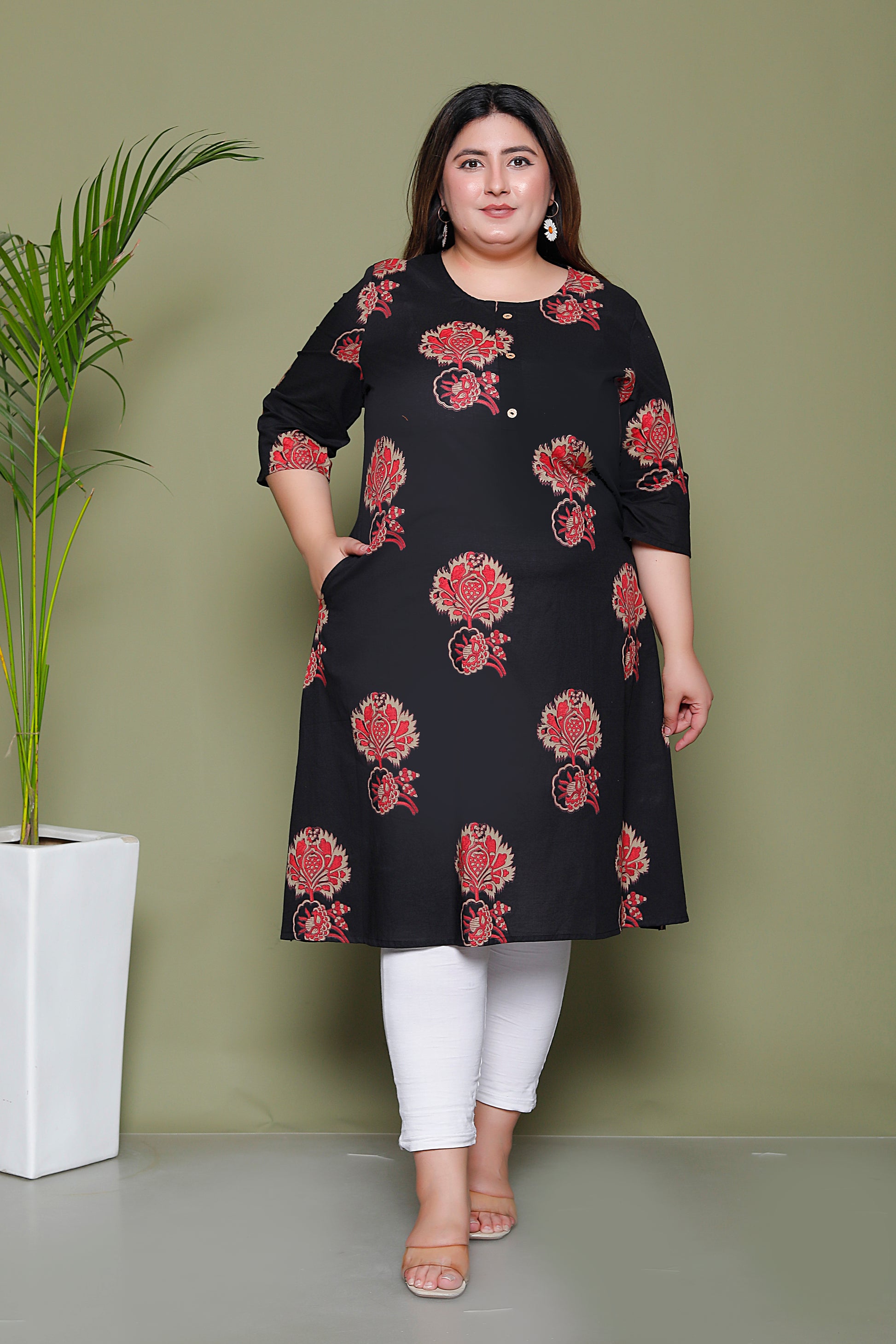 HANDBLOCK FLORAL BUTTA PRINT COTTON KURTI IN BLACK/RED BY PLUSSIZEKURTI