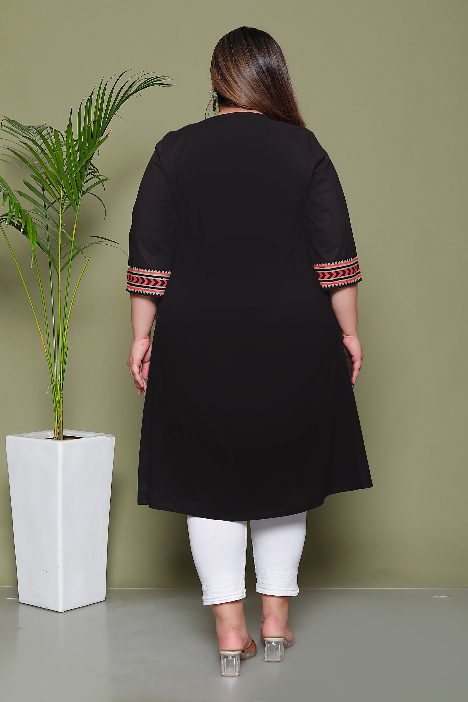 SOLID POCKET PRINT COTTON KURTI IN BLACK BY PLUSSIZEKURTI
