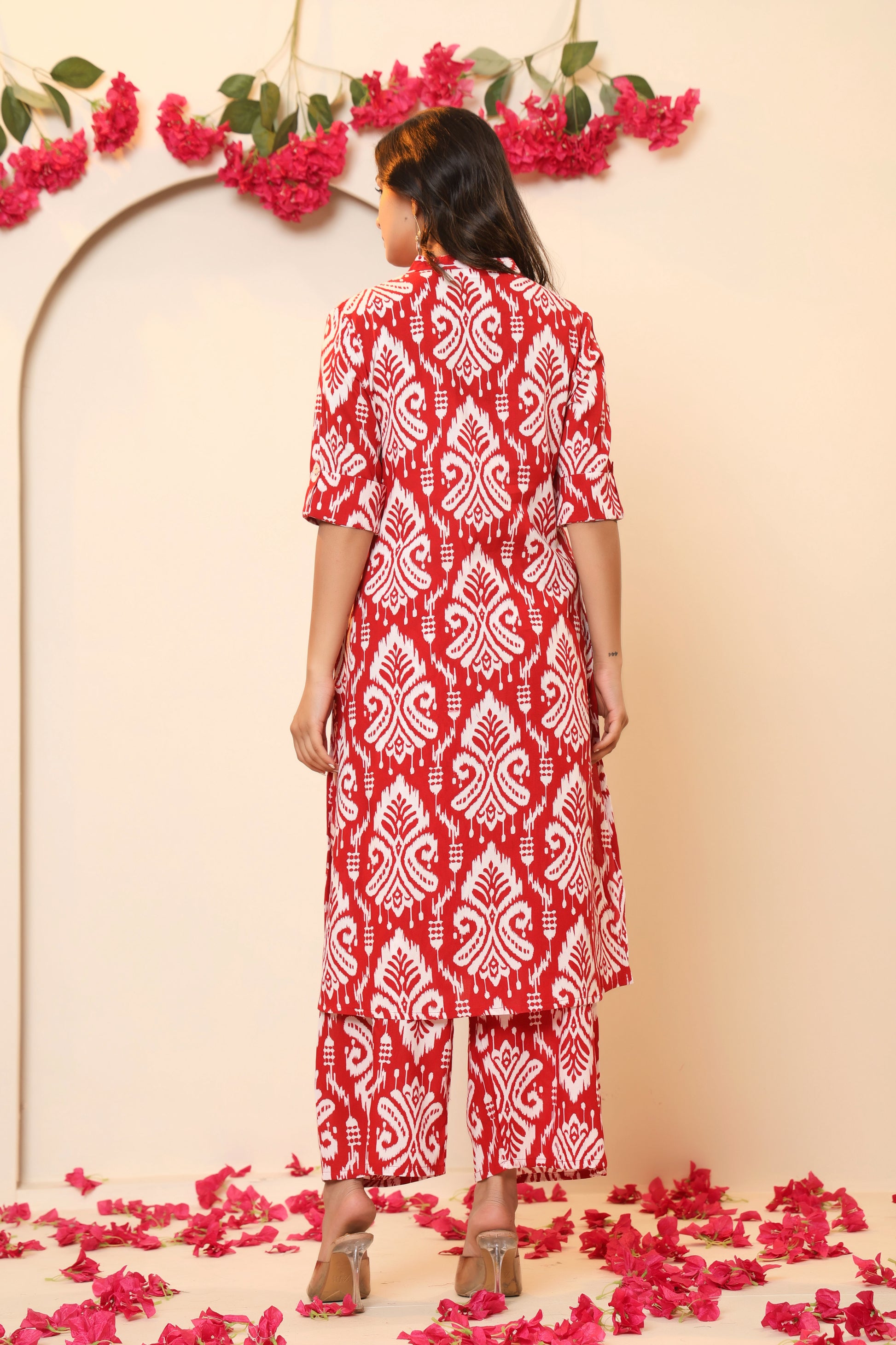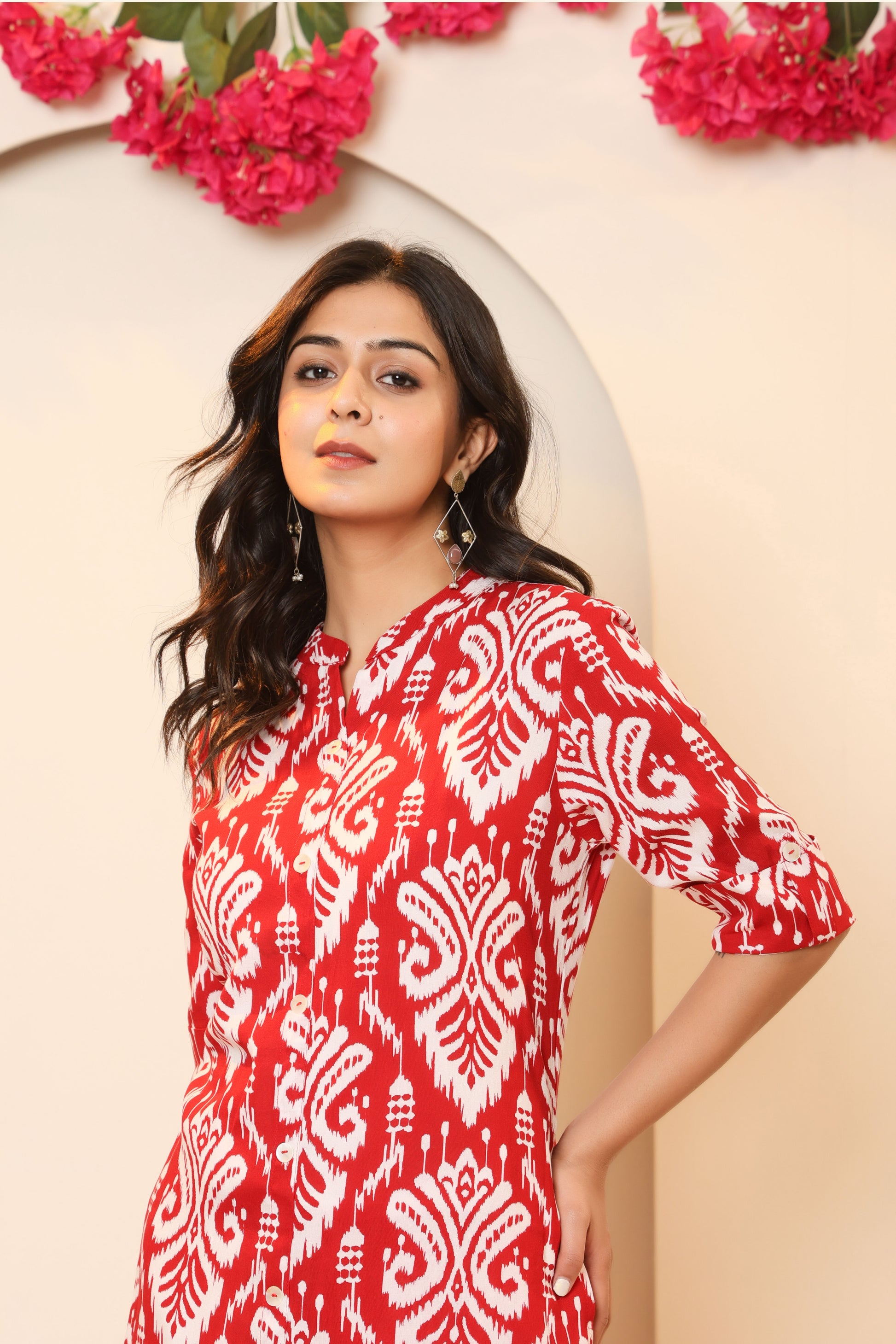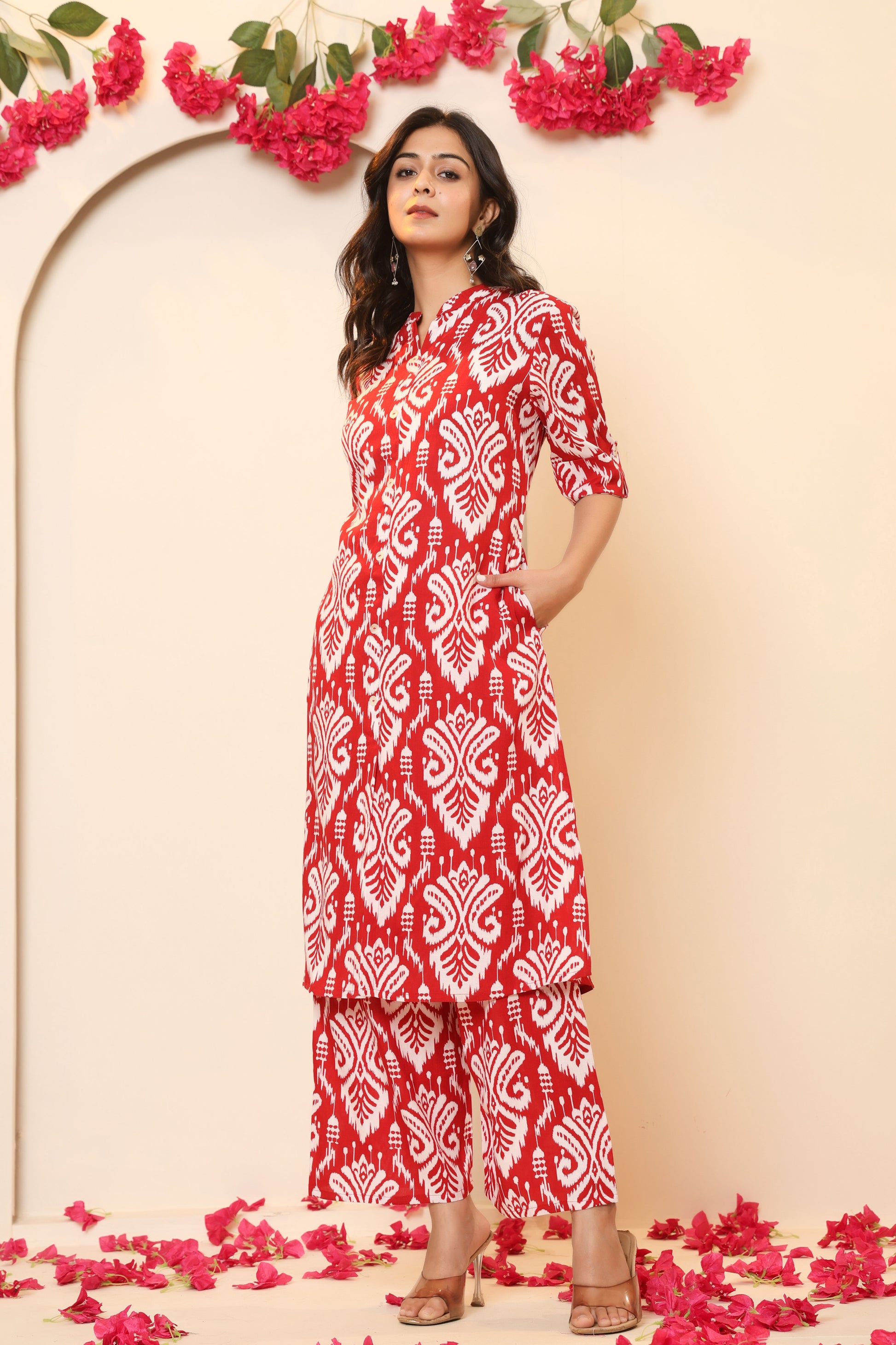 IKAT PRINT COTTON 2 PEICE KURTI PLAZZO SET IN RED BY PLUSSIZEKURTI