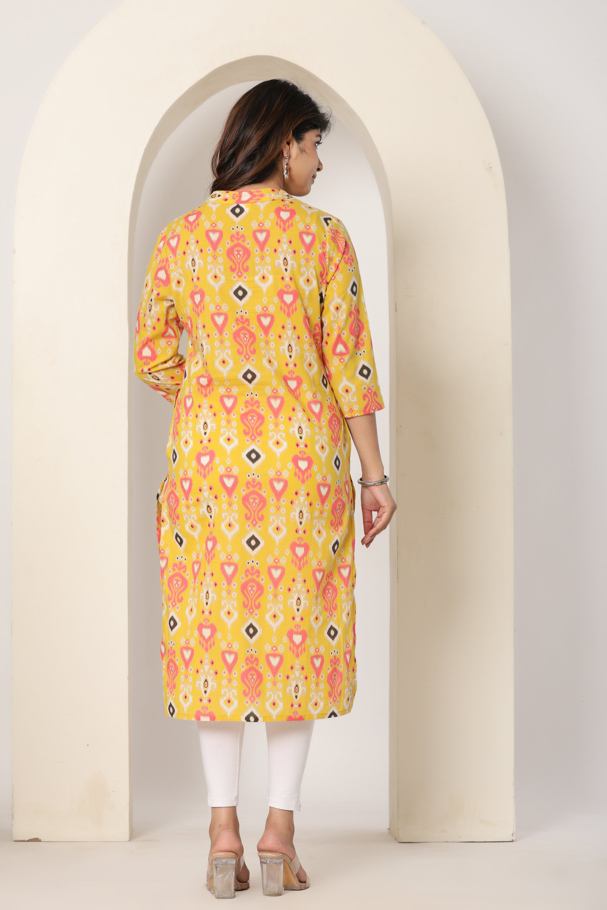 IKAT PRINTED COTTON KURTI YELLOW IN BY PLUSSIZE KURTI