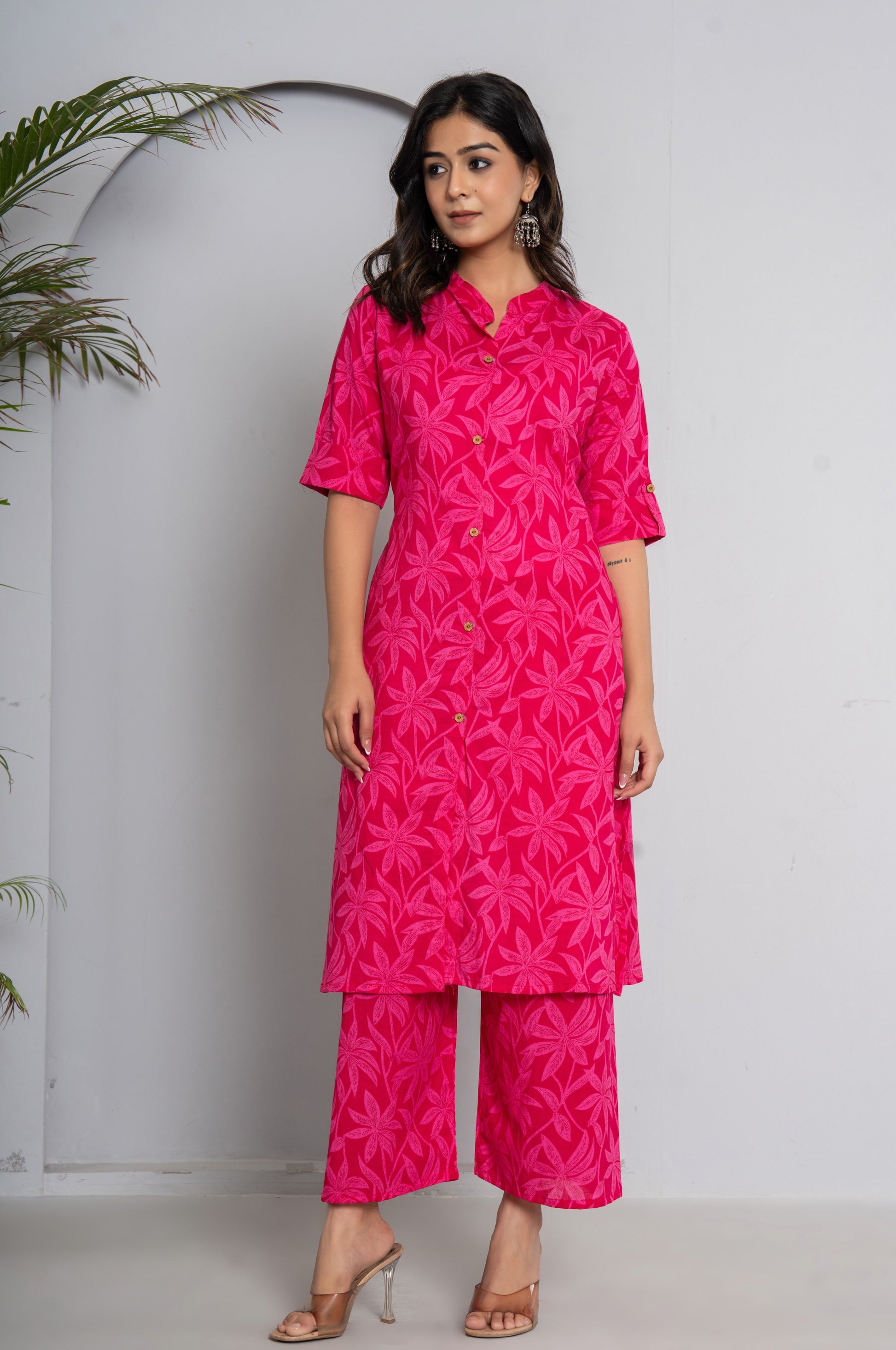 FLOWER PRINT COTTON 2 PEICE KURTI PLAZZO SET IN RANIPINK BY PLUSSIZEKURTI