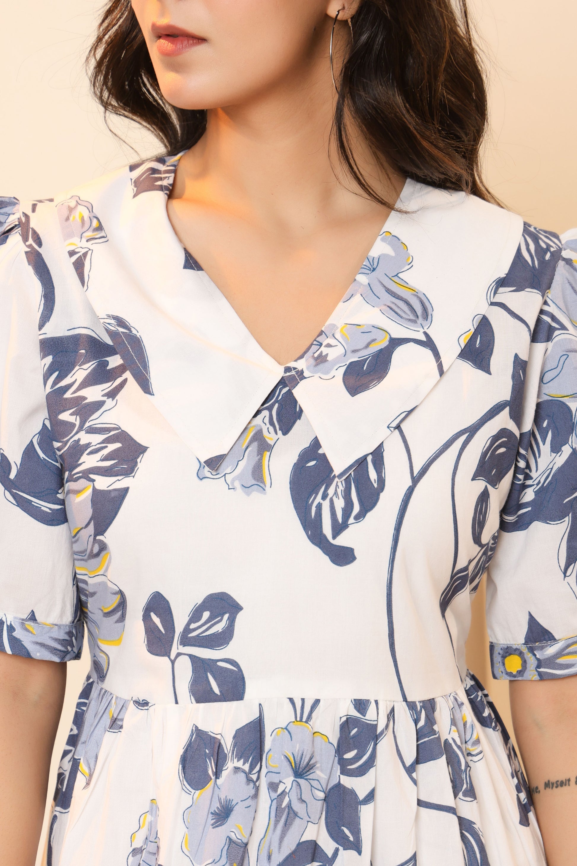 FLORAL PRINT A-LINE COTTON DRESS IN WHITE/BLUE BY PLUSSIZEKURTI