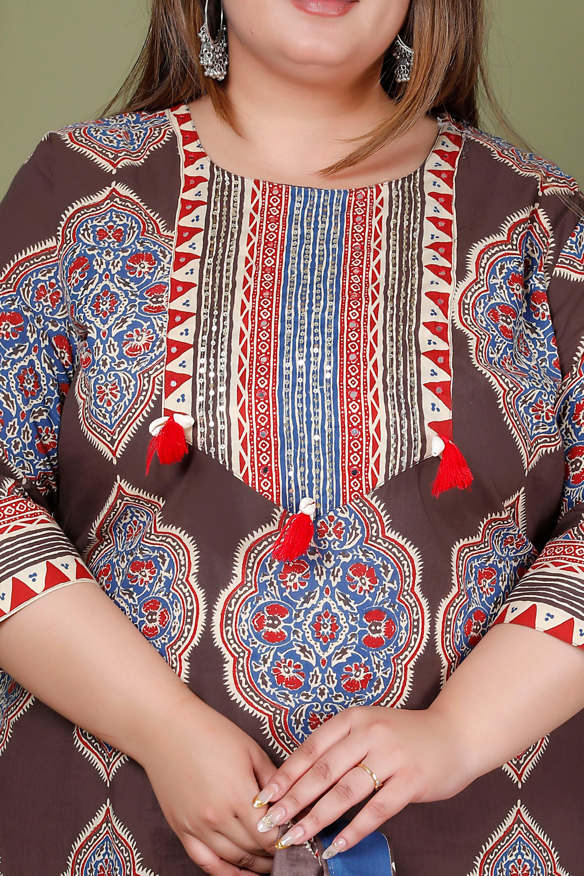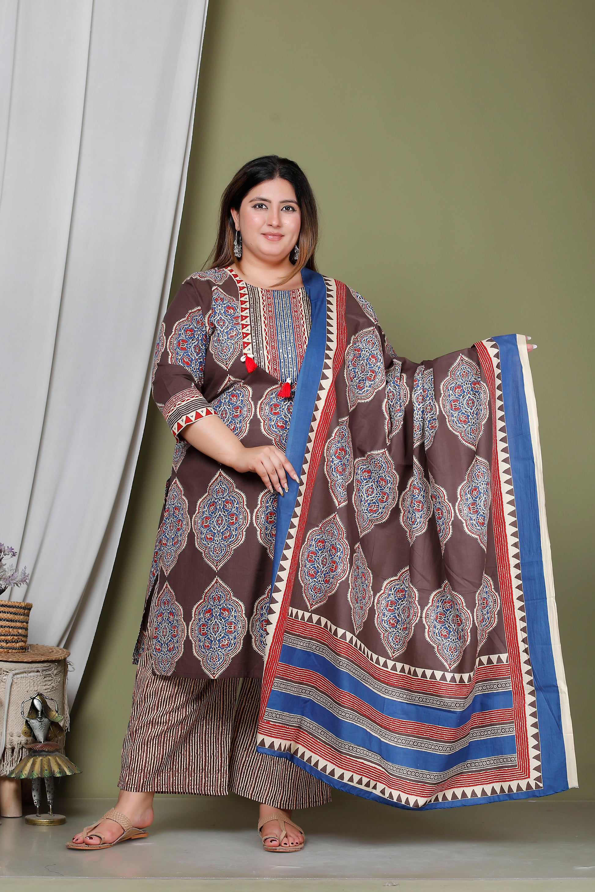 SYMMETRICAL FLORAL MOTIF PRINT COTTON 3 PEICE KURTA PANT IN BROWN / RED RUST BY PLUSSIZEKURTI
