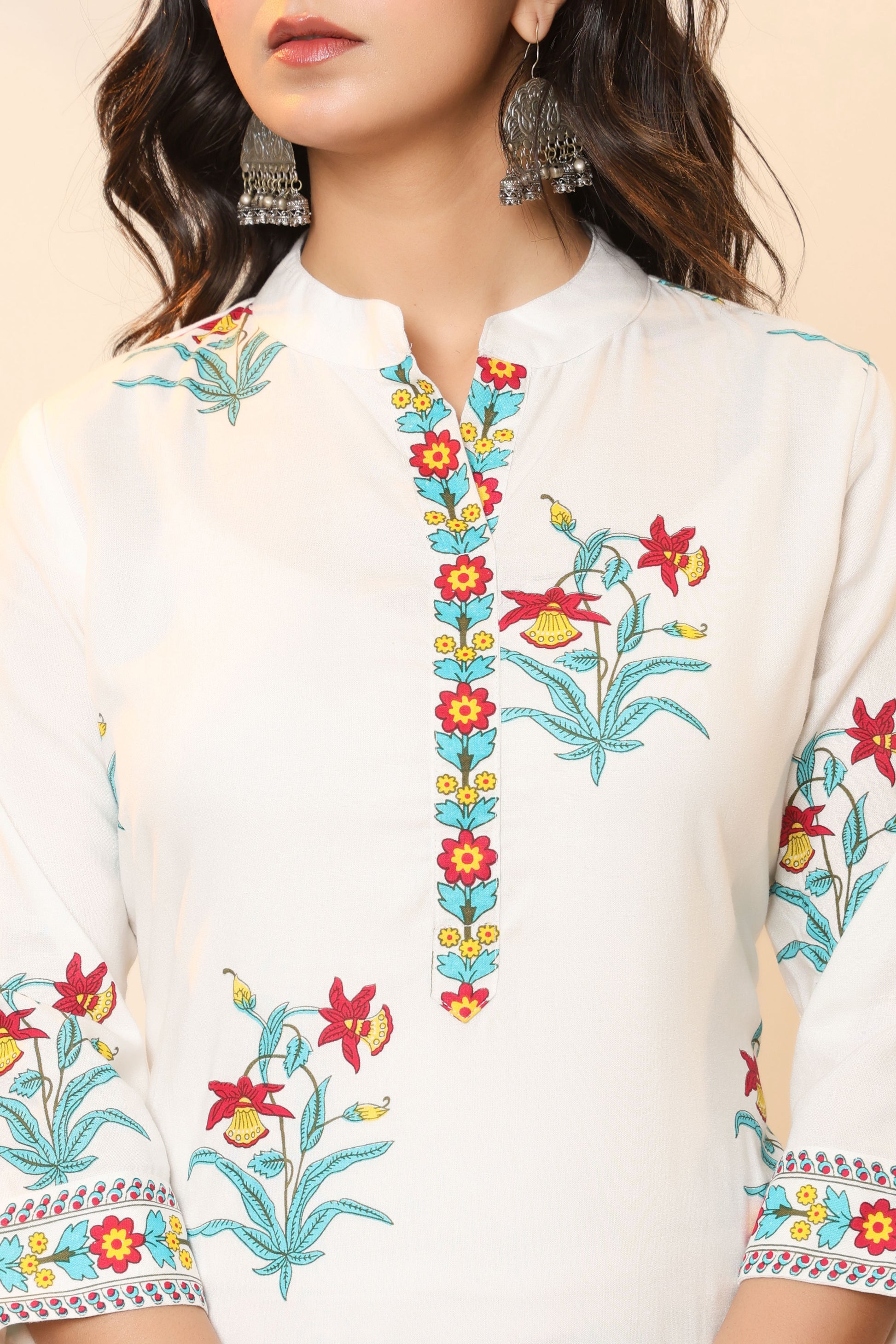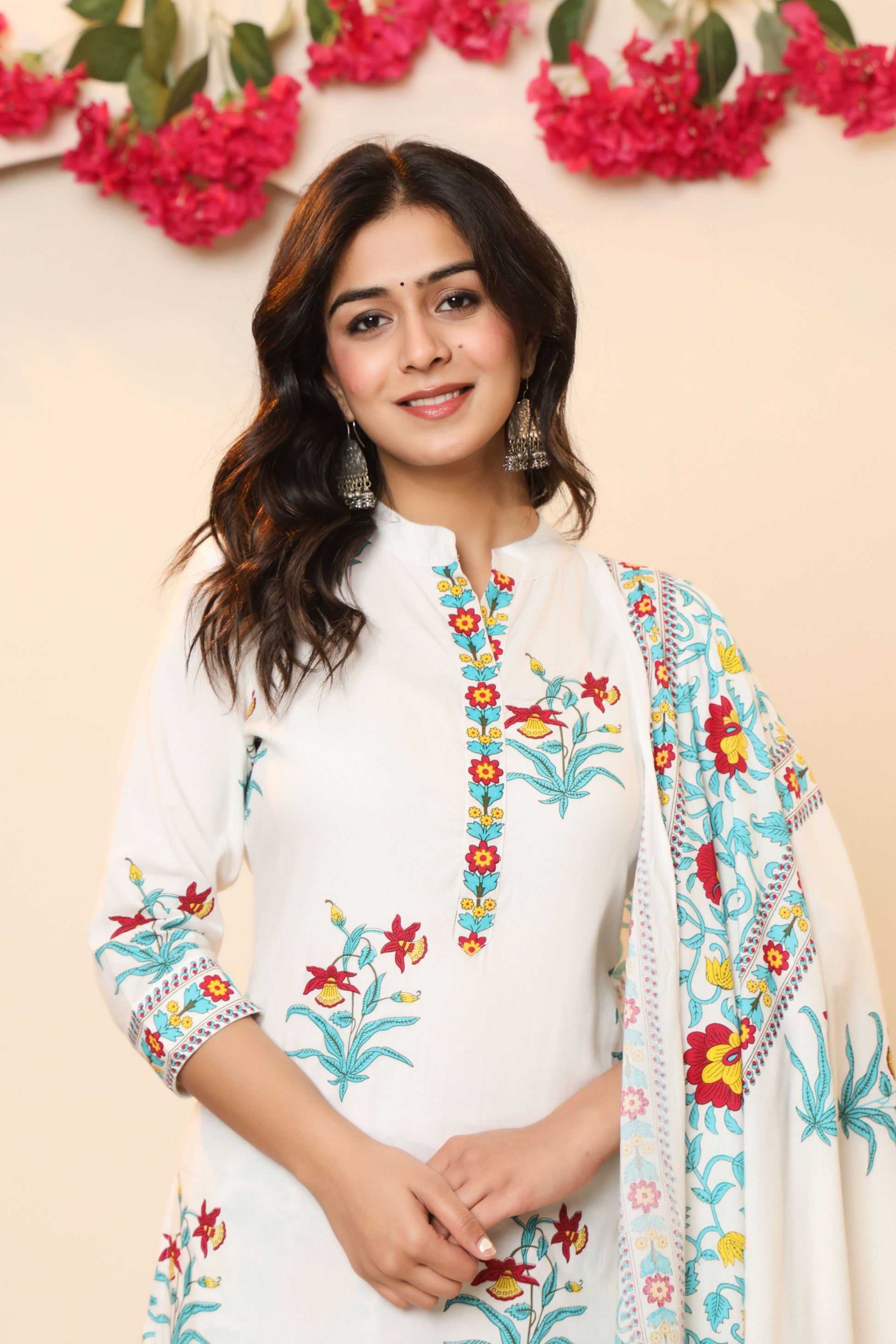 MUGHAL PRINT COTTON 3 PEICE KURTI PLAZZO SET IN WHITE/SKYBLUE BY PLUSSIZEKURTI