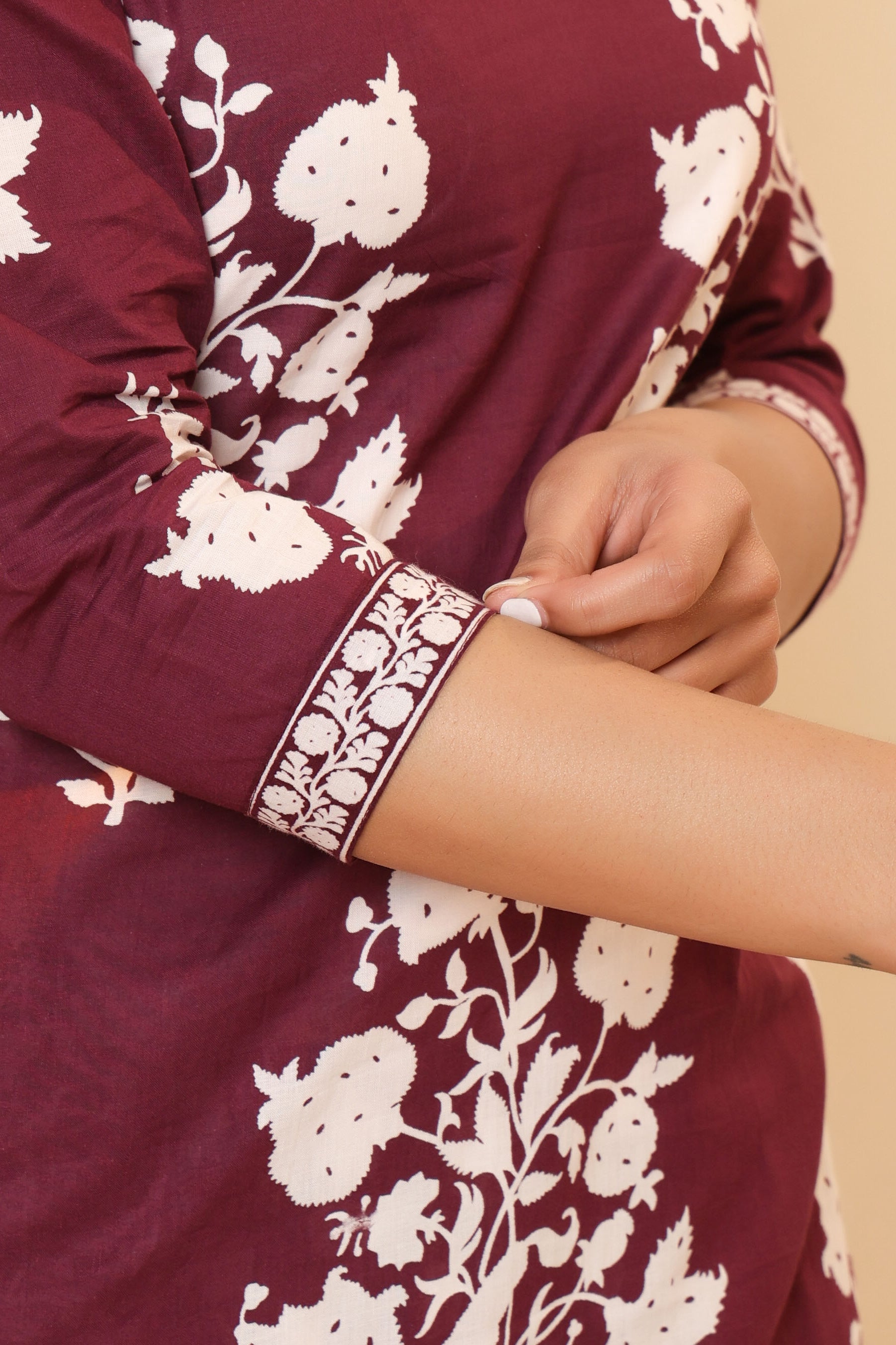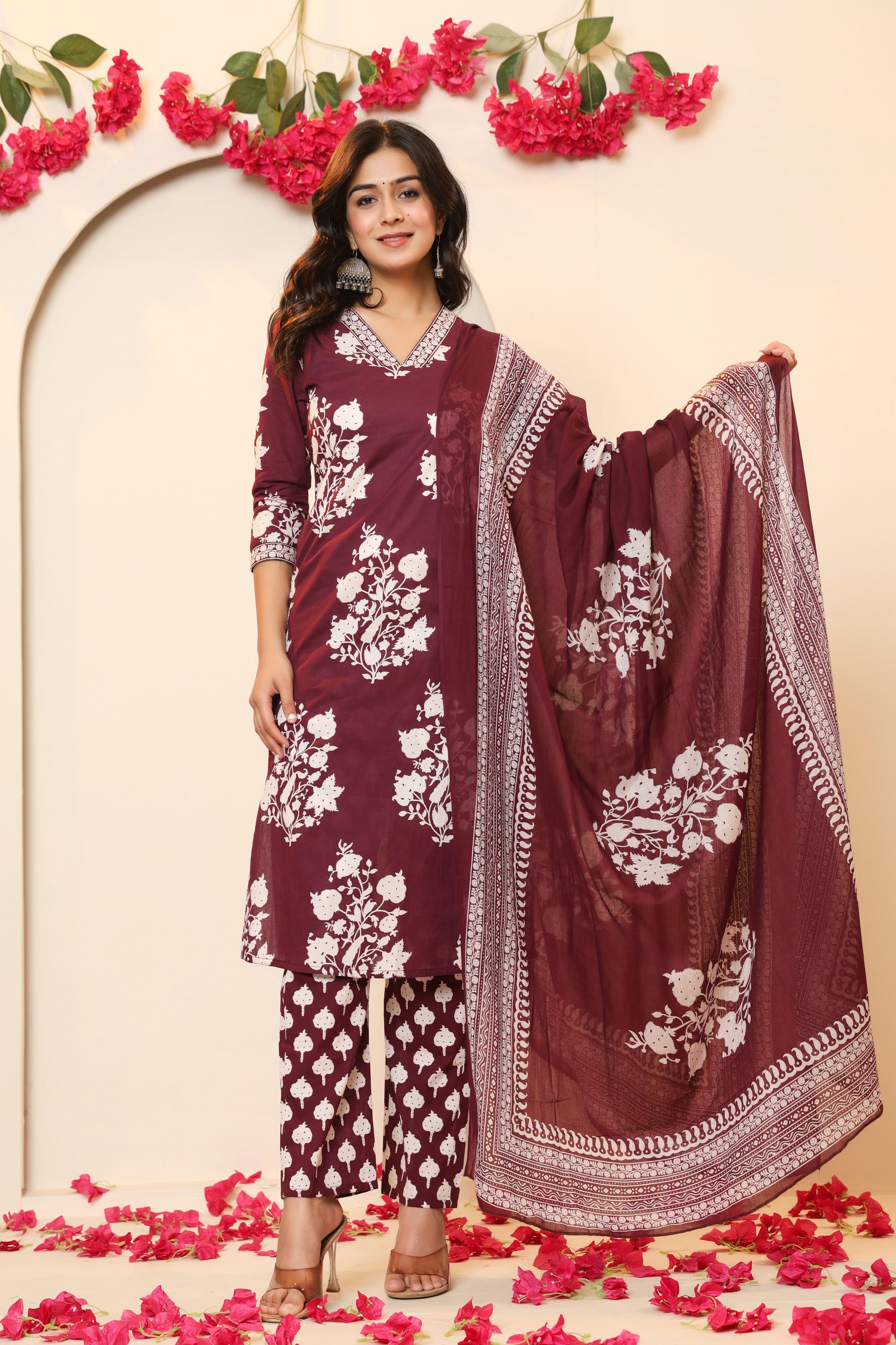 BAGRU HANDBLOCK PRINT COTTON 3 PEICE KURTI PANT SET IN WINE PURPLE BY PLUSSIZEKURTI