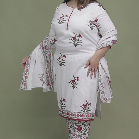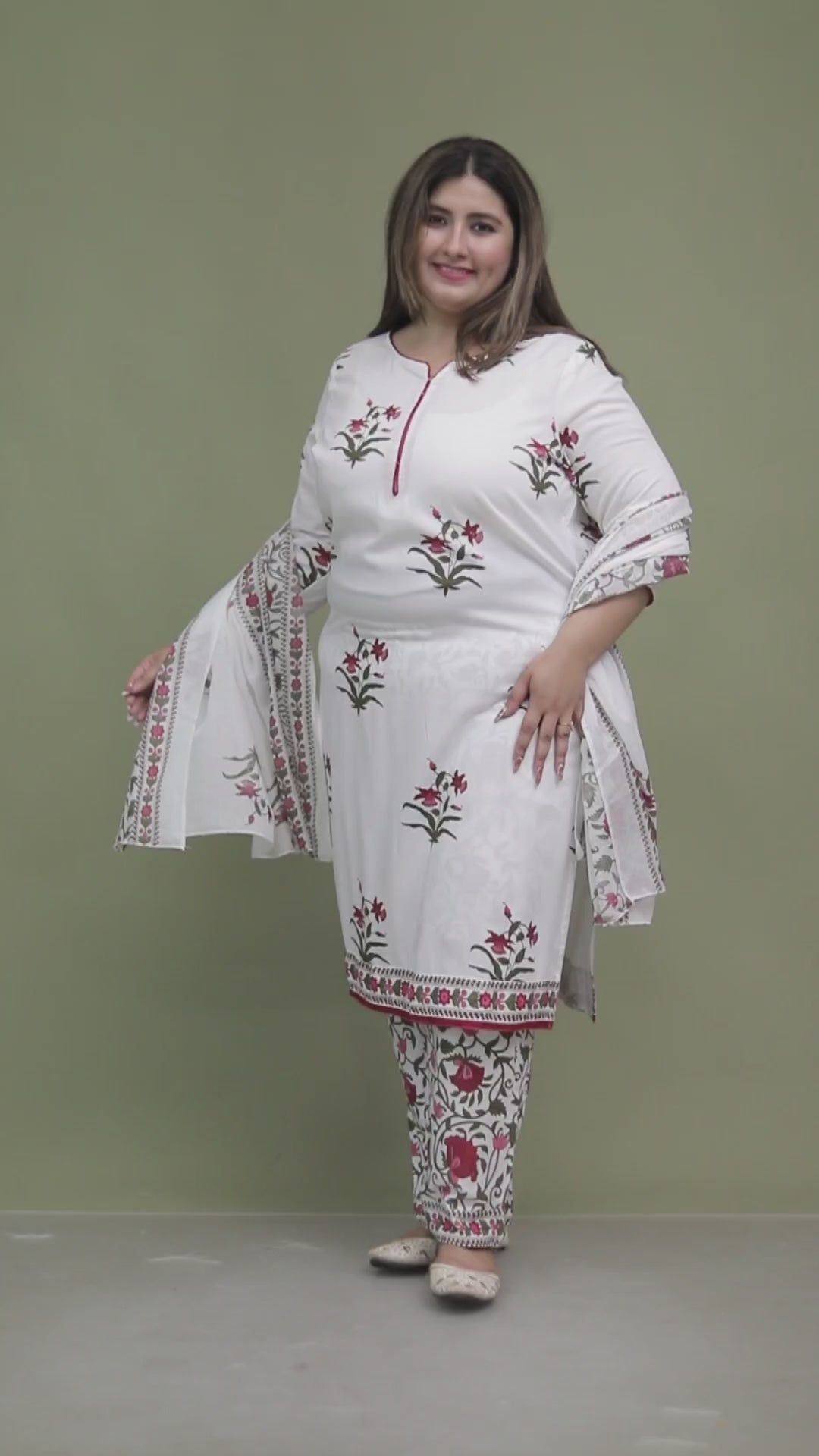 MUGHAL PRINT COTTON 3 PEICE KURTI PANT SET IN WHITE/RED BY PLUSSIZEKURTI