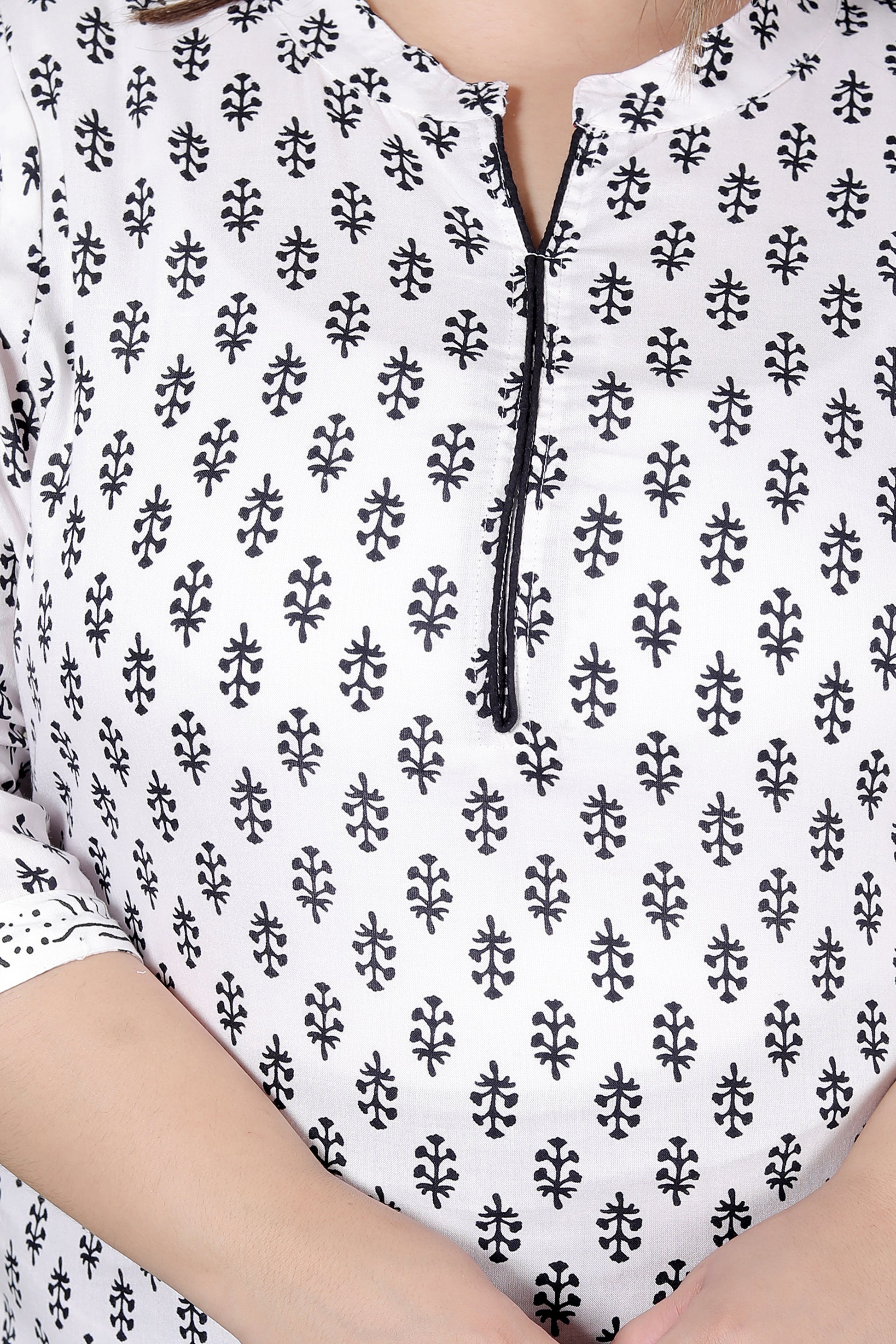 Kurti: White base with small repeating black handblock-style motifs, round neckline with button placket, 3/4 sleeves, length – 46"