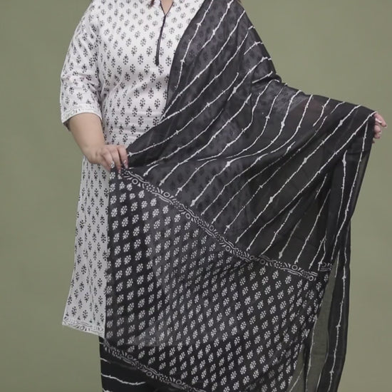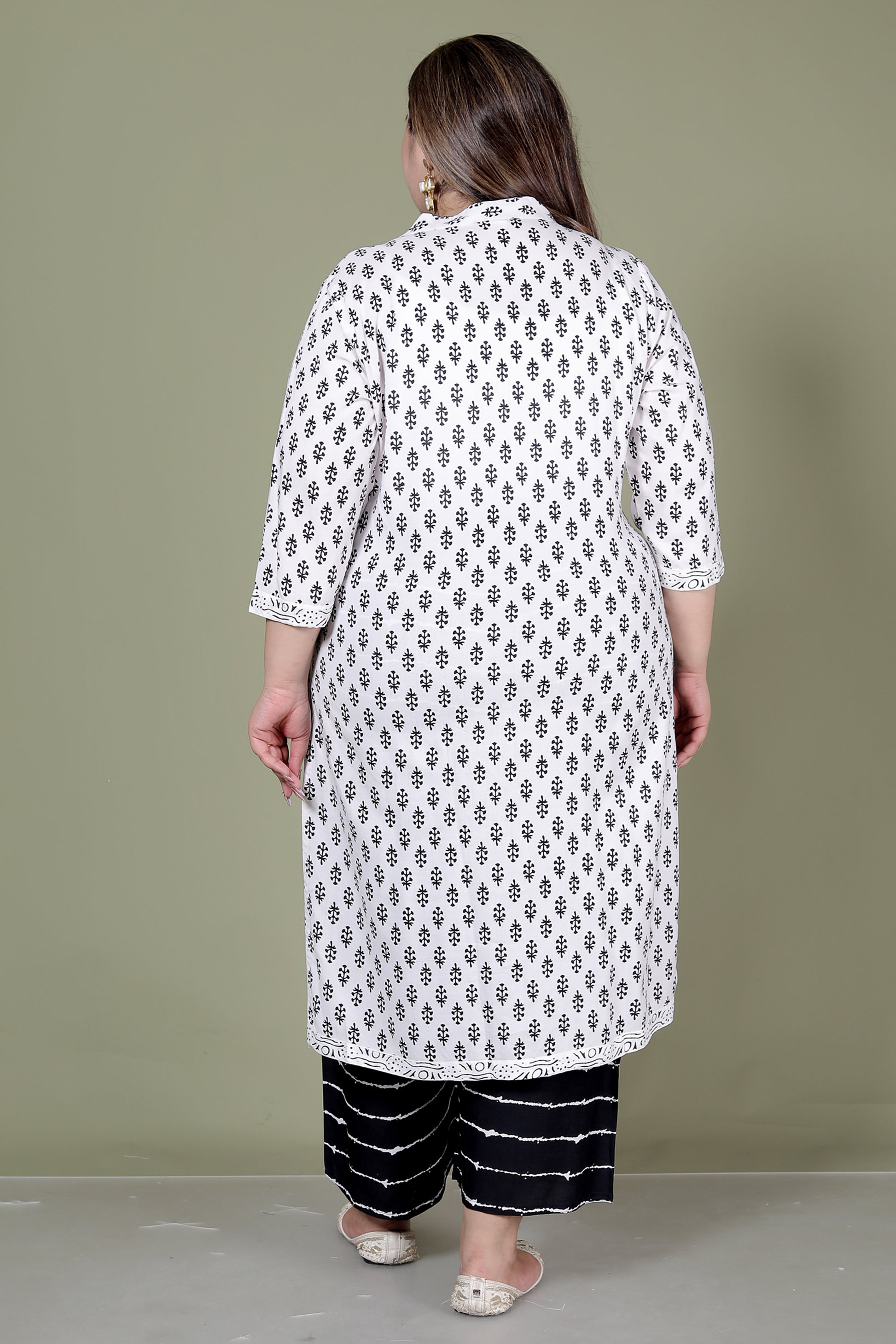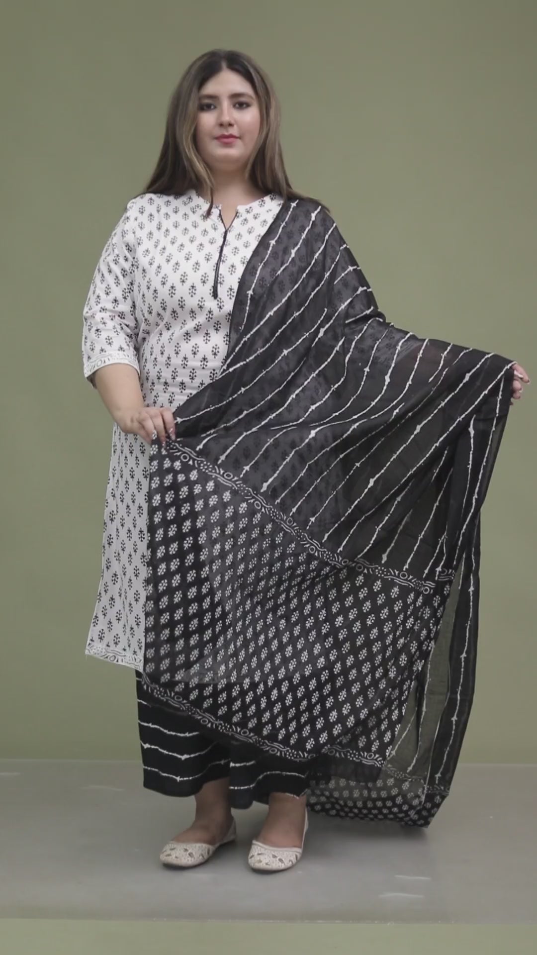 HANDBLOCK MOTIF PRINT COTTON 3 PEICE KURTI PLAZZO SET IN WHITE/BLACK BY PLUSSIZEKURTI