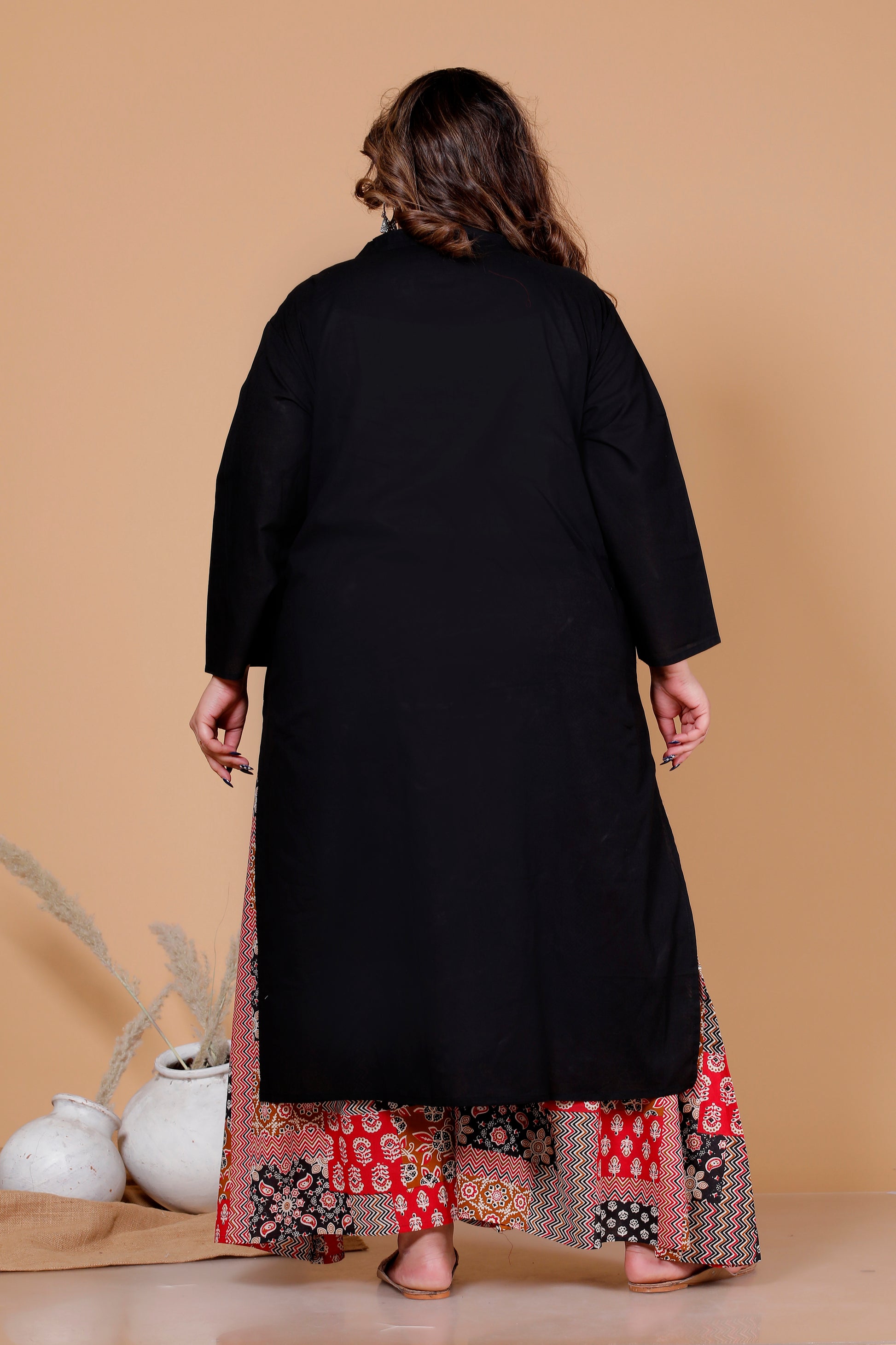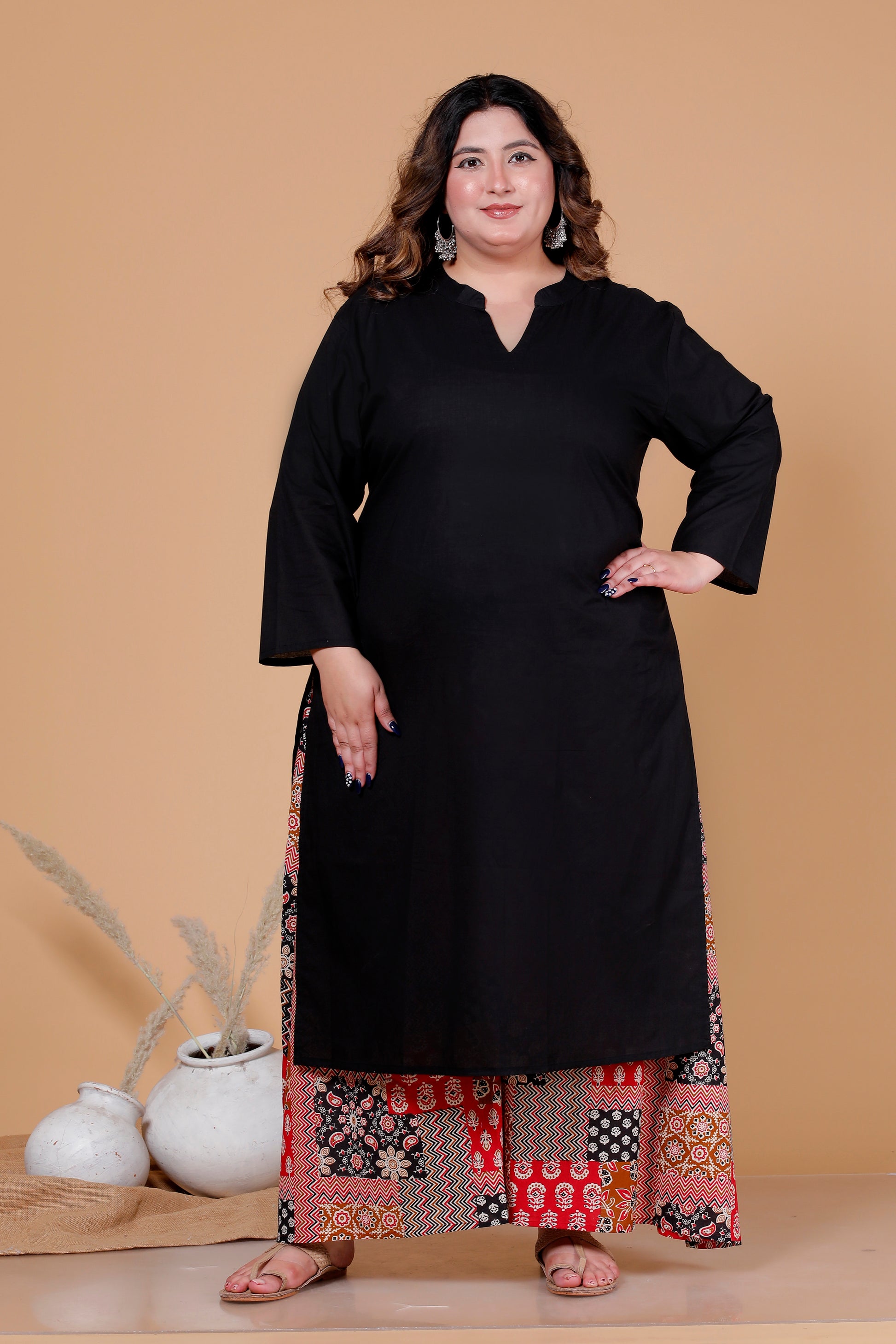 PATCHWORK GEOMETRIC PRINT COTTON SKIRT PANTS IN MUSTURD/BLACK BY PLUSSIZEKURTI