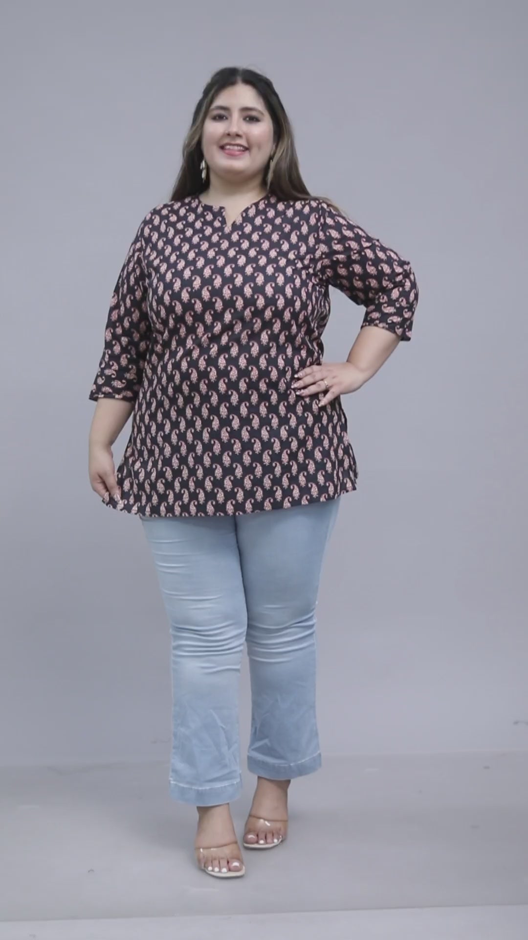 Key Features: Paisley block print | Black base with rust motifs | Round neckline with slit | Top length 32" | 3/4 sleeves | Cotton comfort & elegance