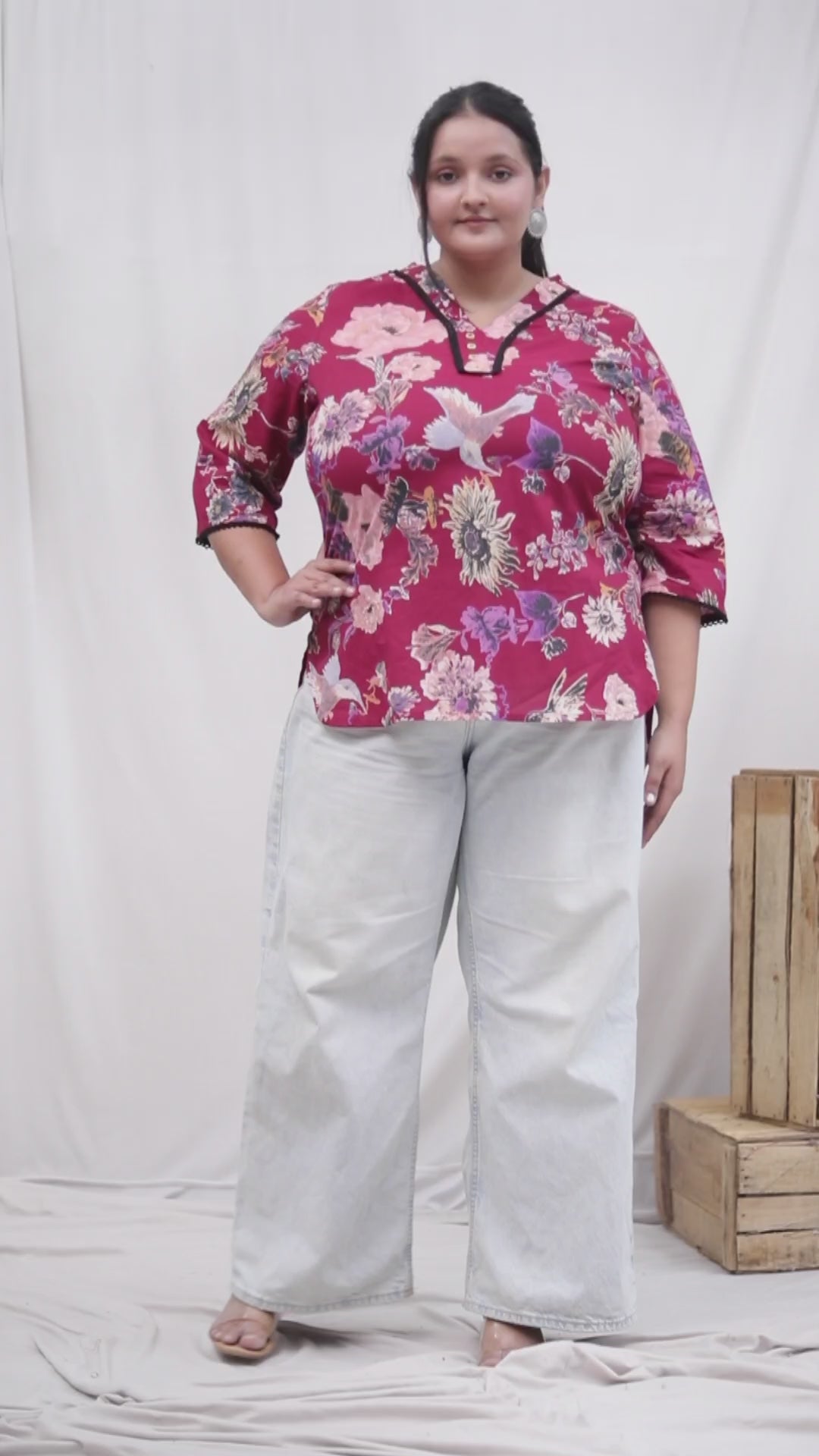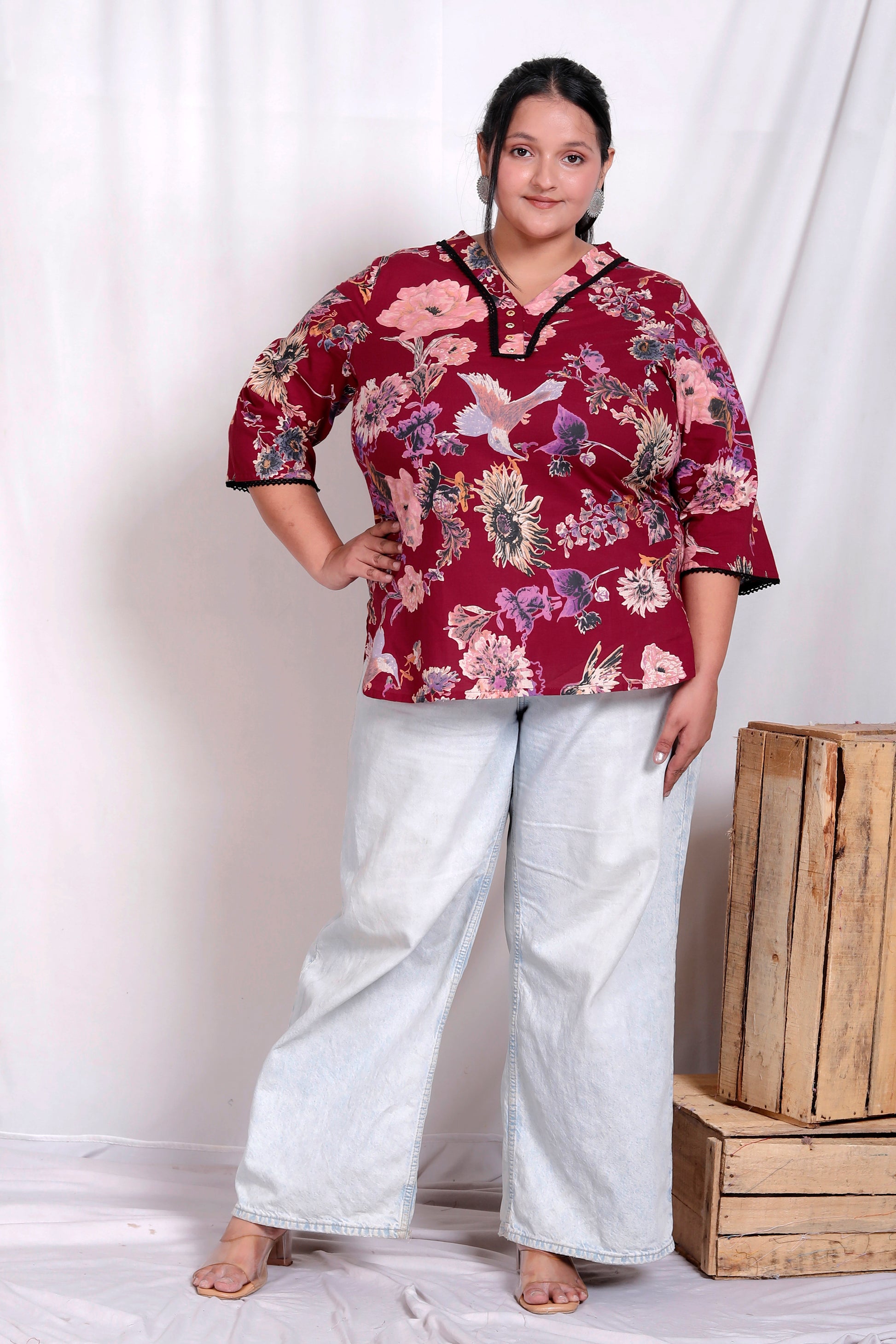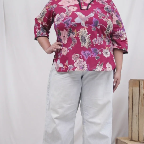 Color & Print: Wine red with all-over floral print and bird motifs