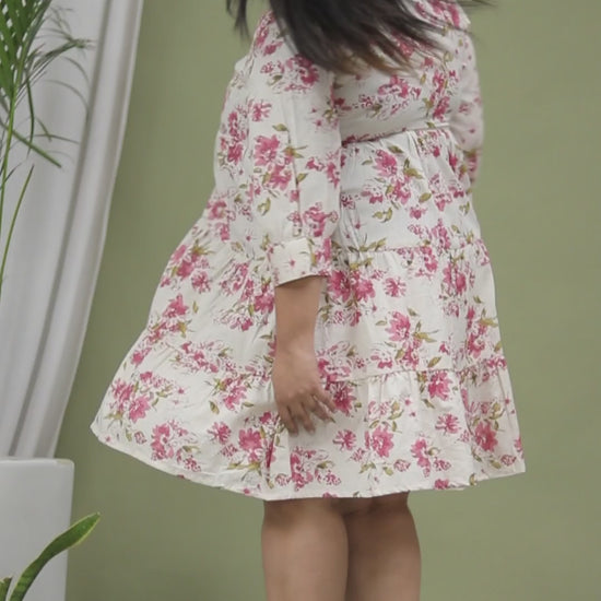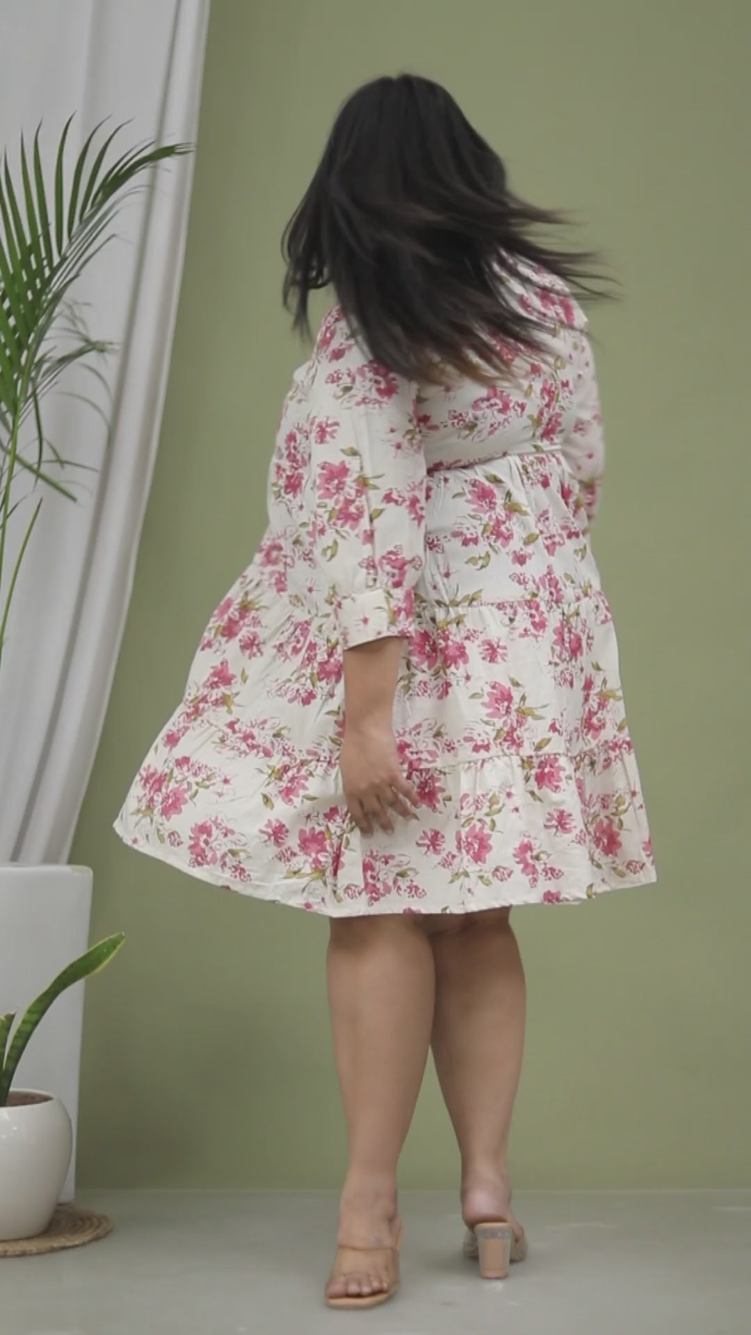 Key Features: Off-white base | Pink floral motifs with green highlights | Shirt collar & button placket | Tiered A-line silhouette | 3/4th cuffed sleeves | Length 39 | Soft, breathable cotton
