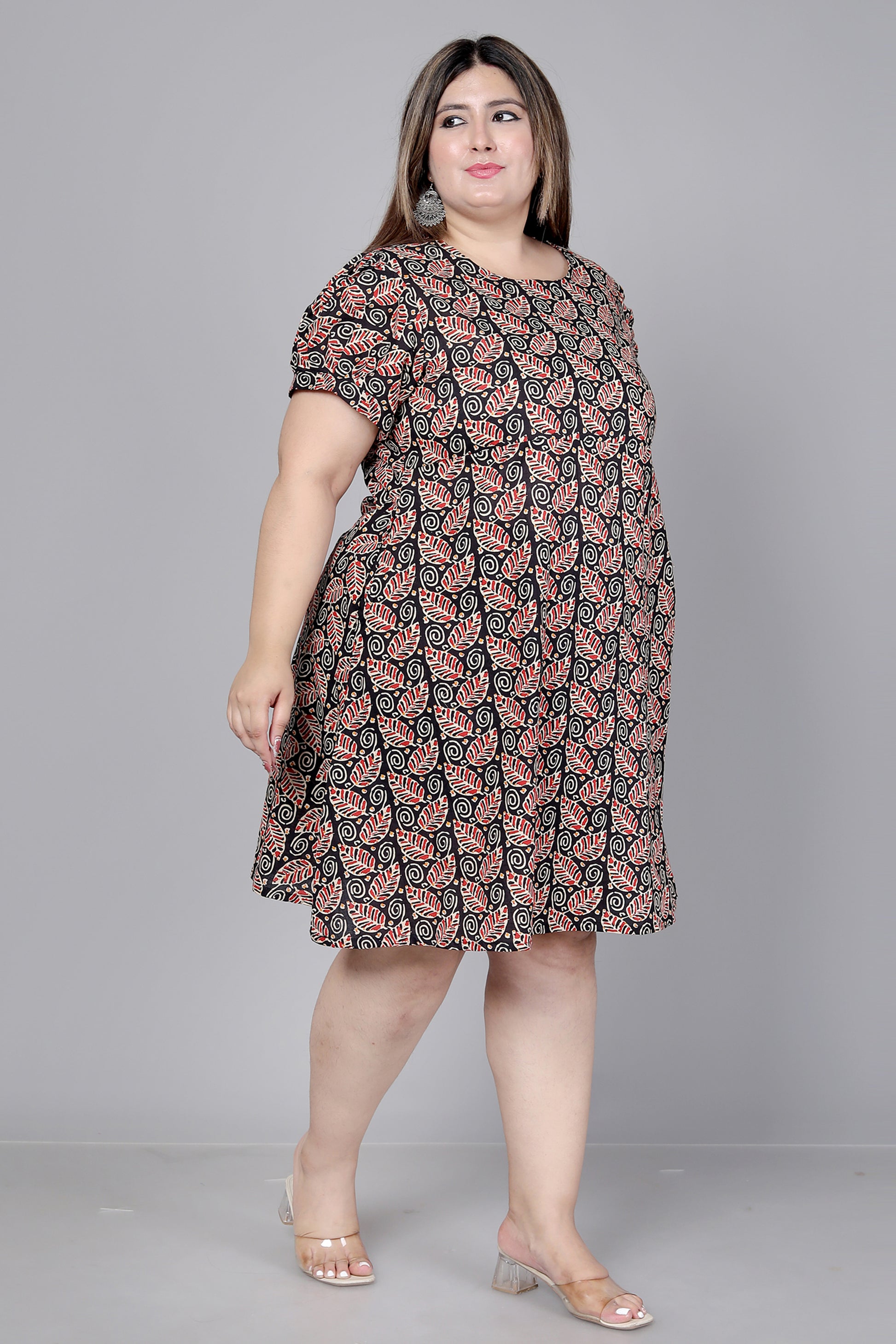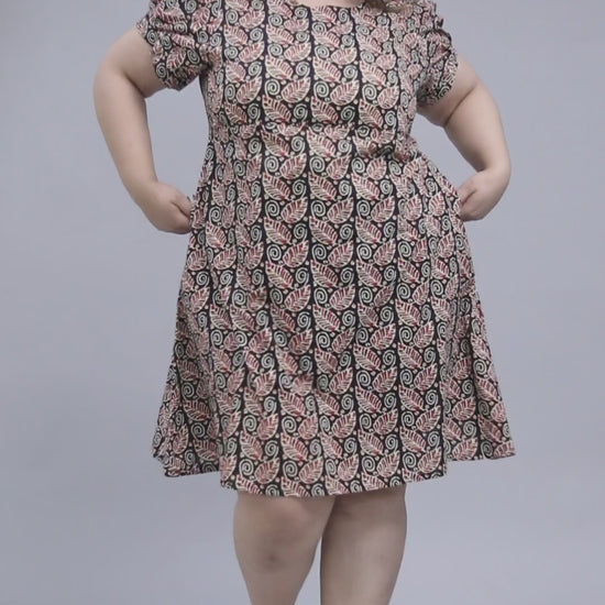 LEAF MOTIF PRINT COTTON DRESS IN BLACK BY PLUSSIZEKURTI