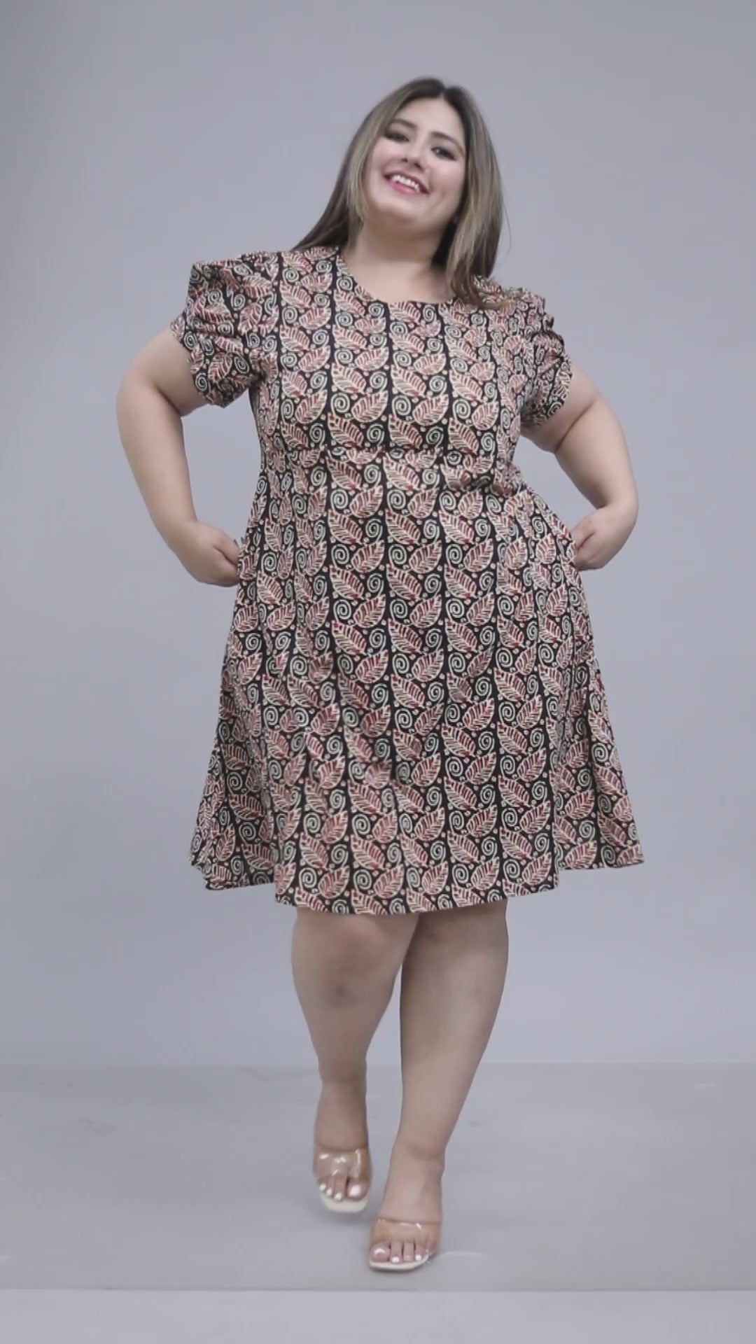 Key Features: Botanical vine & leaf motif | Black base with rust & beige highlights | Vertical stripe arrangement | Round neckline | Short puff sleeves | Dress length 40" | Soft breathable cotton