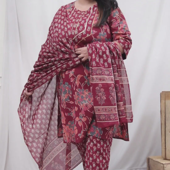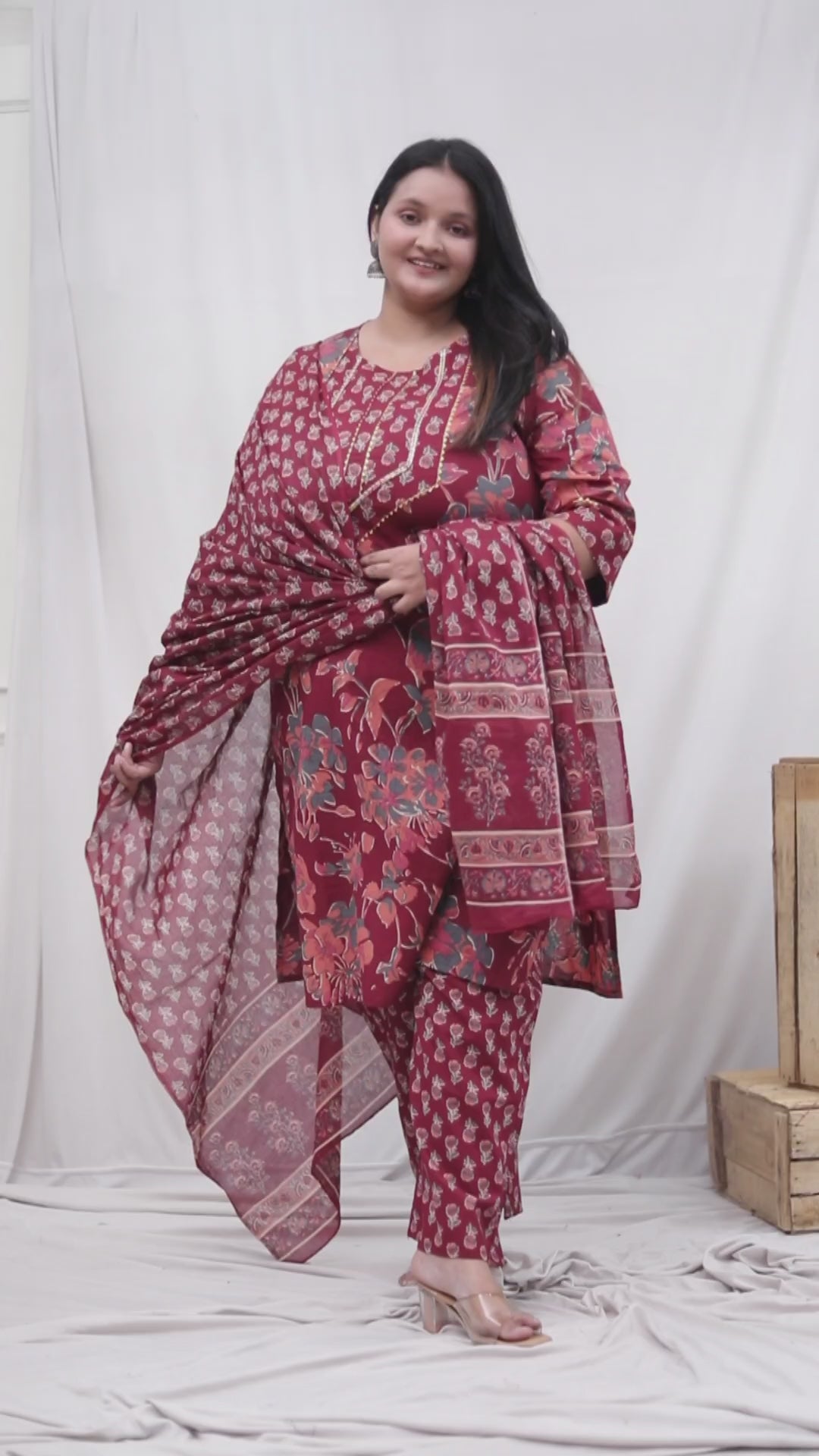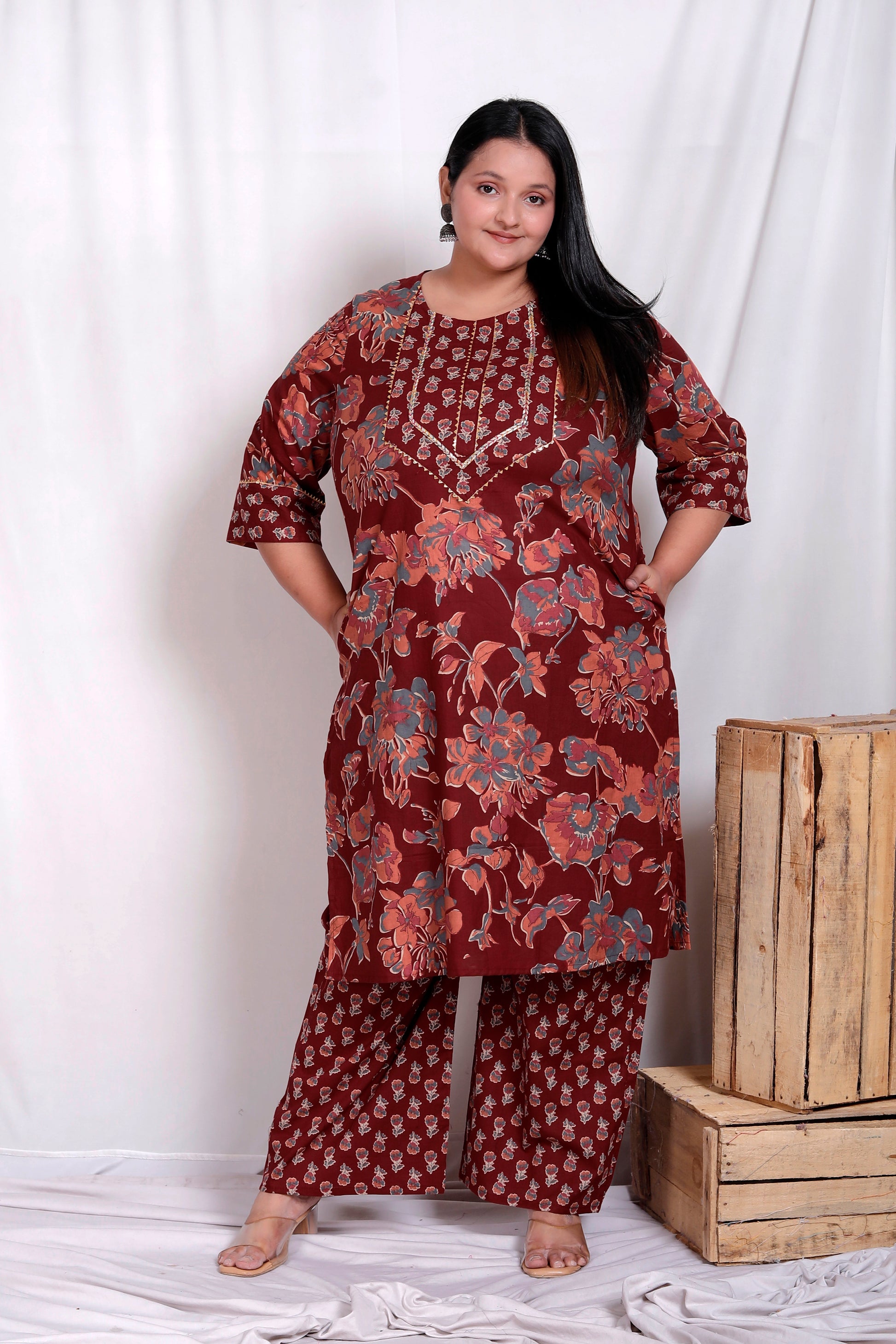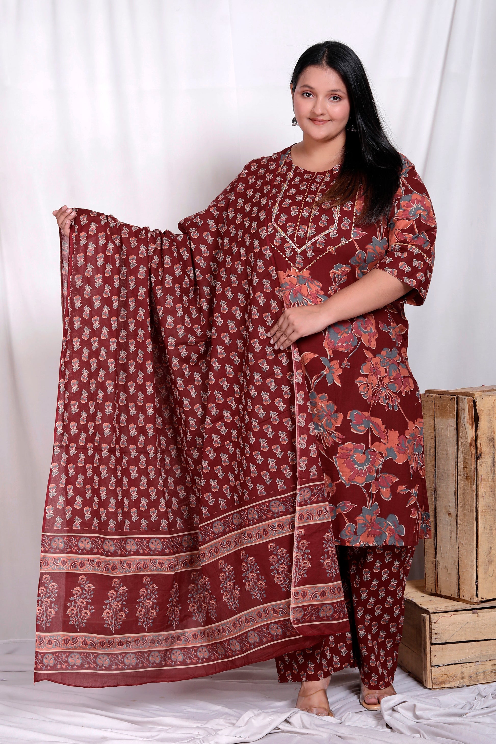 FLORAL BUTI PRINT COTTON 3 PEICE KURTA PLAZZO IN MAHROON BY PLUSSIZEKURTI