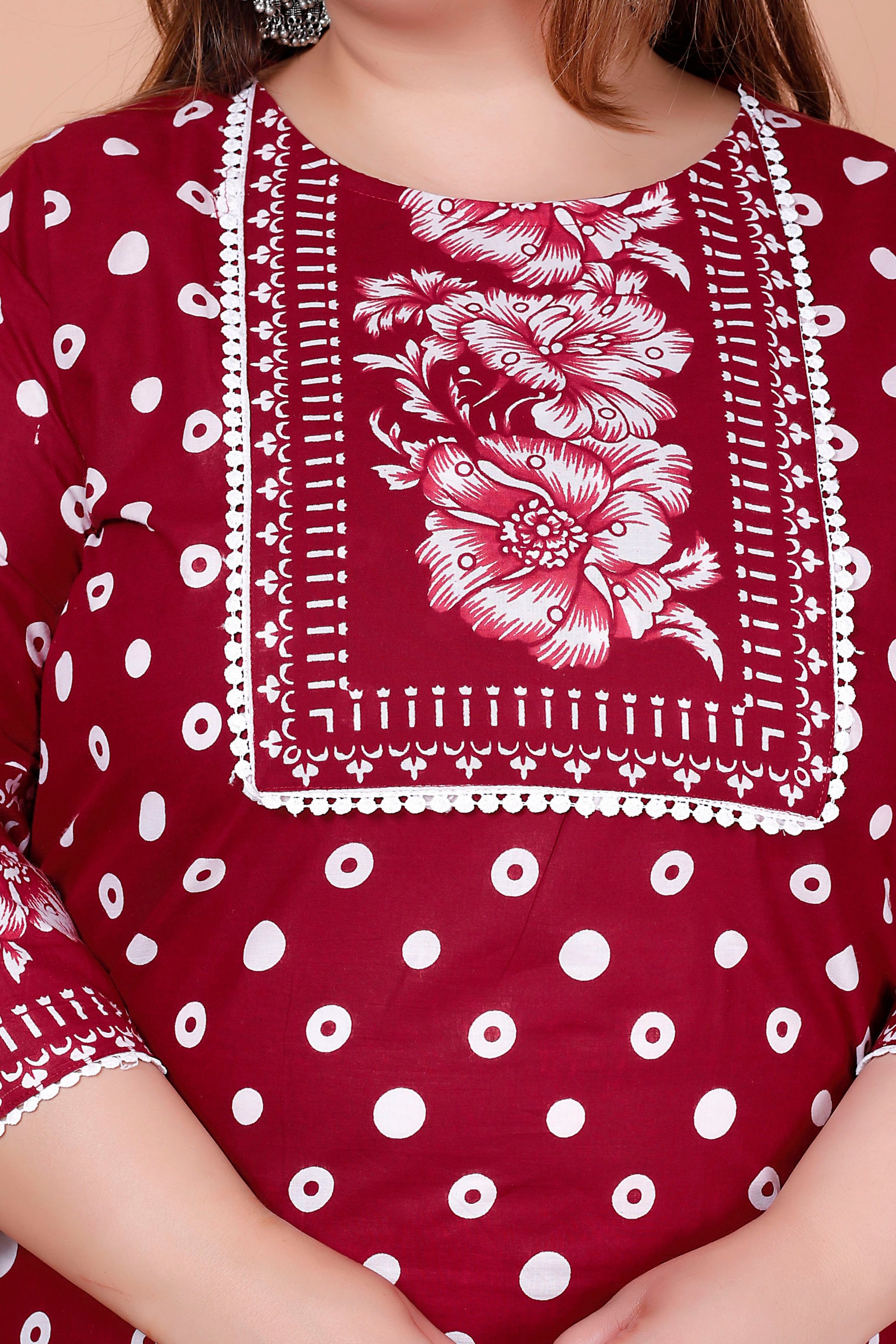 POLKA DOT FLORAL PRINT COTTON 3 PEICE KURTA PANT IN RED BY PLUSSIZEKURTI