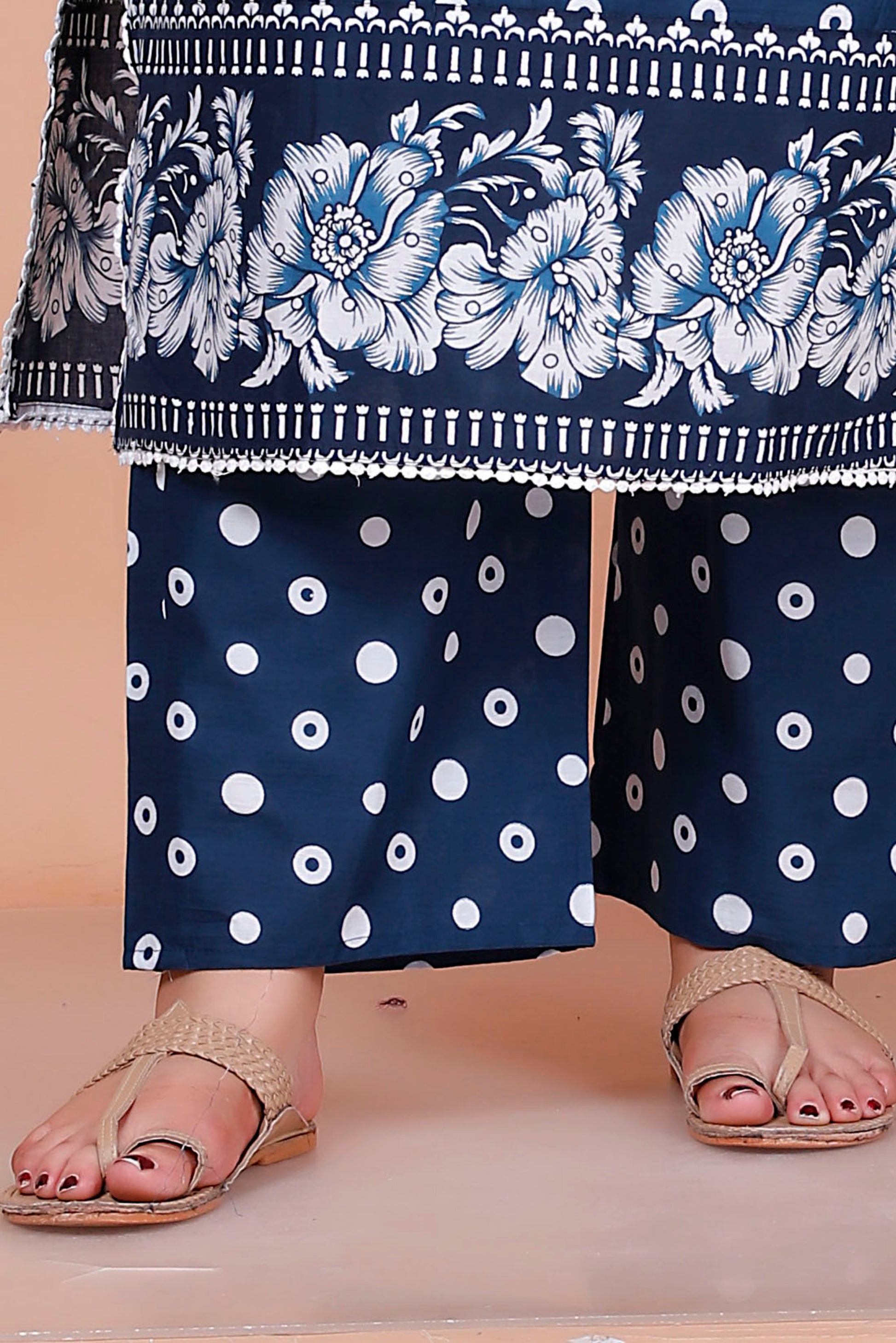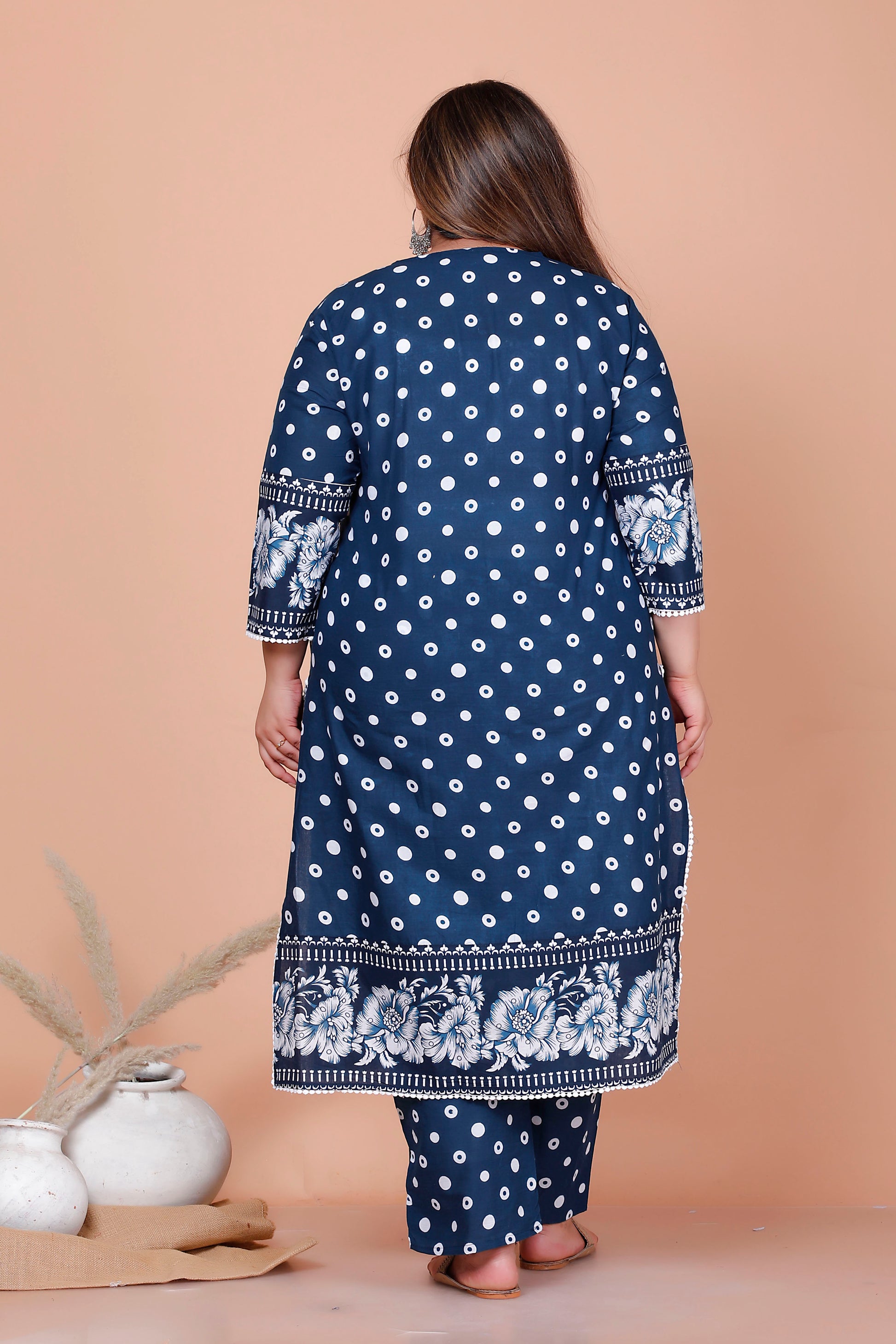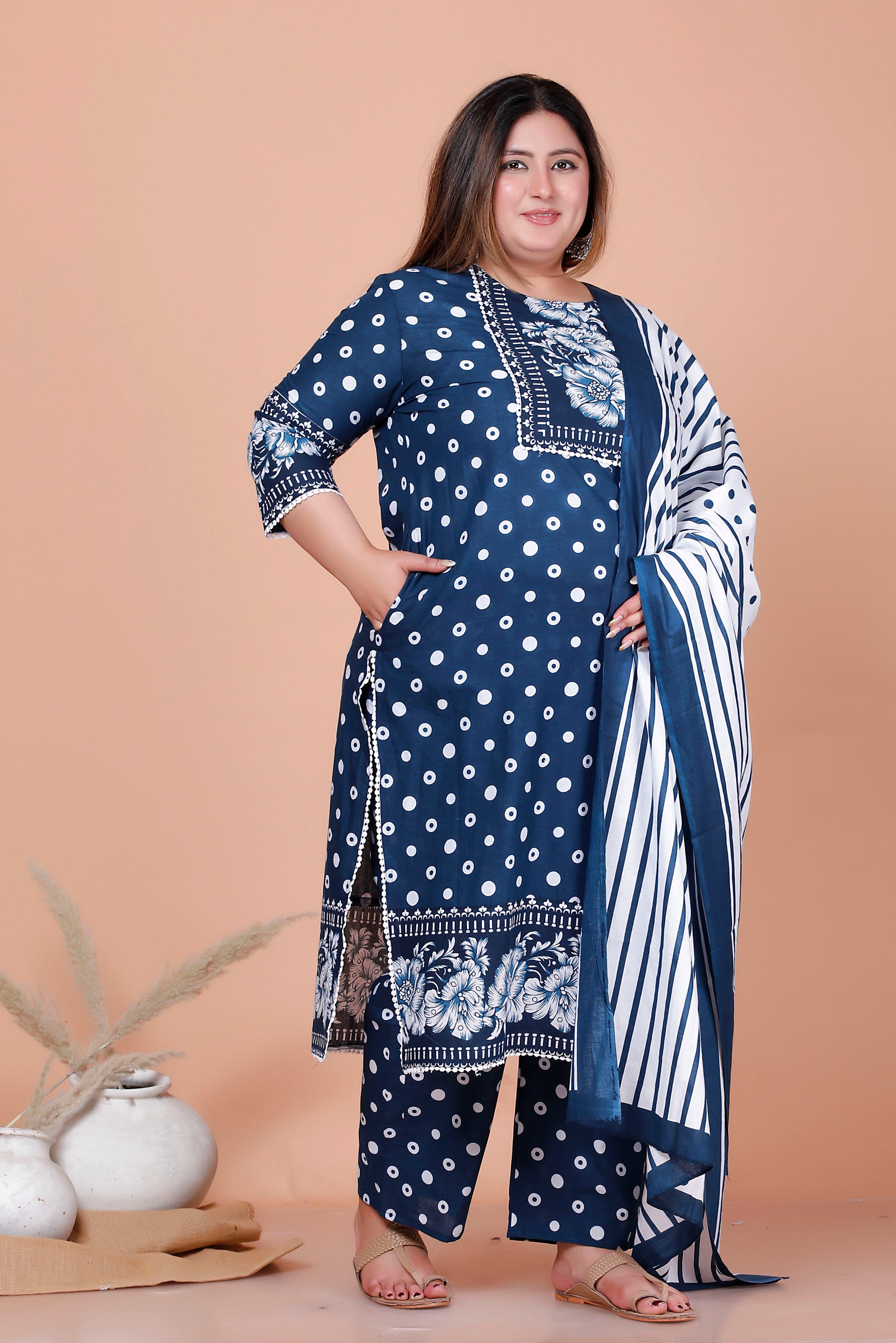 POLKA DOT FLORAL PRINT COTTON 3 PEICE KURTA PANT IN BLUE BY PLUSSIZEKURTI