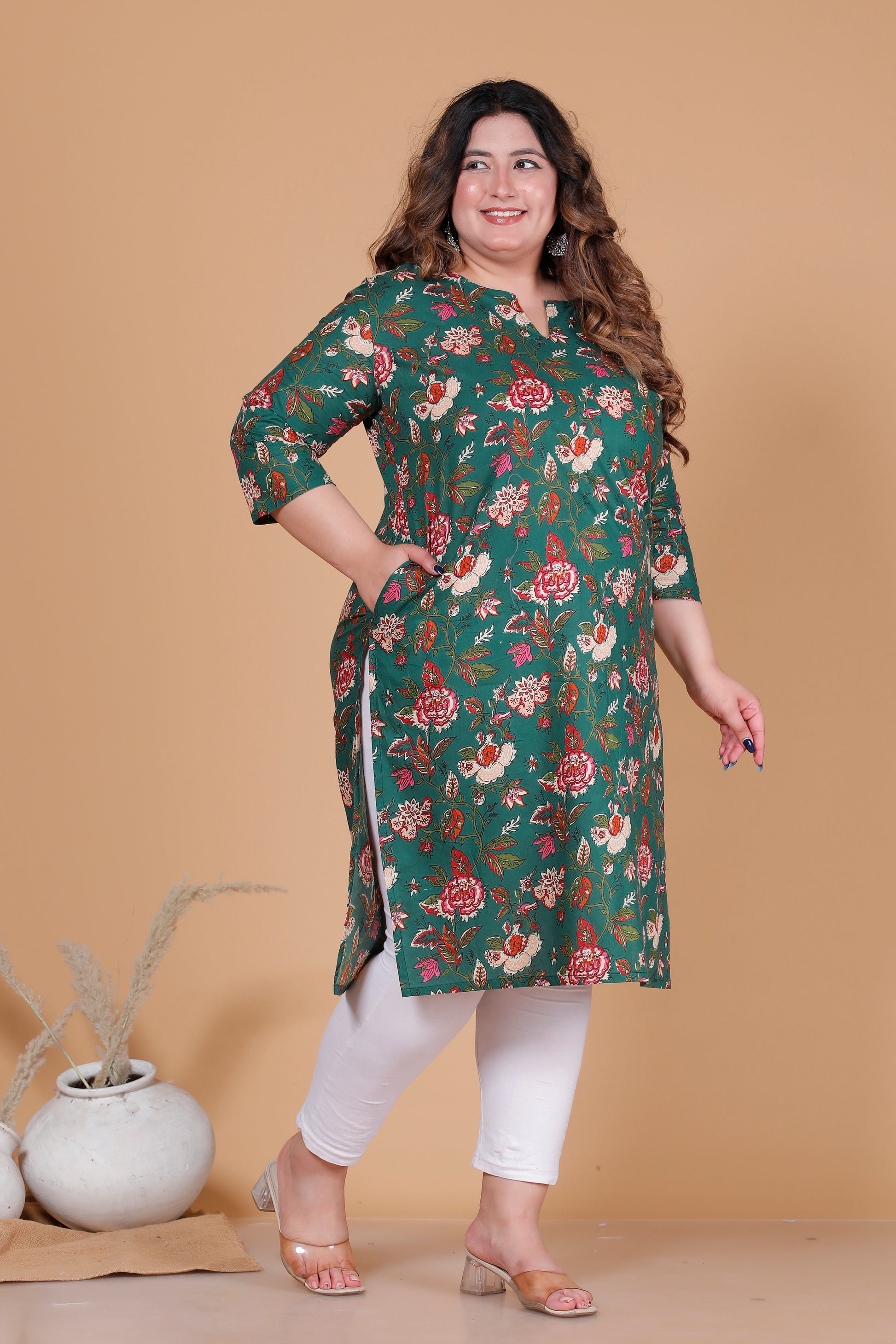 FLORAL VINE PRINT COTTON KURTI IN DEEP GREEN BY PLUSSIZEKURTI