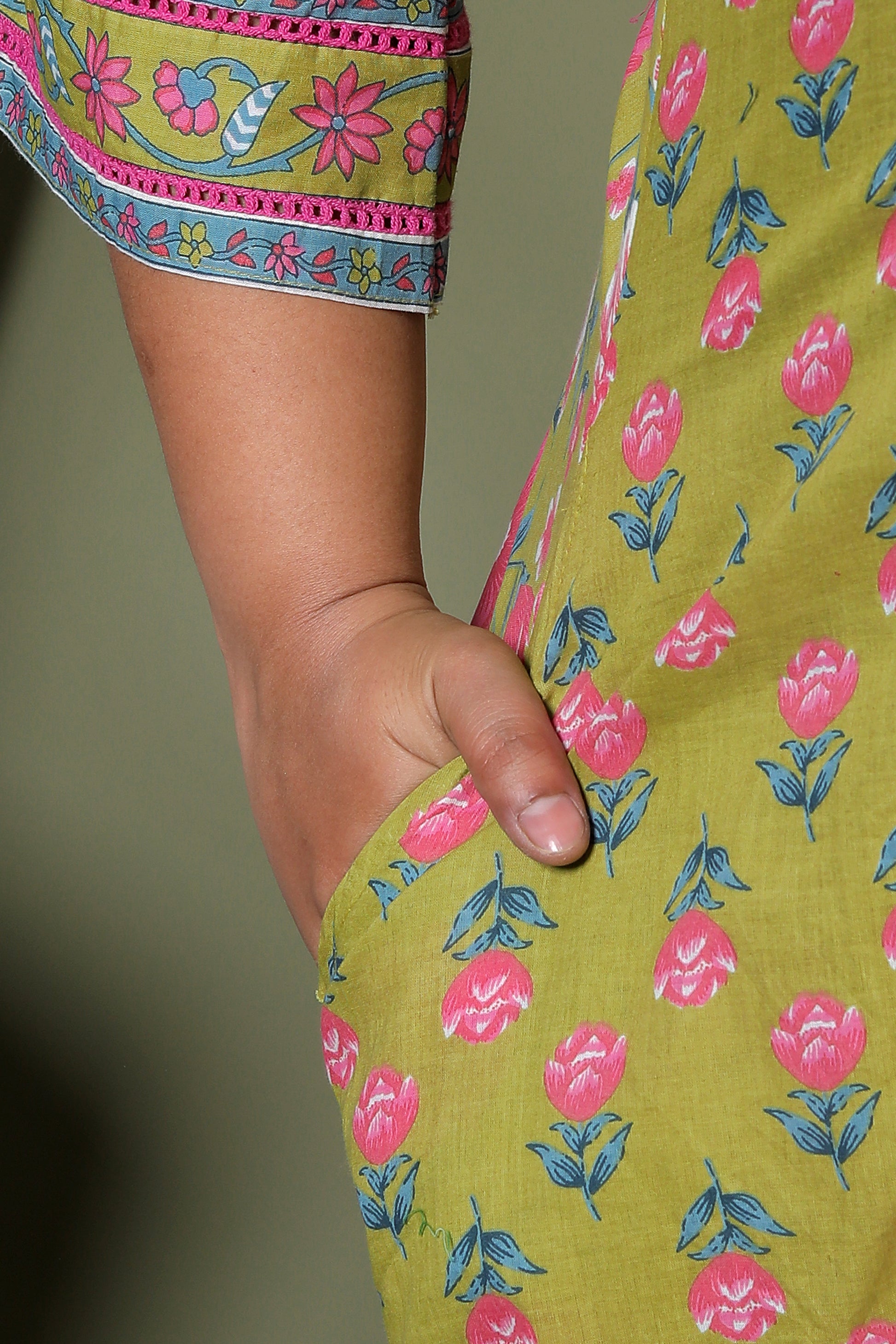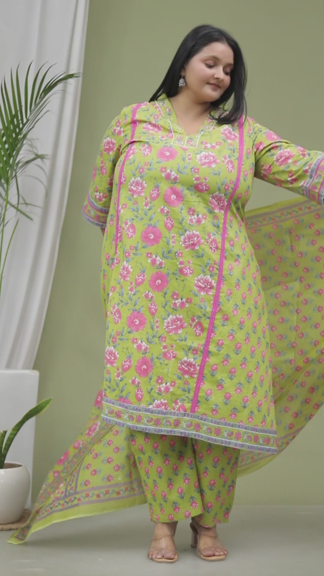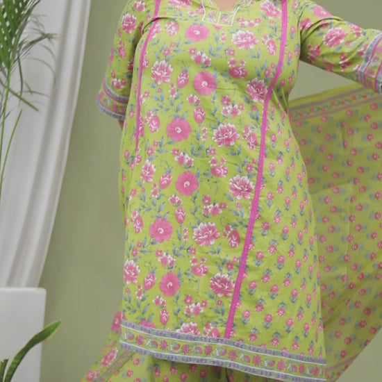 FLORAL PRINT HANDWORK COTTON 3 PEICE KURTA PLAZZO IN FRESH GREEN BY PLUSSIZEKURTI