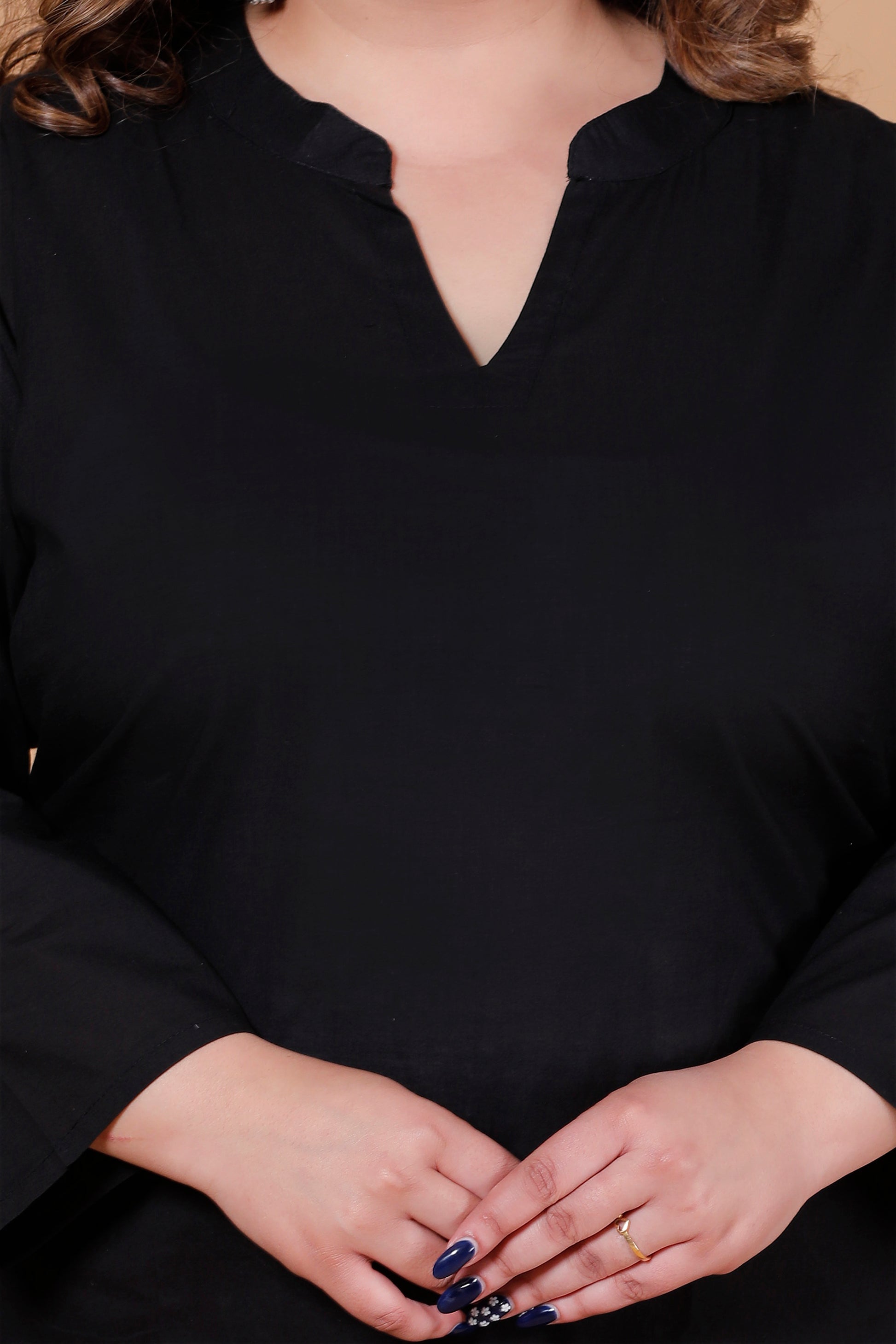 Style: Solid black kurti with a clean, minimal look