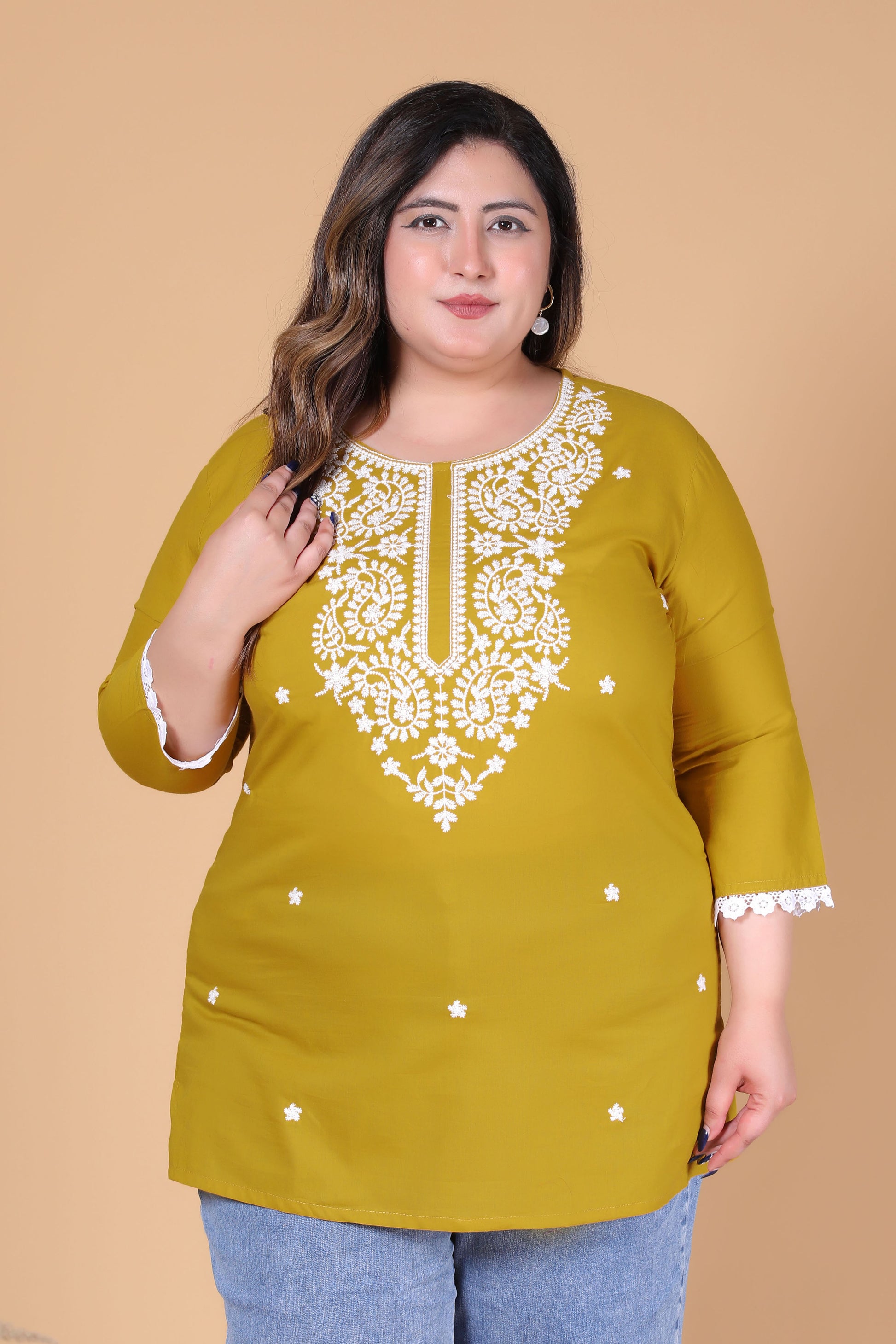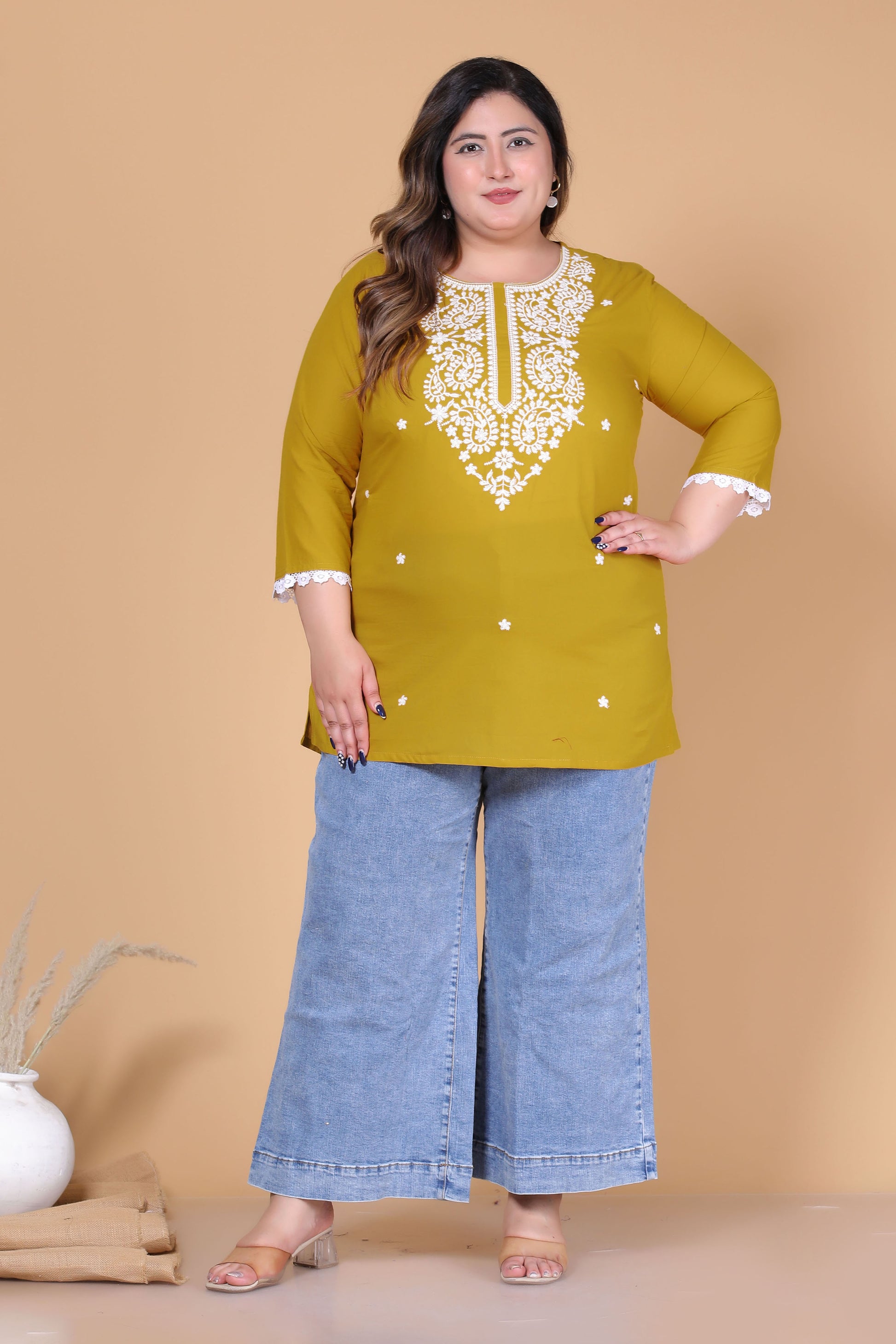 SOLID CHIKANKARI COTTON TOP IN MUSTARD COLOUR BY PLUSSIZEKURTI