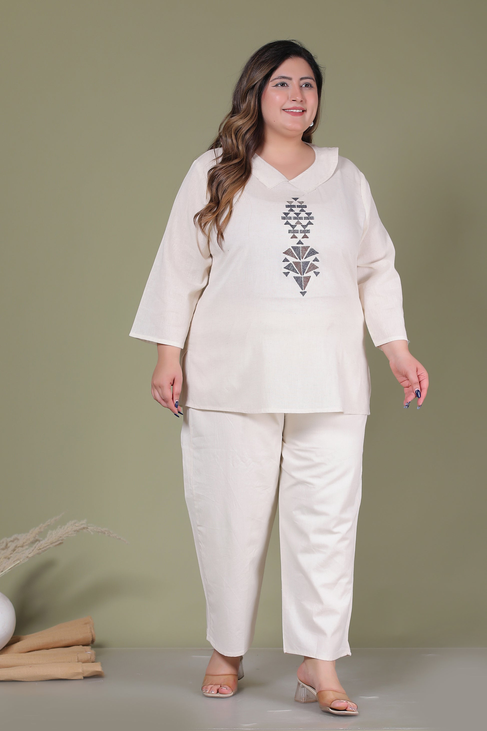 SOLID GEOMETRIC EMBROIDERY COTTON FLEX CO-ORD SET IN OFF WHITE BY PLUSSIZEKURTI
