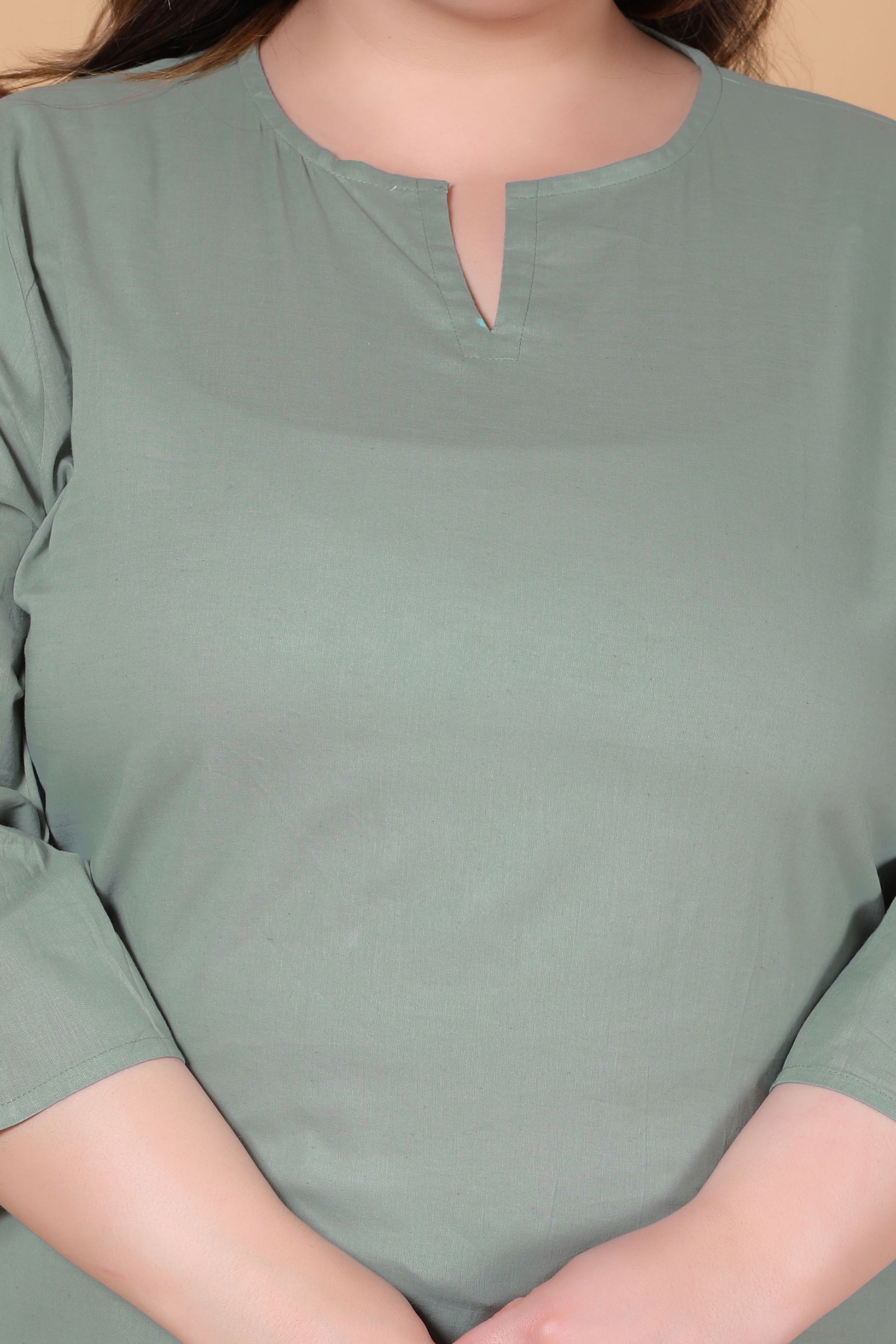 Top: Solid Sagegreen base, styled with a round neckline featuring a slit, 3/4 sleeves, length – 31
