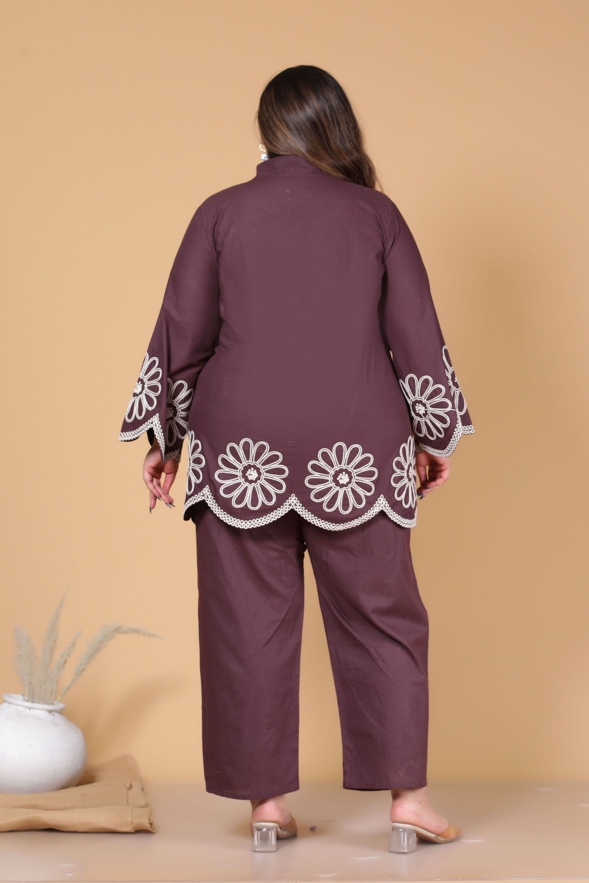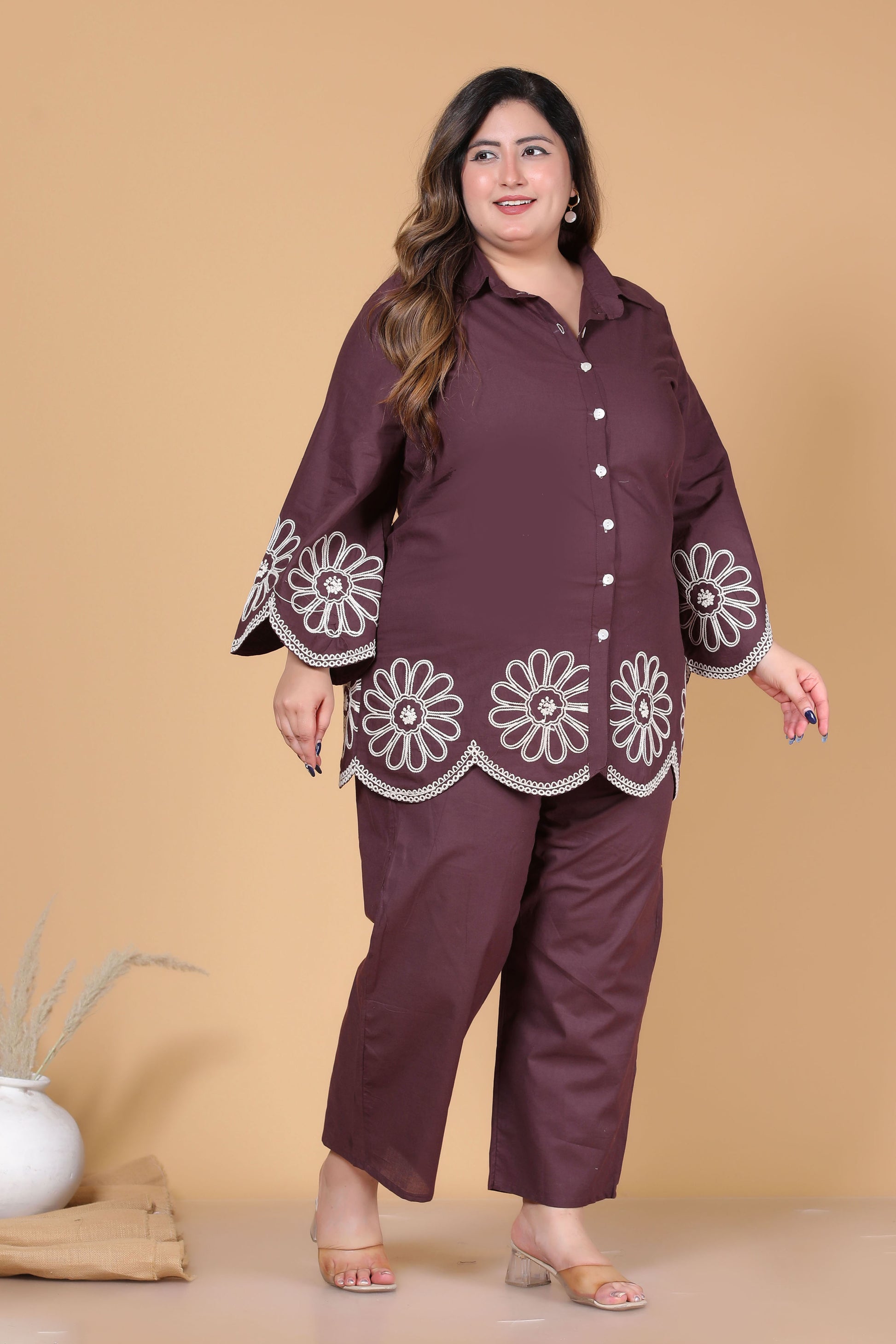 SOLID FLORAL EMBROIDERY COTTON CO-ORD SET IN BROWN BY PLUSSIZEKURTI