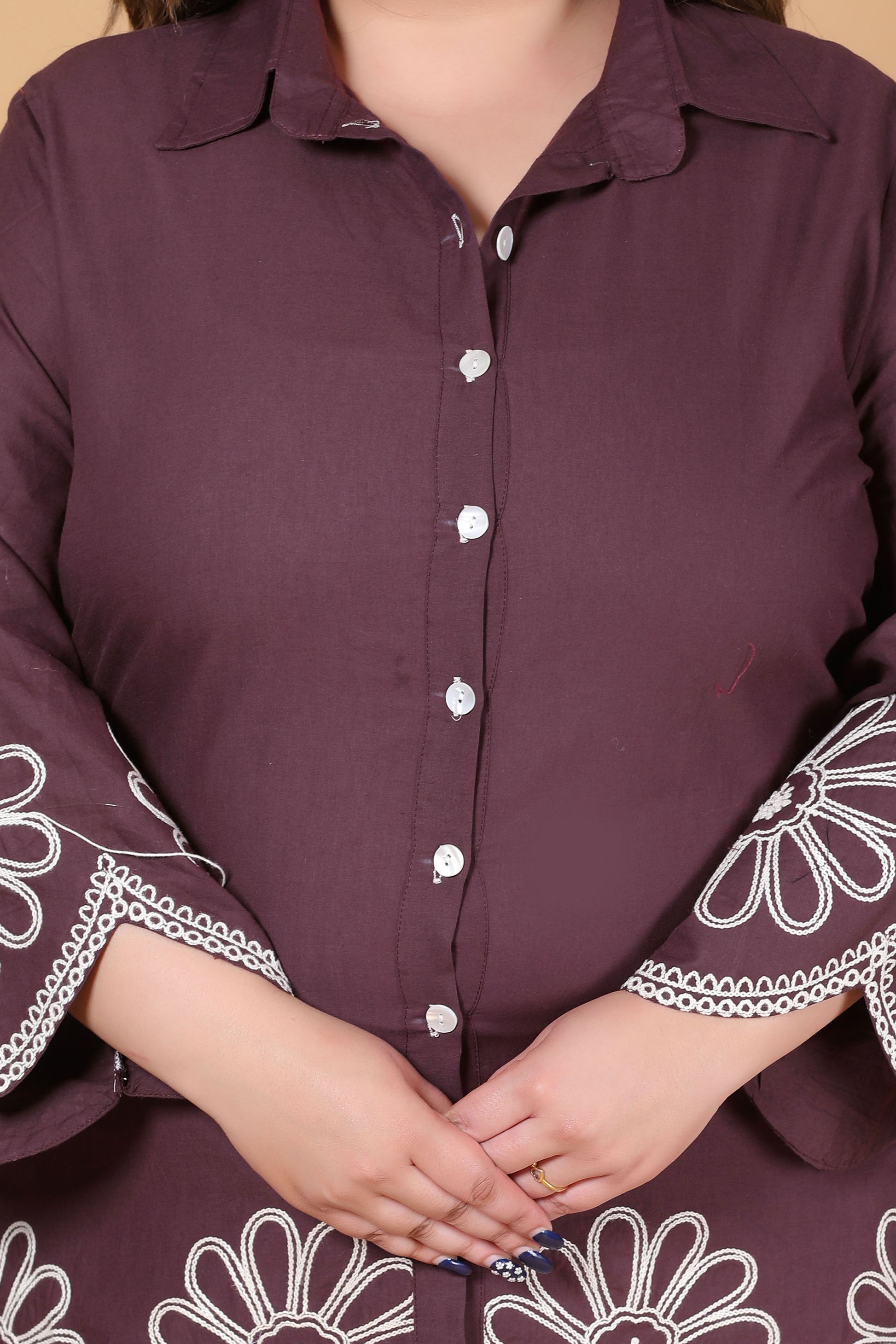 Step into effortless elegance with this cotton co-ord set, thoughtfully designed for all-day comfort and a flattering fit. Featuring delicate white floral embroidery on a solid brown base, this A-line shirt set blends modern tailoring with timeless charm—perfect for everyday wear, office styling, or casual outings.